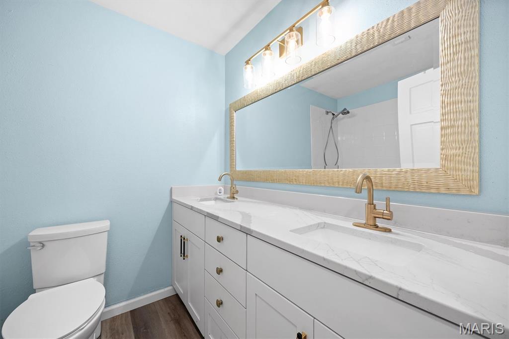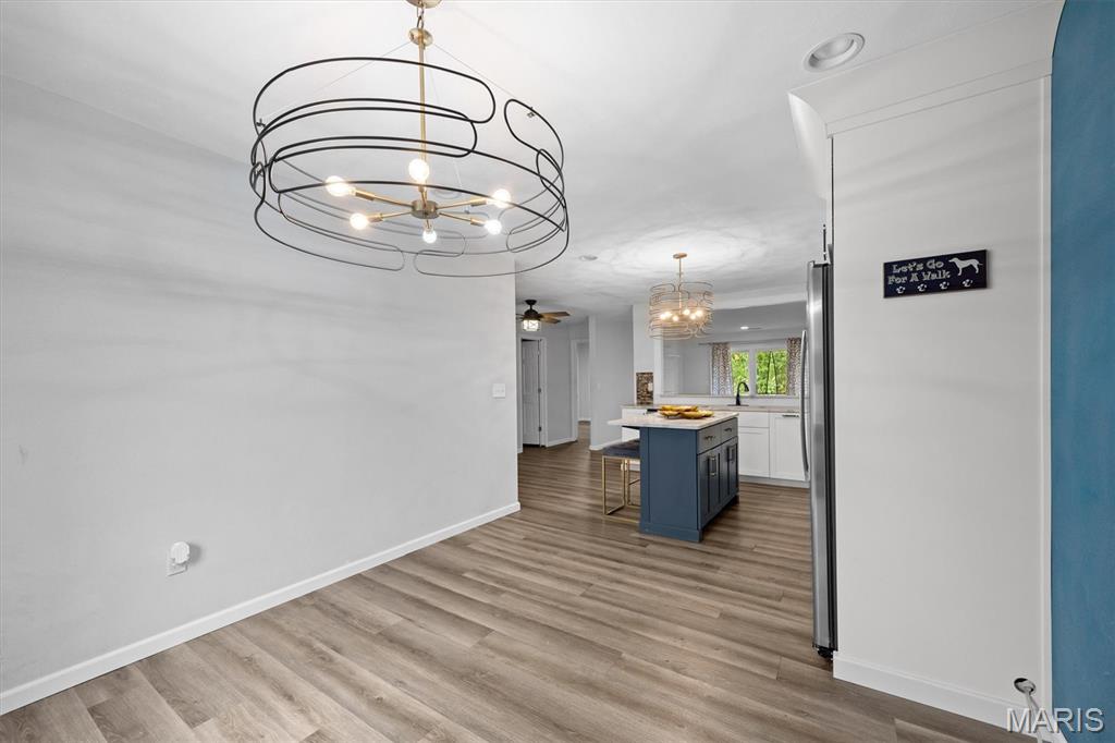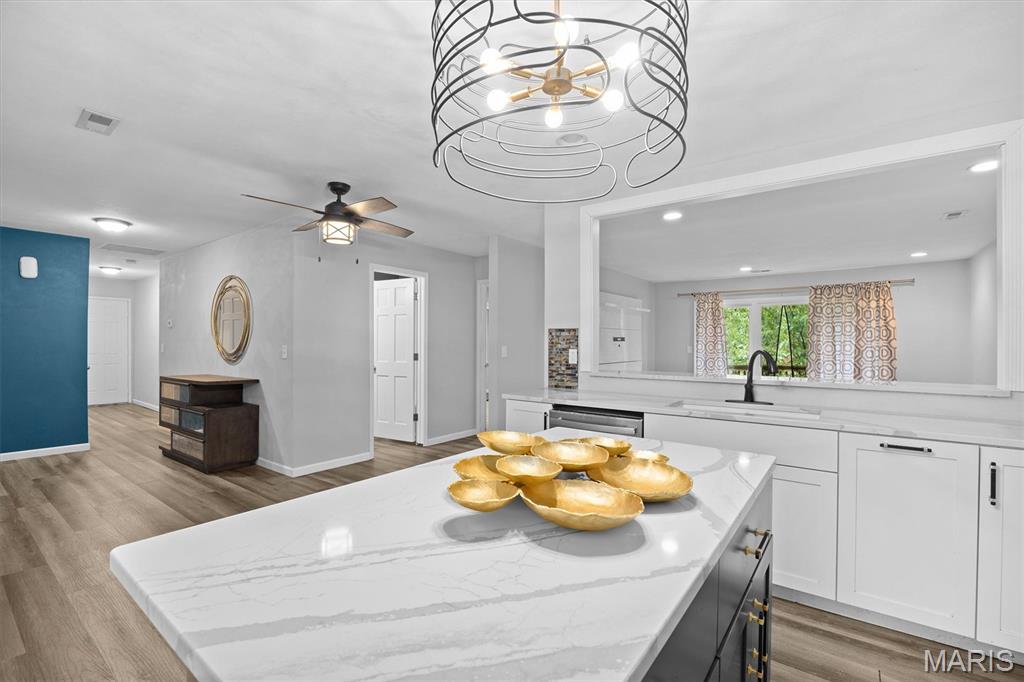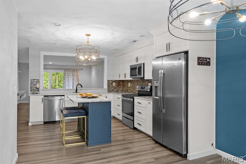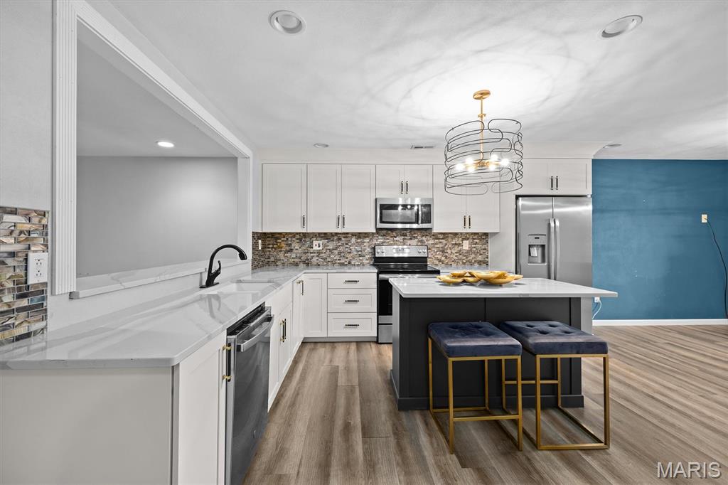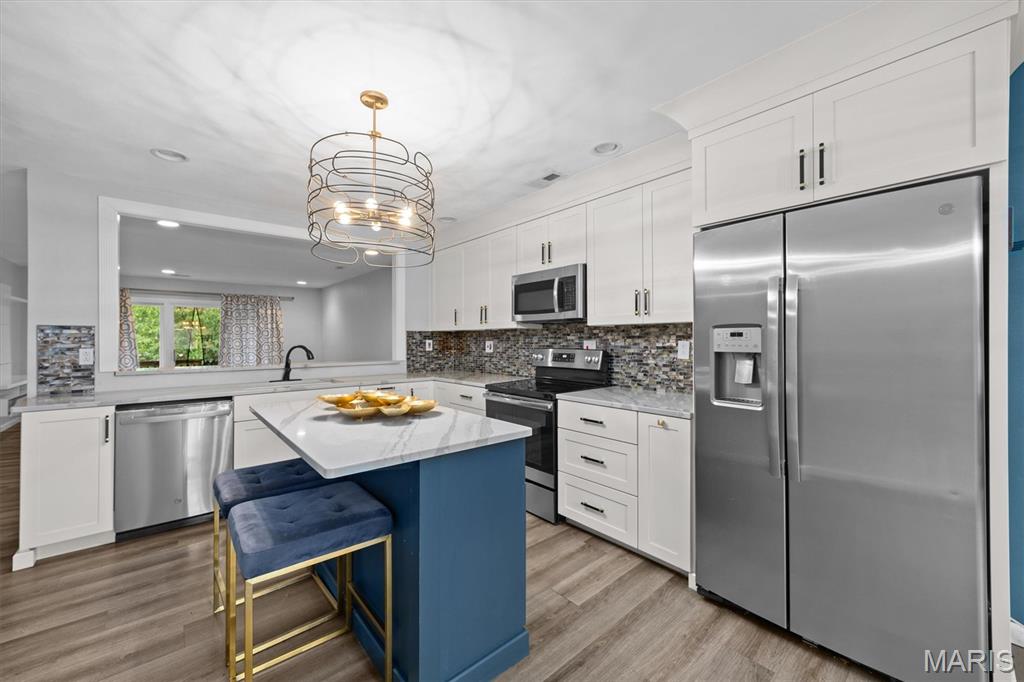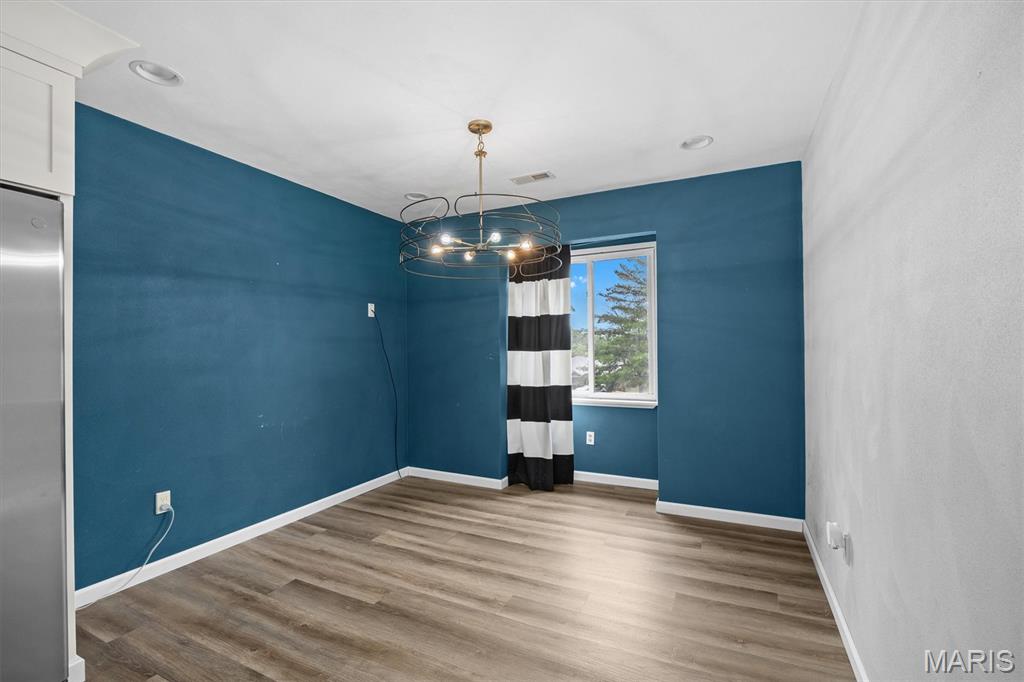 Step into this impressive, top-floor, 3-bedroom condo! You'll notice the vinyl wood flooring flows throughout and perfectly complement the kitchen. The kitchen features, white cabinetry, quartz countertops, a breakfast bar, unique light fixtures, stainless steel appliances and a center island for another gathering spot. The primary bedroom comes with a walk-in closet, a primary bathroom and a private balcony. The second bedroom offers its own unique charm with a wood-burning fireplace and two separate closets. Enjoy the convenience of an in-unit laundry area, your own garage space and elevator access that are all included with this condo. Home is being sold as is and home is up to code with an occupancy permit.