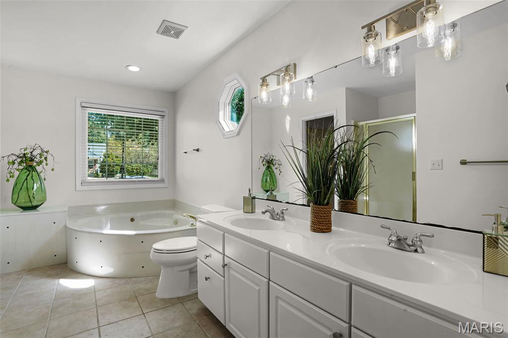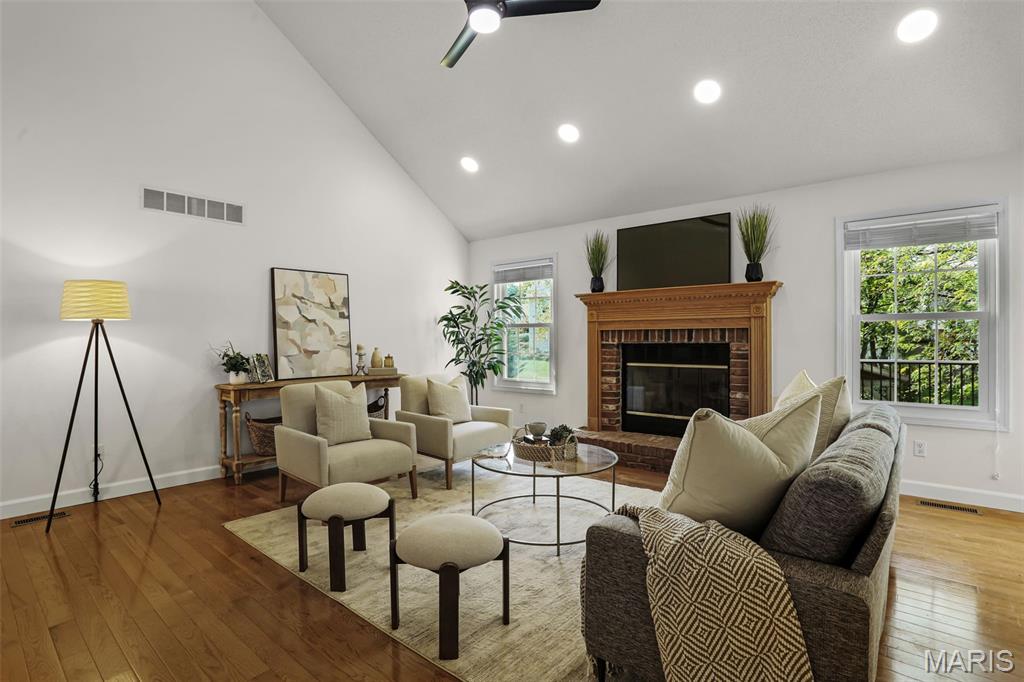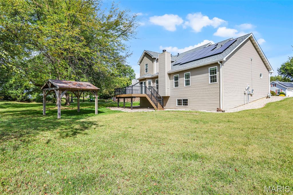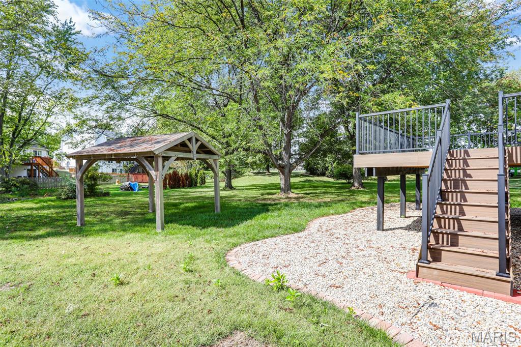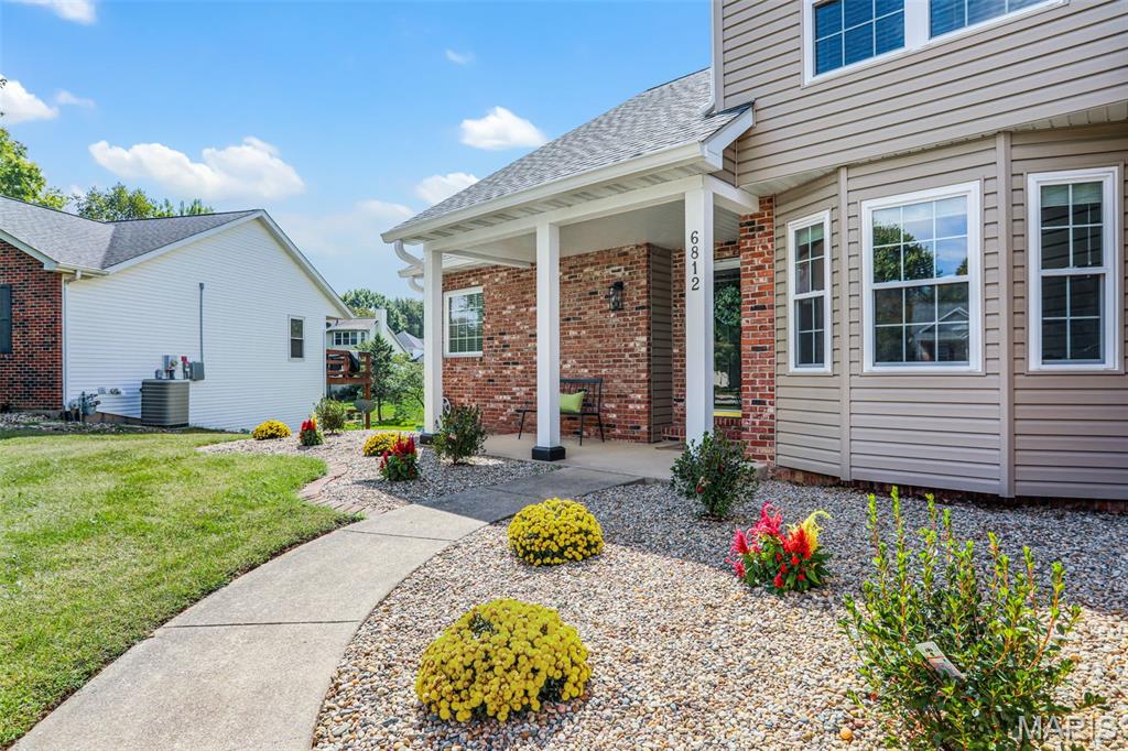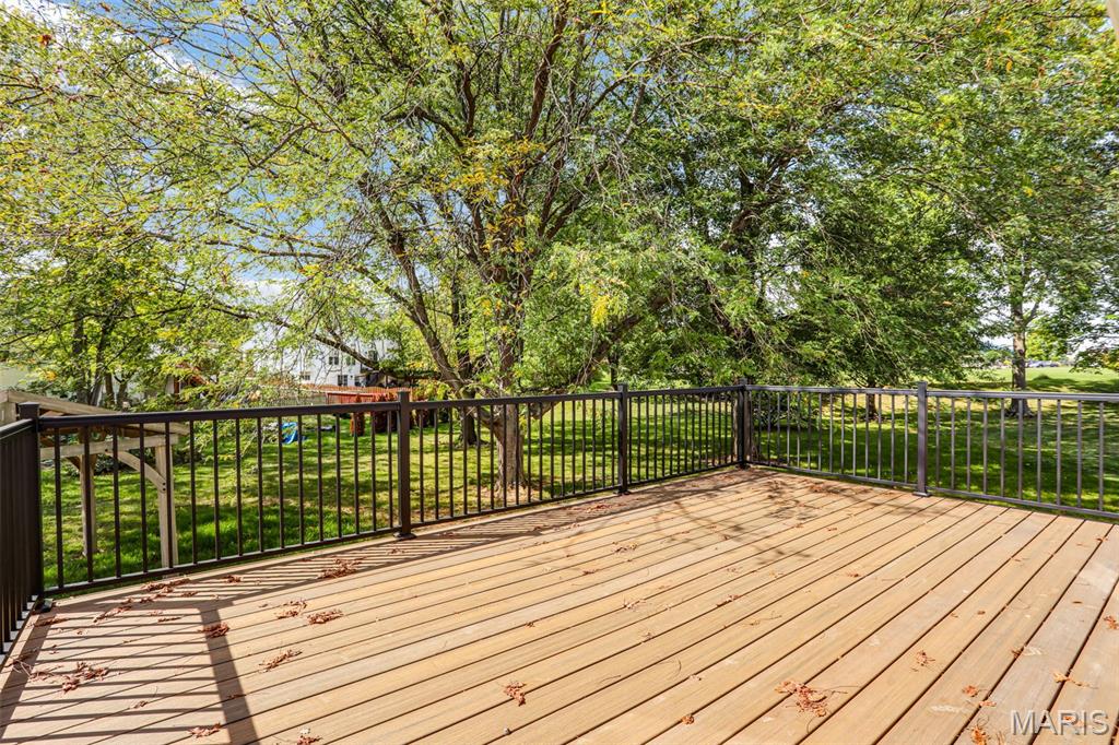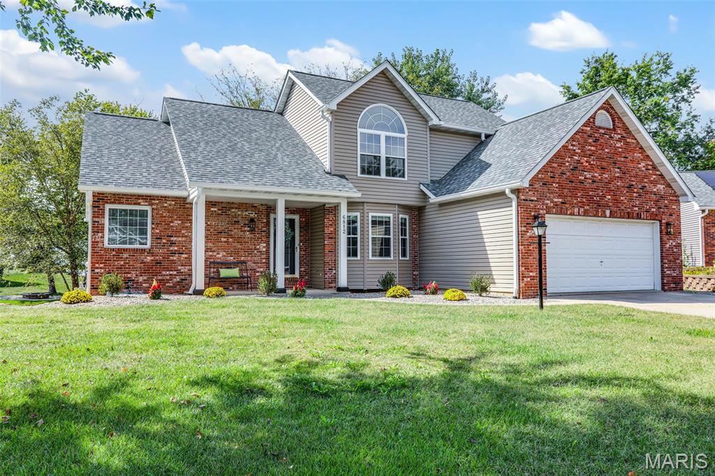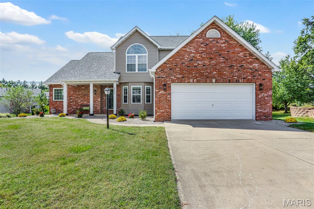 This beautifully updated home in the heart of Edwardsville shines with curb appeal, thanks to meticulous new landscaping. Step inside to a welcoming foyer with warm wood floors that flow into a spacious formal dining room accented with a tray ceiling. The soaring ceilings and sweeping open staircase set the tone in the living room, where a brick fireplace creates the perfect gathering spot. The living room opens to the eat-in kitchen, which boasts freshly painted white cabinets, abundant storage, a pantry, and access to the composite deck—ideal for entertaining or relaxing outdoors. A convenient laundry/drop zone just off the kitchen connects to the 2-car garage. The main-floor owner’s suite offers a gleaming ensuite retreat with dual sinks, an expansive vanity, a jetted tub, separate walk-in shower, and a generous walk-in closet. Upstairs, you’ll find three additional bedrooms and a full bath. The finished lower level is filled with natural light and versatile space for a rec room, games, or movie nights—complete with a fun alcove tucked under the stairs. A nonconforming 5th bedroom with walk-in closet makes an excellent home office, gym, or game/playroom. A full bath and plenty of storage round out the lower level. Step outside to enjoy the spacious yard with mature trees and a charming pergola perfect for gatherings. Located just a short walk to shopping and dining, this wonderful neighborhood features wide streets and beautifully maintained homes.
