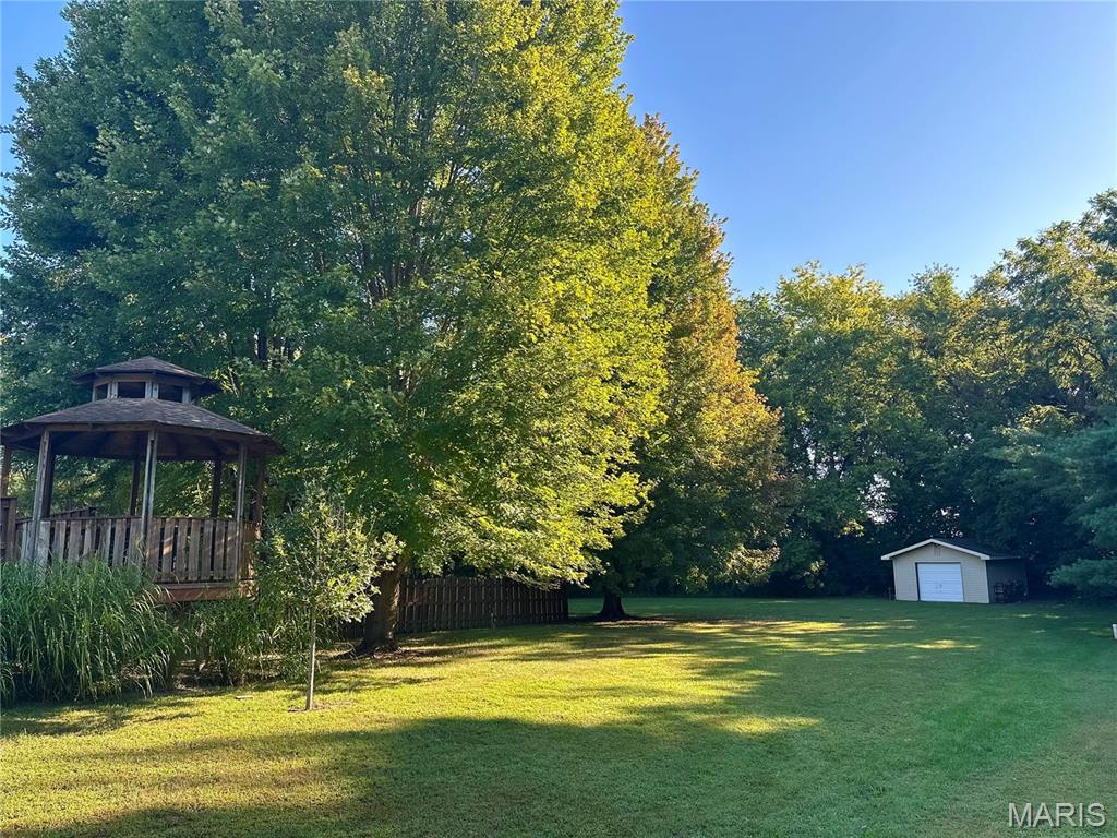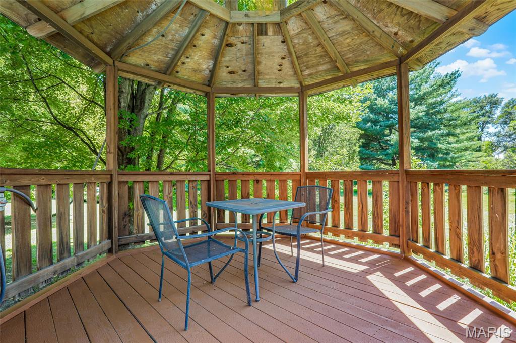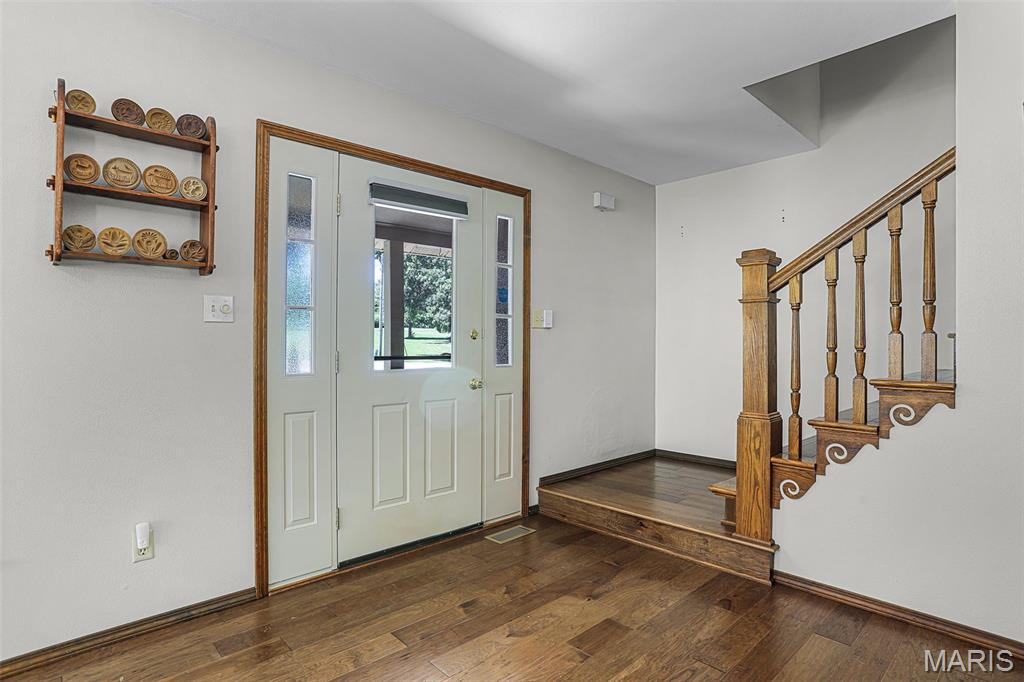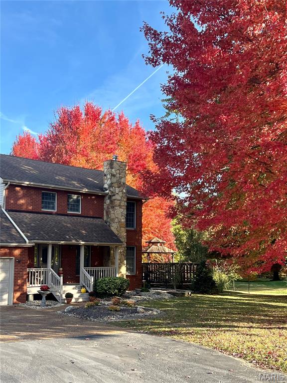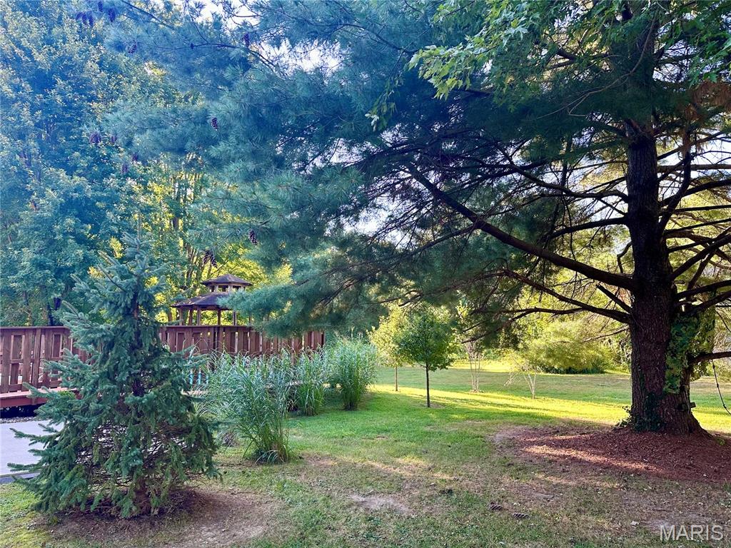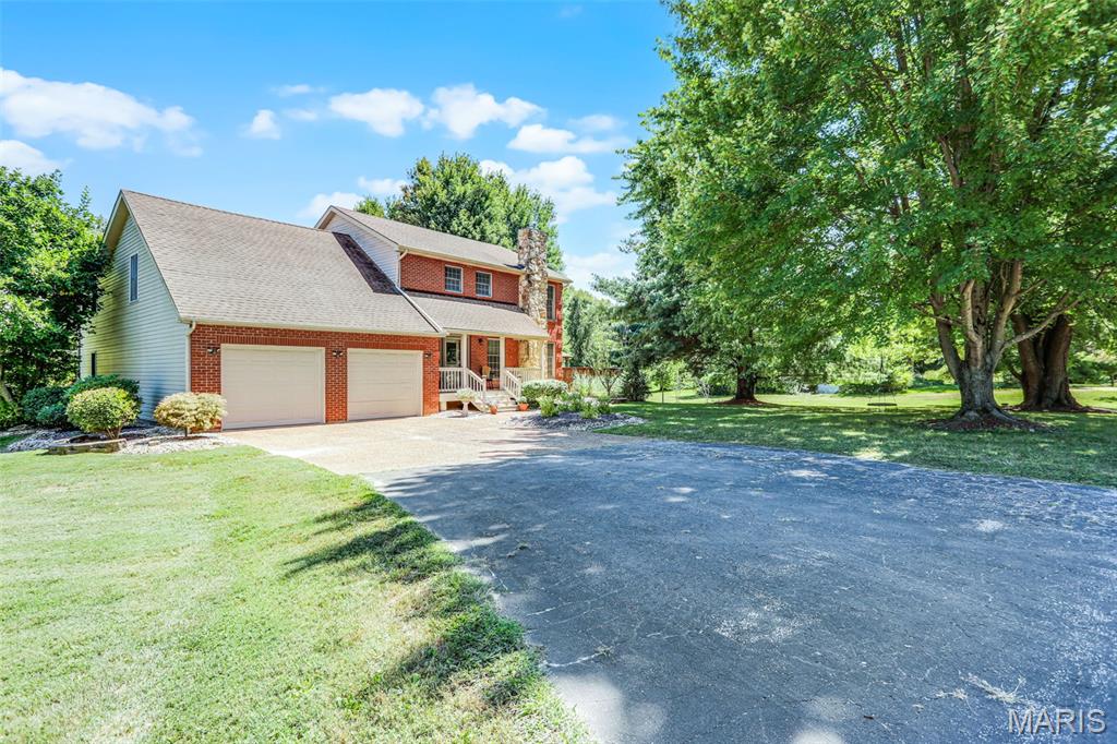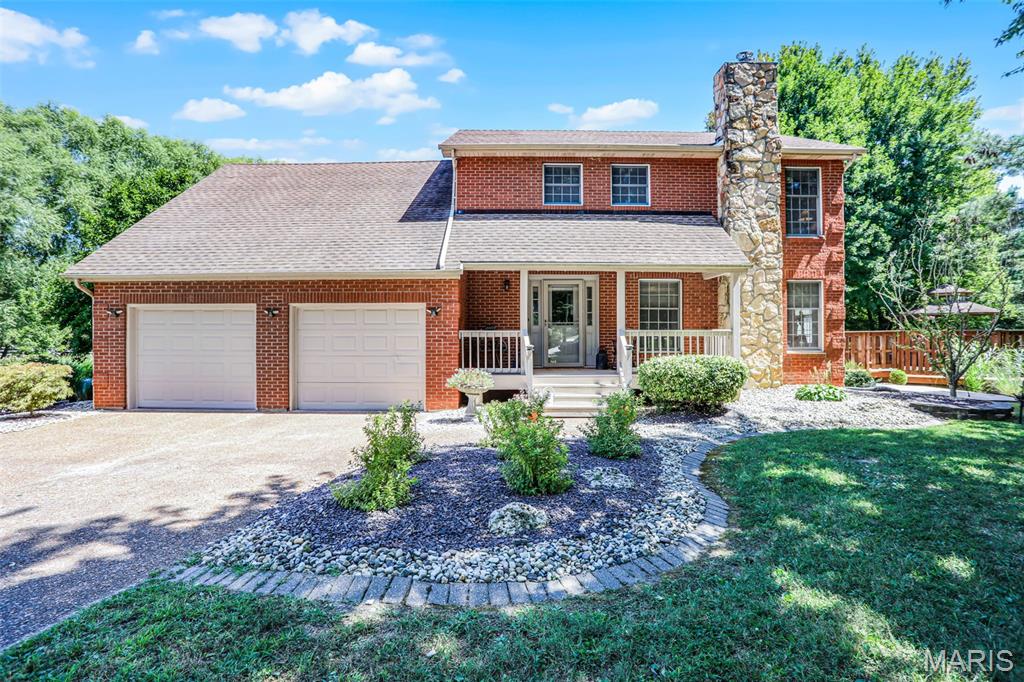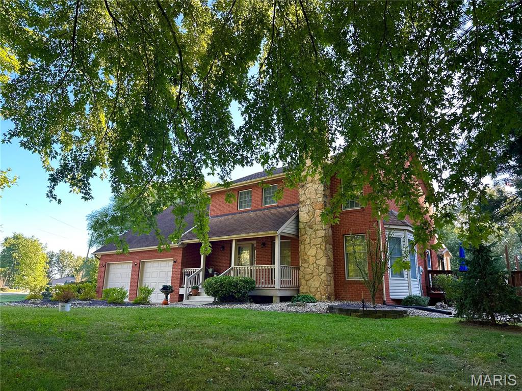 Spacious and beautifully maintained 5 BR, 3.5 BA two story home on 1.68 acres minutes from downtown Edwardsville, IL! This move in ready home features a main floor living room w/ woodburning fireplace opening to a separate dining room. Updated hardwood floors throughtout the main level, stairs and upstairs hallway. A newly updated kitchen featuring quartz countertops, ample cabinet space, tile backsplash and updated stainless steel appliances. Enjoy natural light year round in the bright and airy sunroom which provides additional dining or living space. Behind the two car oversized garage, you'll find a bonus room perfect for a home gym, playroom or hobby space. Upstairs, 5 generously sized bedrooms and 3 full baths offer an abundance of room for family, guests or office spaces. The large master BR suite features a full bath w/ walk in shower, whirlpool tub and double vanity. The upper level boasts a huge bonus room w/ electric fireplace- ideal as a teen lounge/media room. The lower level includes finished space for a home office, an add'l workshop area and plenty of storage. New sump pump-2023. Step outside to an above ground pool, freshly stained two level deck, charming gazebo and shed. The partially fenced yard was recently landscaped with trees and shrubs and offers a peaceful, park like private setting with plenty of room to garden, play or entertain. Located in the Eville School District minutes from SIUE and interstates. Country living with all the convenience!