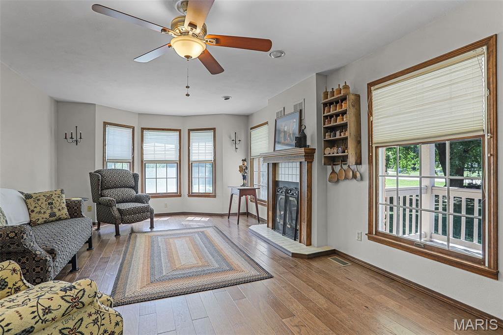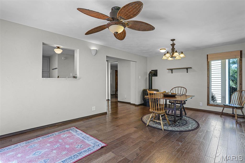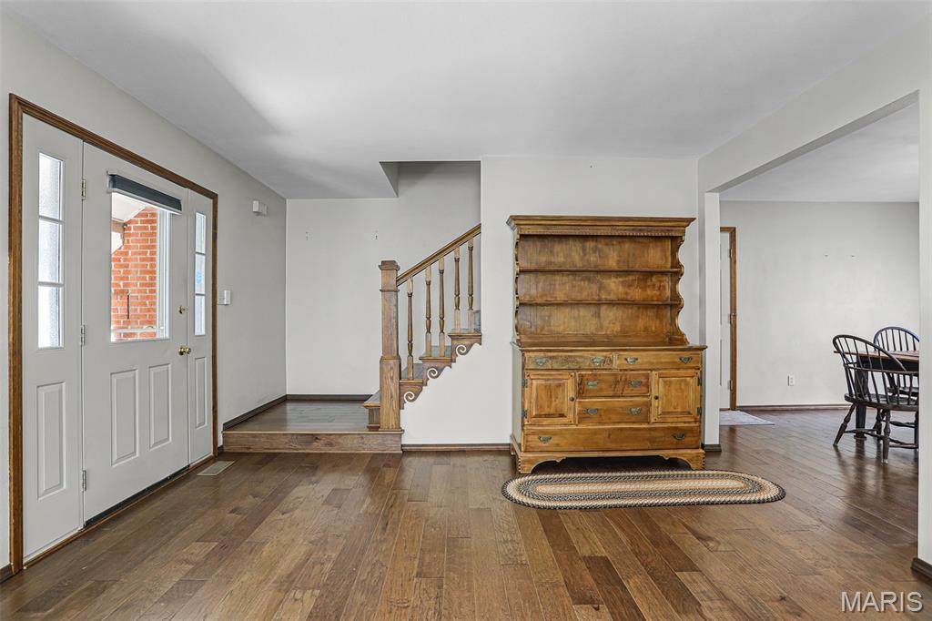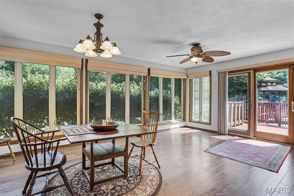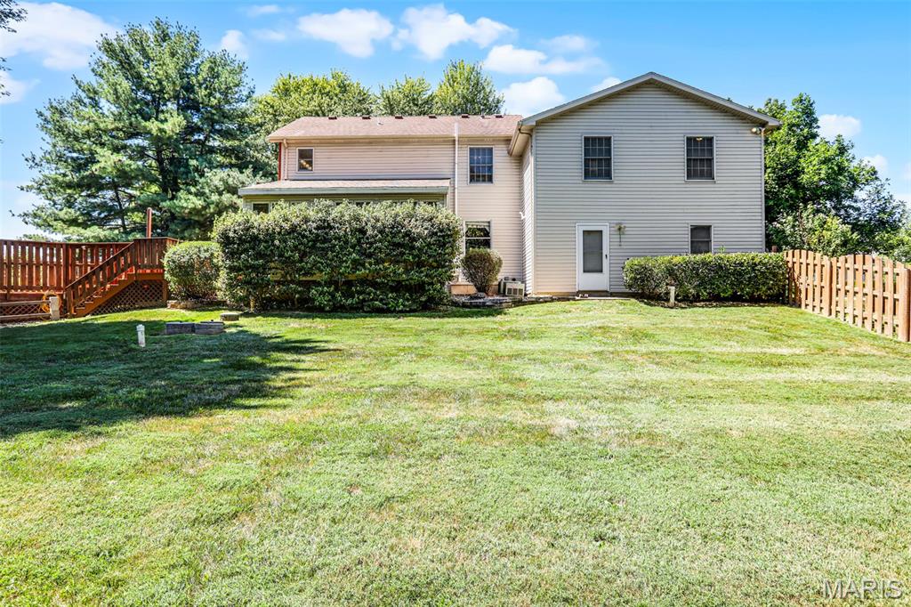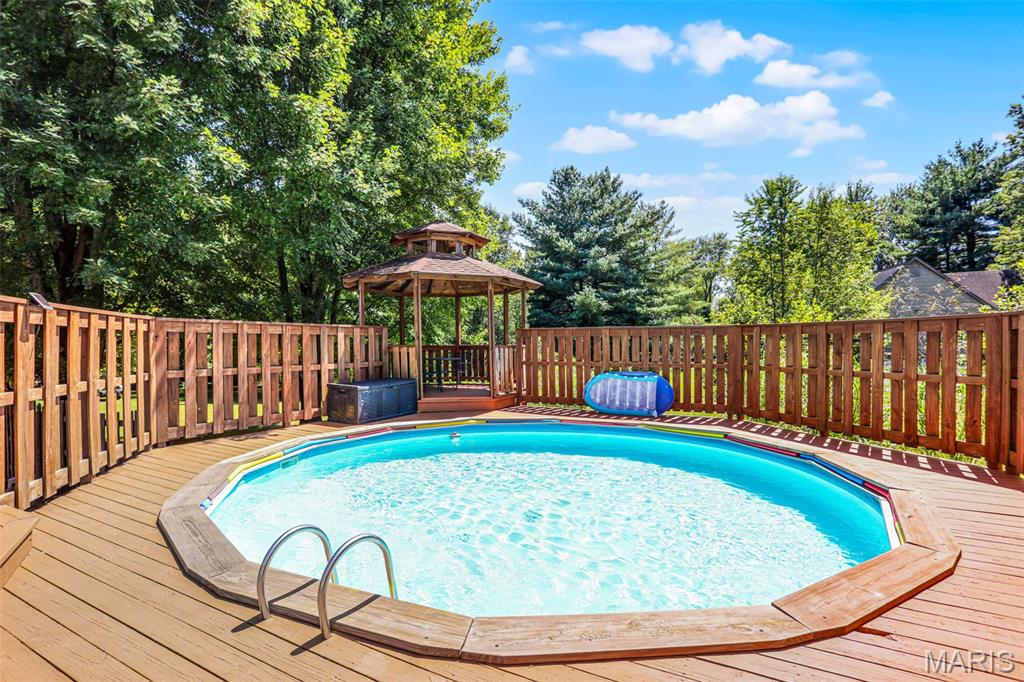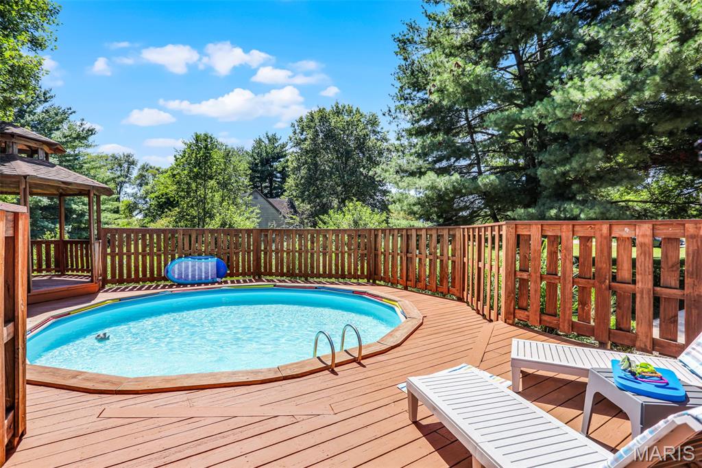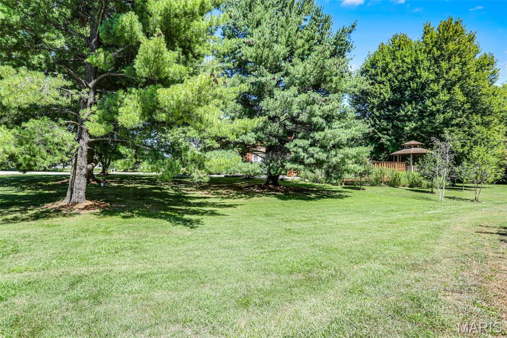 Spacious and beautifully maintained 5 BR, 3.5 BA two story home on 1.68 acres minutes from downtown Edwardsville, IL! This move in ready home features a main floor living room w/ woodburning fireplace opening to a separate dining room. Updated hardwood floors throughtout the main level, stairs and upstairs hallway. A newly updated kitchen featuring quartz countertops, ample cabinet space, tile backsplash and updated stainless steel appliances. Enjoy natural light year round in the bright and airy sunroom which provides additional dining or living space. Behind the two car oversized garage, you'll find a bonus room perfect for a home gym, playroom or hobby space. Upstairs, 5 generously sized bedrooms and 3 full baths offer an abundance of room for family, guests or office spaces. The large master BR suite features a full bath w/ walk in shower, whirlpool tub and double vanity. The upper level boasts a huge bonus room w/ electric fireplace- ideal as a teen lounge/media room. The lower level includes finished space for a home office, an add'l workshop area and plenty of storage. New sump pump-2023. Step outside to an above ground pool, freshly stained two level deck, charming gazebo and shed. The partially fenced yard was recently landscaped with trees and shrubs and offers a peaceful, park like private setting with plenty of room to garden, play or entertain. Located in the Eville School District minutes from SIUE and interstates. Country living with all the convenience!