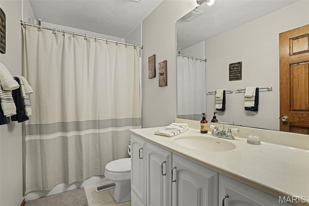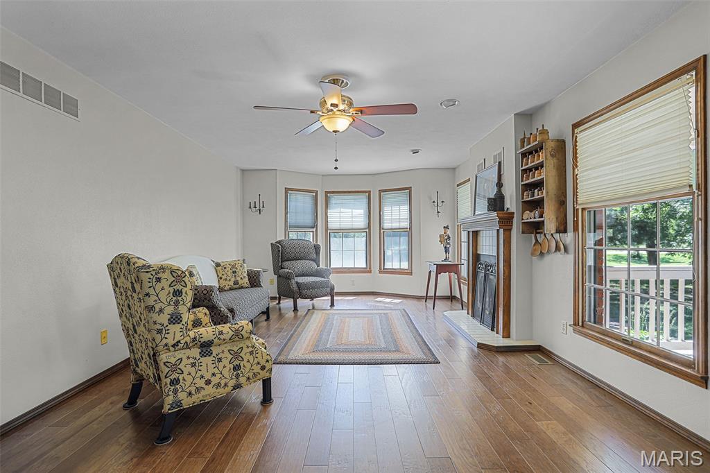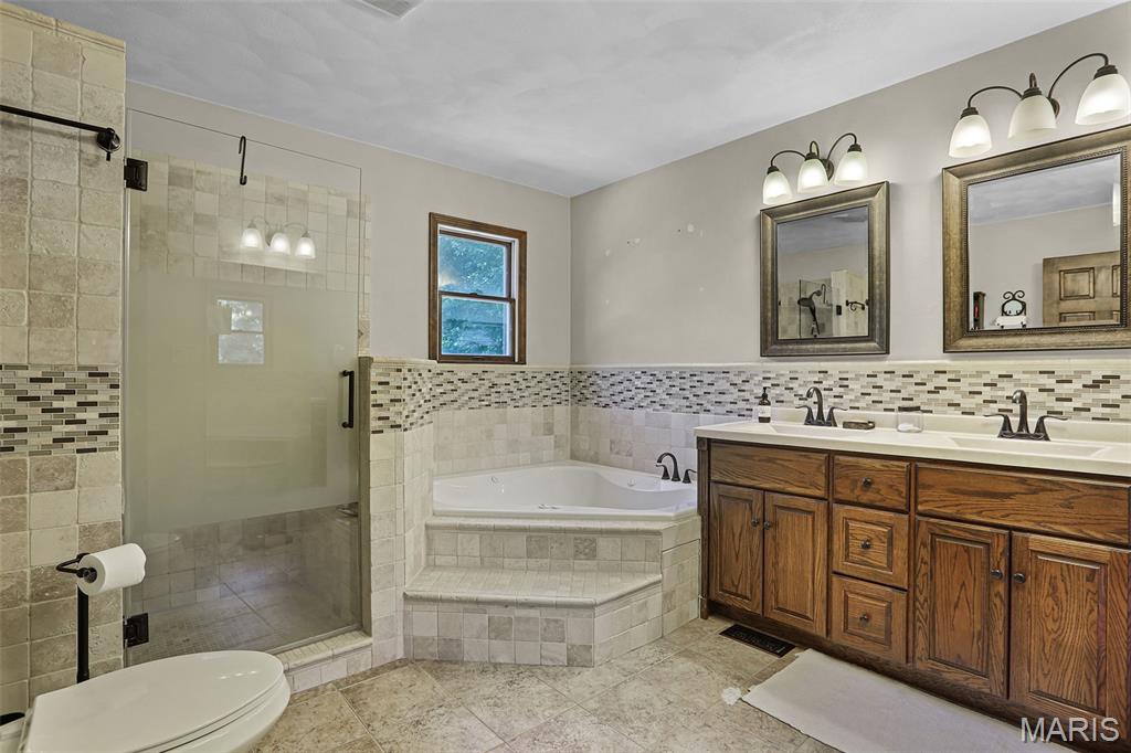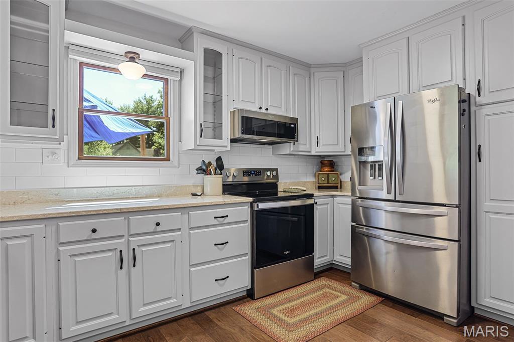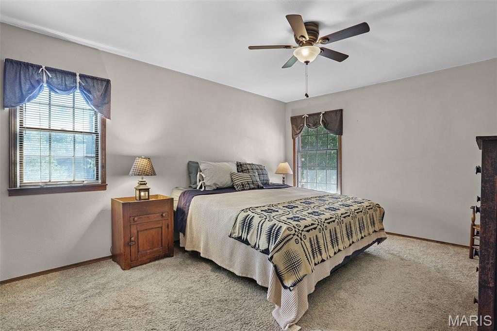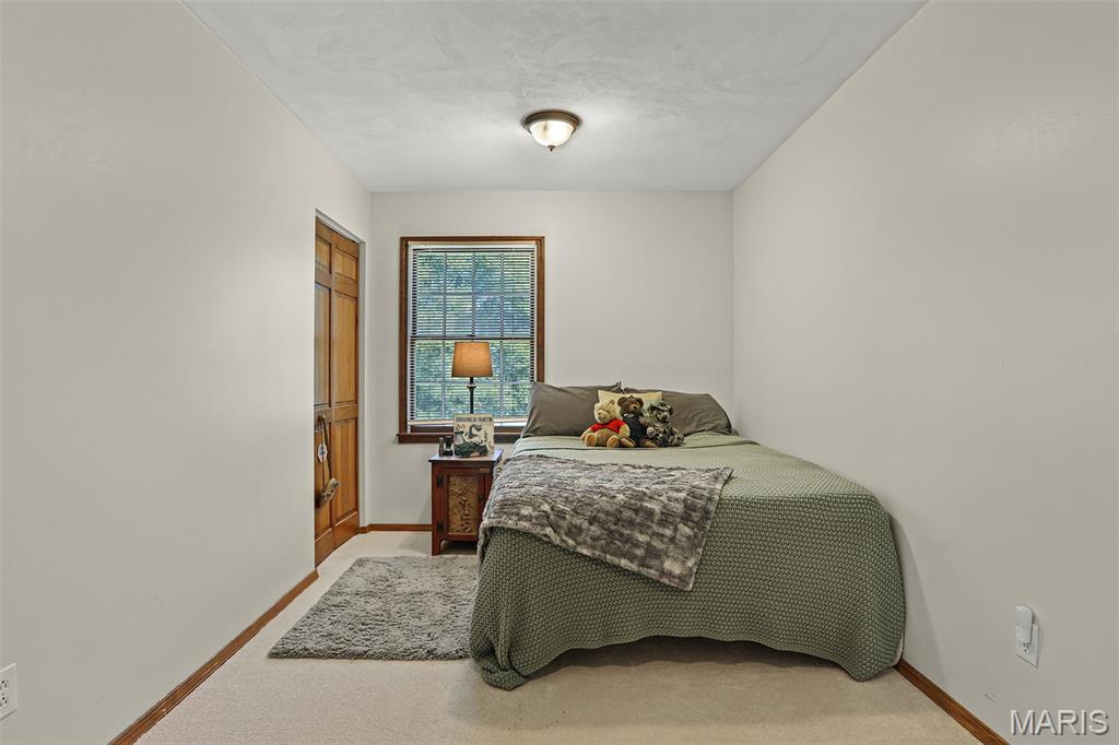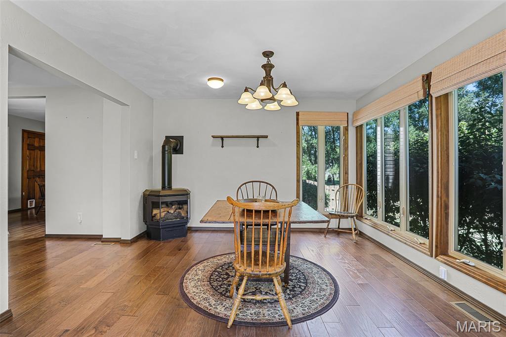 Spacious and beautifully maintained 5 BR, 3.5 BA two story home on 1.68 acres minutes from downtown Edwardsville, IL! This move in ready home features a main floor living room w/ woodburning fireplace opening to a separate dining room. Updated hardwood floors throughtout the main level, stairs and upstairs hallway. A newly updated kitchen featuring quartz countertops, ample cabinet space, tile backsplash and updated stainless steel appliances. Enjoy natural light year round in the bright and airy sunroom which provides additional dining or living space. Behind the two car oversized garage, you'll find a bonus room perfect for a home gym, playroom or hobby space. Upstairs, 5 generously sized bedrooms and 3 full baths offer an abundance of room for family, guests or office spaces. The large master BR suite features a full bath w/ walk in shower, whirlpool tub and double vanity. The upper level boasts a huge bonus room w/ electric fireplace- ideal as a teen lounge/media room. The lower level includes finished space for a home office, an add'l workshop area and plenty of storage. New sump pump-2023. Step outside to an above ground pool, freshly stained two level deck, charming gazebo and shed. The partially fenced yard was recently landscaped with trees and shrubs and offers a peaceful, park like private setting with plenty of room to garden, play or entertain. Located in the Eville School District minutes from SIUE and interstates. Country living with all the convenience!