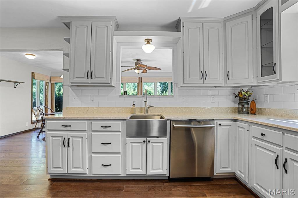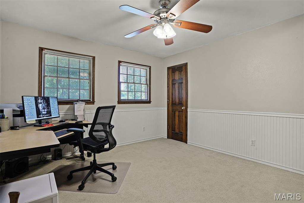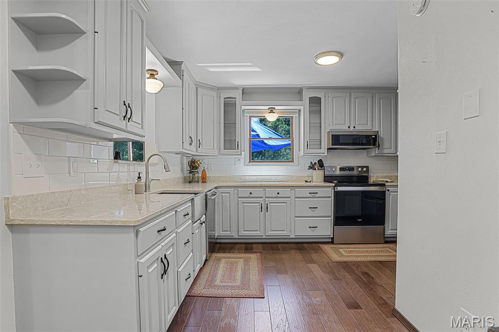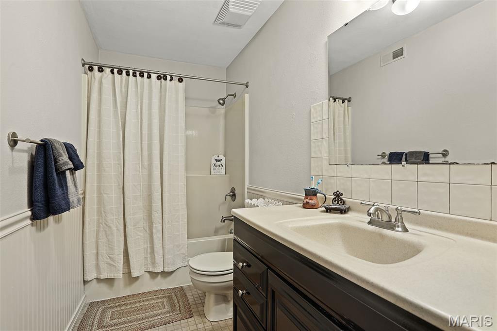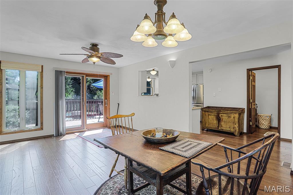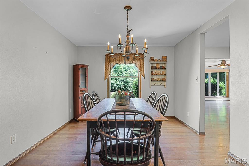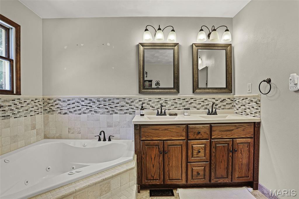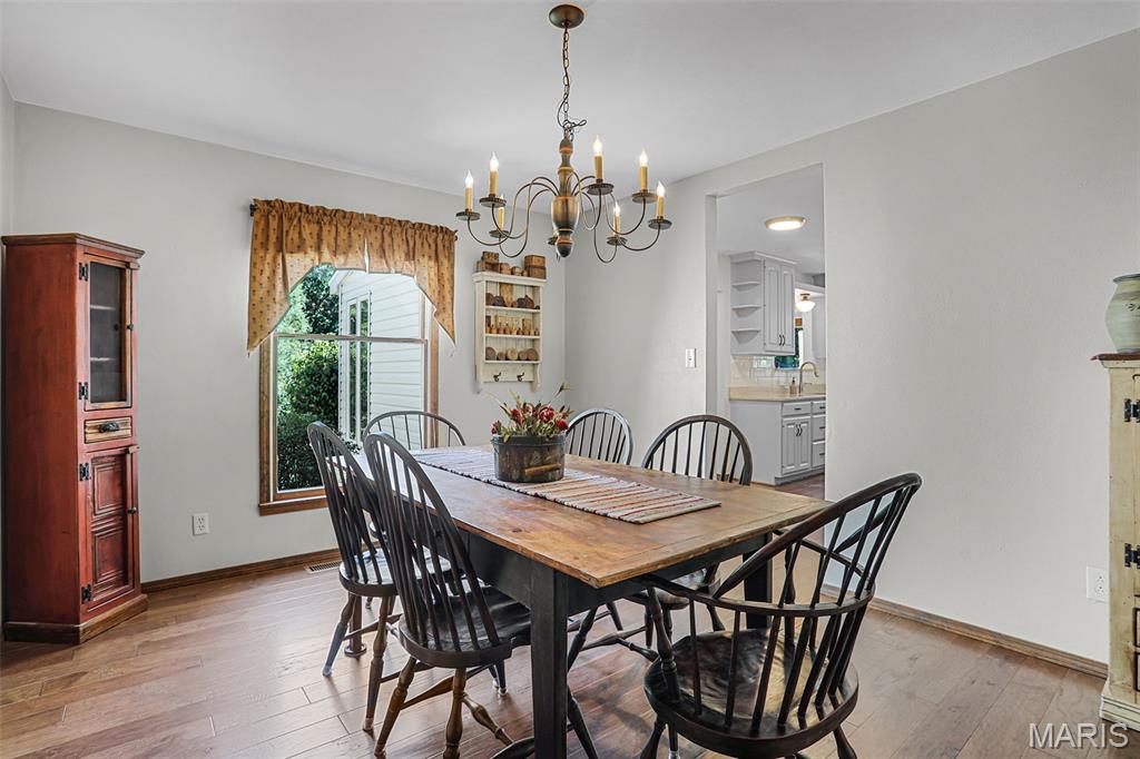 Spacious and beautifully maintained 5 BR, 3.5 BA two story home on 1.68 acres minutes from downtown Edwardsville, IL! This move in ready home features a main floor living room w/ woodburning fireplace opening to a separate dining room. Updated hardwood floors throughtout the main level, stairs and upstairs hallway. A newly updated kitchen featuring quartz countertops, ample cabinet space, tile backsplash and updated stainless steel appliances. Enjoy natural light year round in the bright and airy sunroom which provides additional dining or living space. Behind the two car oversized garage, you'll find a bonus room perfect for a home gym, playroom or hobby space. Upstairs, 5 generously sized bedrooms and 3 full baths offer an abundance of room for family, guests or office spaces. The large master BR suite features a full bath w/ walk in shower, whirlpool tub and double vanity. The upper level boasts a huge bonus room w/ electric fireplace- ideal as a teen lounge/media room. The lower level includes finished space for a home office, an add'l workshop area and plenty of storage. New sump pump-2023. Step outside to an above ground pool, freshly stained two level deck, charming gazebo and shed. The partially fenced yard was recently landscaped with trees and shrubs and offers a peaceful, park like private setting with plenty of room to garden, play or entertain. Located in the Eville School District minutes from SIUE and interstates. Country living with all the convenience!
