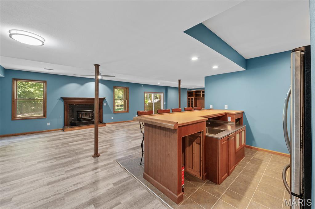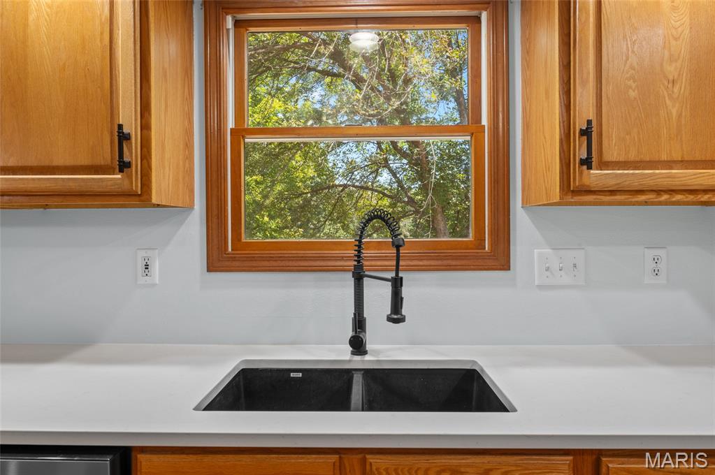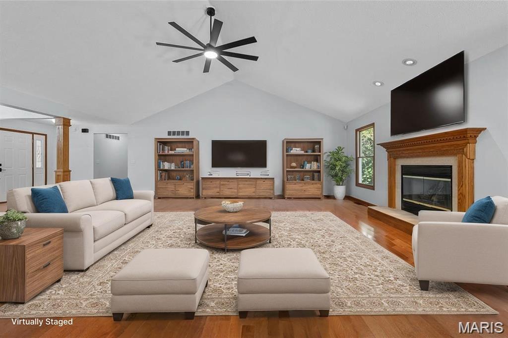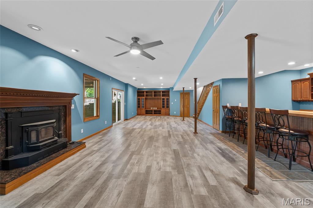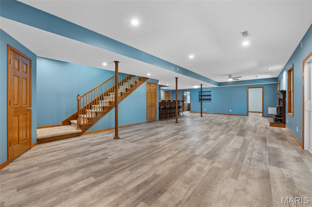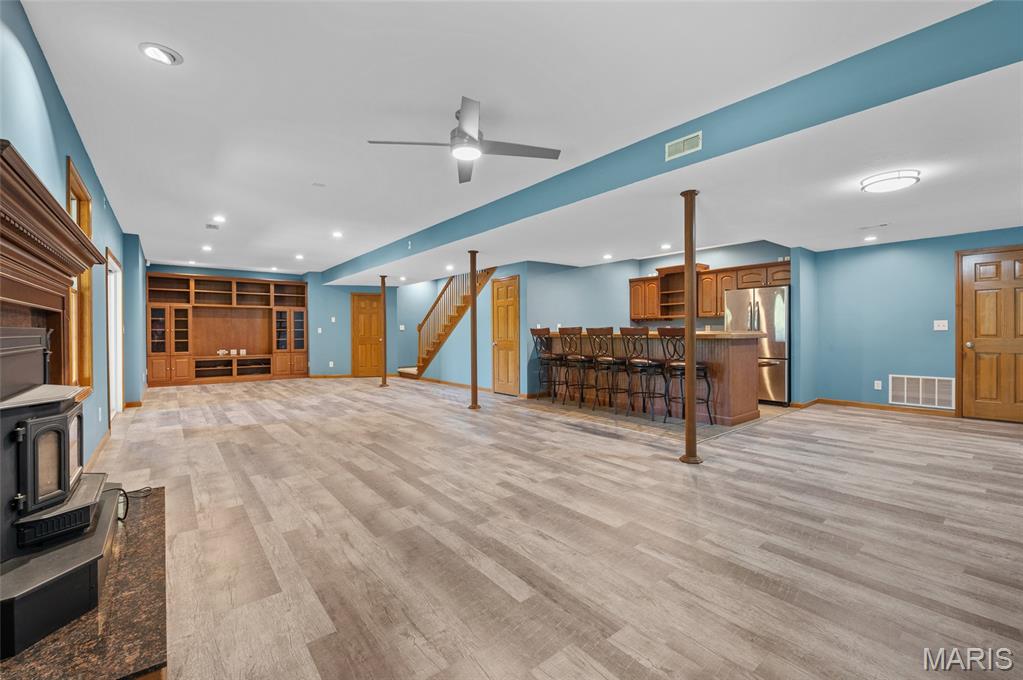 Step into comfort and style with this stunning, recently updated ranch home, offering over 3,400 sq ft of finished living space. Situated on a picturesque 1.33-acre lot, the property features a fenced backyard and access to a serene shared pond. Inside, you're welcomed by a spacious great room with hardwood floors, seamlessly connecting the living room (with a woodburning fireplace), dining area, and kitchen. The kitchen has new quartz countertops, brand-new appliances, a large pantry, and access to a composite deck that overlooks the peaceful backyard. The bedrooms have new carpet, and the primary bath has been beautifully remodeled with a walk-in shower, soaking tub, and a walk-in closet. The hall bath has also been updated. The finished lower level expands your living options with a large family room, wet bar with a full-sized refrigerator, gas fireplace, and a custom built-in entertainment center. A new sliding patio door leads to a lower patio and the backyard. This level also includes a 4th bedroom, full bath, and a huge storage area with double-door access—perfect for large items or workshop space. Additional features include: House security cameras (included), Paid-off solar panels, 16 SEER 2-stage heat pump. Extra attic insulation for enhanced energy efficiency. This home is move-in ready and thoughtfully upgraded to offer the best of comfort, energy savings, and modern living—all in a peaceful, scenic setting. Don’t miss the opportunity to make it yours!