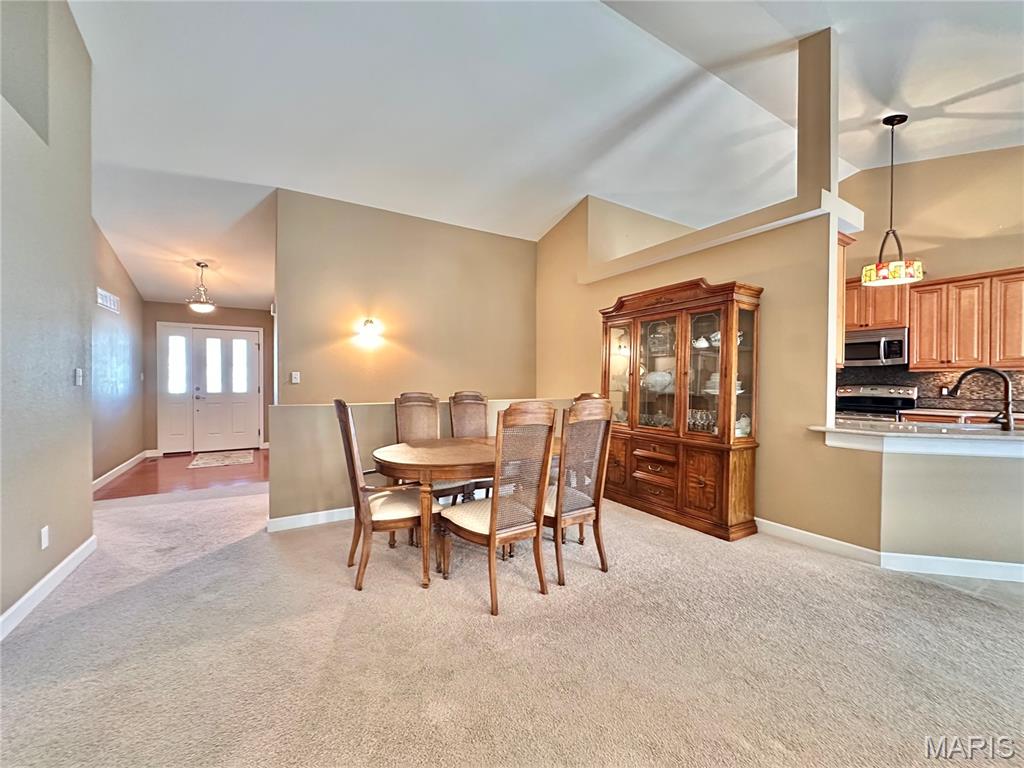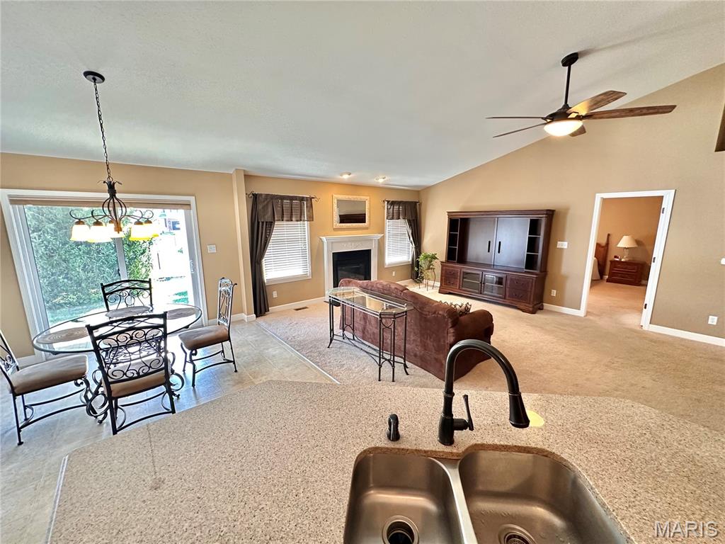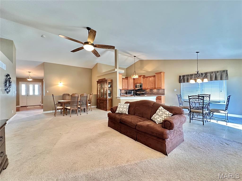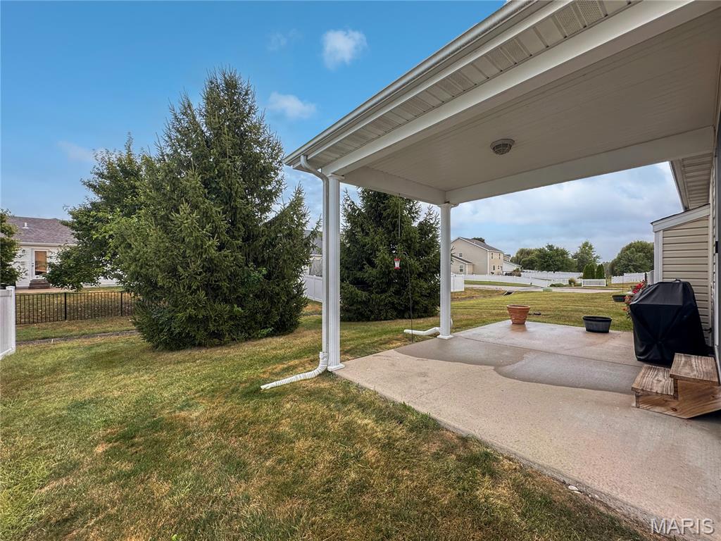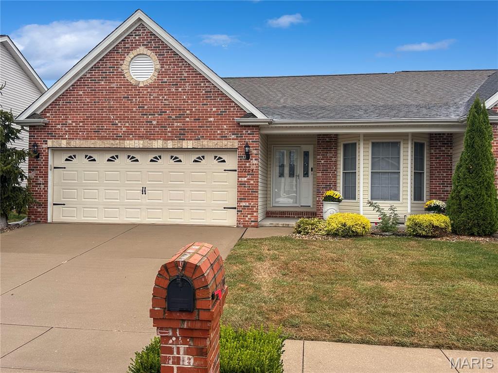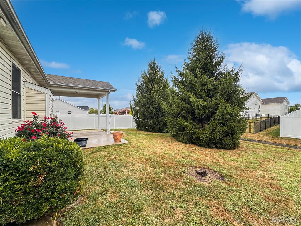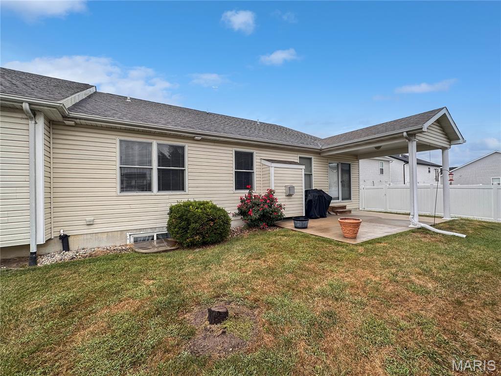 Welcome home to this spacious 3 bedroom, 3 bathroom villa nestled in a quiet residential neighborhood with no monthly HOA fees. Step inside to find vaulted ceilings and an open-concept layout featuring a living room with a cozy gas fireplace, formal dining room and eat-in kitchen. The kitchen is equipped with custom staggered cabinets with underlighting, granite countertops, stainless steel appliance and a dining area with sliding doors leading to the covered patio overlooking a private backyard. The main-level primary suite offers a walk-in closet and a luxurious ensuite bathroom with a double vanity, soaking tub and 4-foot shower. Convenient main-level laundry and the washer and dryer can stay! An attached 2-car garage adds extra convenience. The finished lower level expands your living space with a family room, built-in dry bar, custom lit shelving, an electric fireplace and the third bedroom with its own full bathroom. A large storage room and water backup sump pump system provide peace of mind and ample storage options. All appliances stay, making this home move-in ready! Home has passed occupancy. Close to SAFB, Interstate access, Mid America Airport, shopping and more!