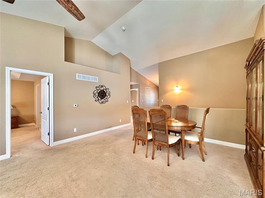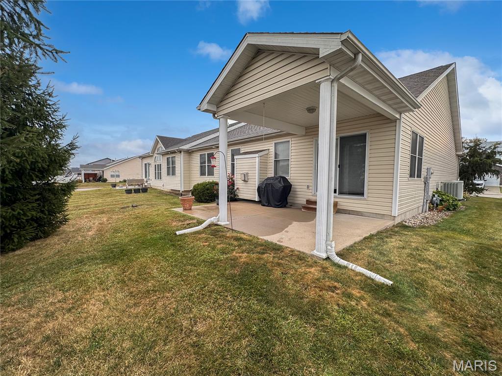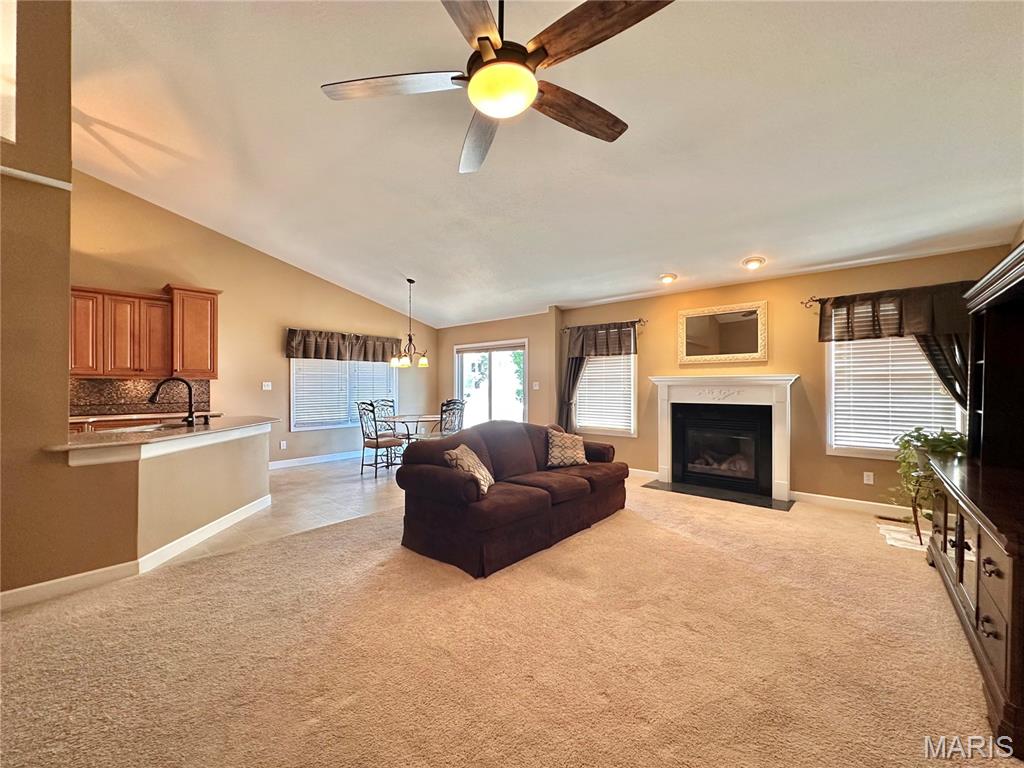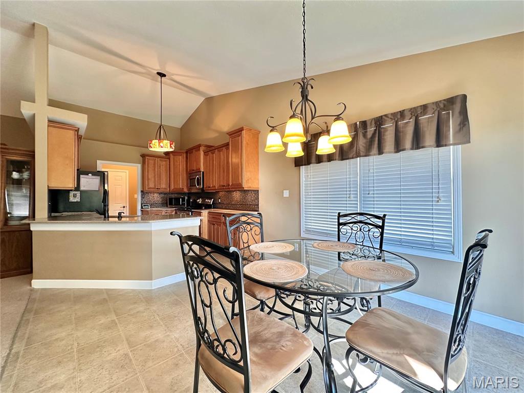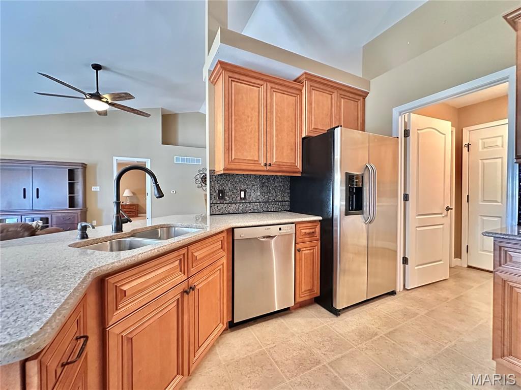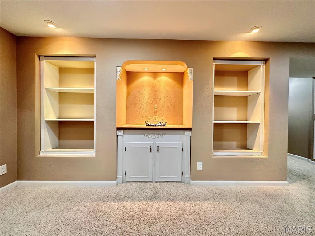 Welcome home to this spacious 3 bedroom, 3 bathroom villa nestled in a quiet residential neighborhood with no monthly HOA fees. Step inside to find vaulted ceilings and an open-concept layout featuring a living room with a cozy gas fireplace, formal dining room and eat-in kitchen. The kitchen is equipped with custom staggered cabinets with underlighting, granite countertops, stainless steel appliance and a dining area with sliding doors leading to the covered patio overlooking a private backyard. The main-level primary suite offers a walk-in closet and a luxurious ensuite bathroom with a double vanity, soaking tub and 4-foot shower. Convenient main-level laundry and the washer and dryer can stay! An attached 2-car garage adds extra convenience. The finished lower level expands your living space with a family room, built-in dry bar, custom lit shelving, an electric fireplace and the third bedroom with its own full bathroom. A large storage room and water backup sump pump system provide peace of mind and ample storage options. All appliances stay, making this home move-in ready! Home has passed occupancy. Close to SAFB, Interstate access, Mid America Airport, shopping and more!