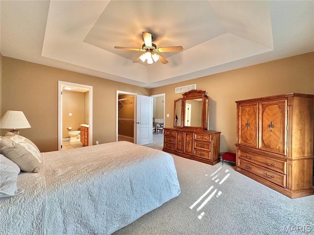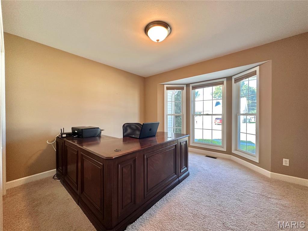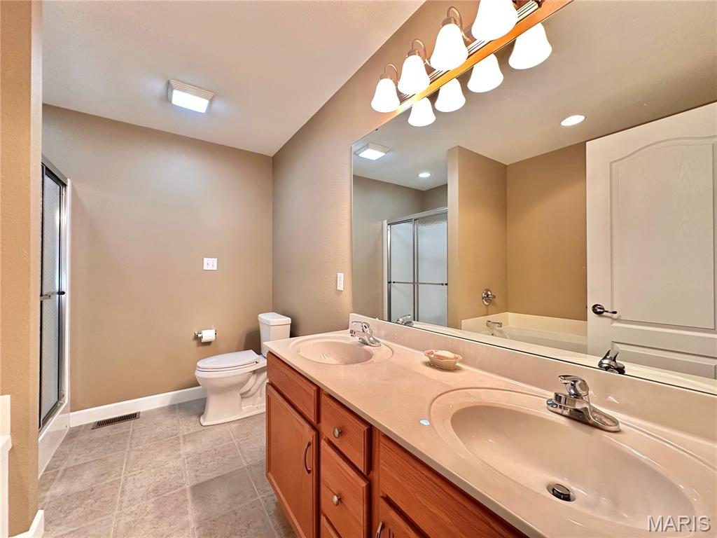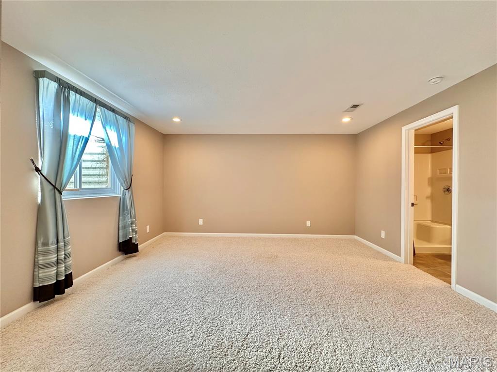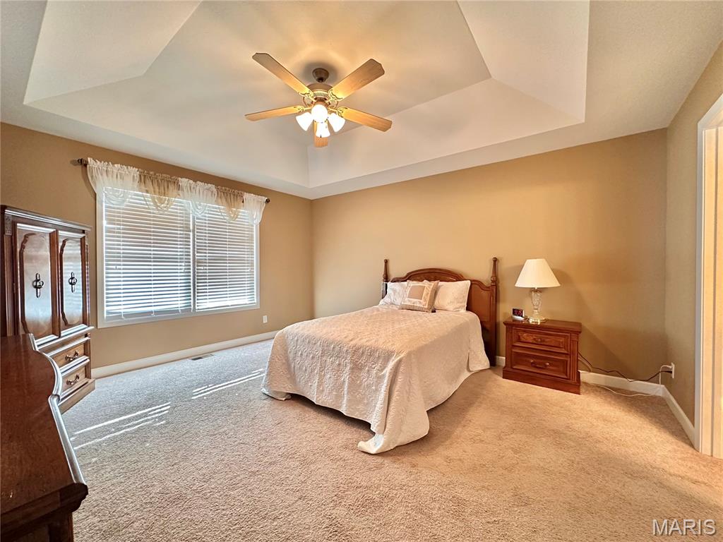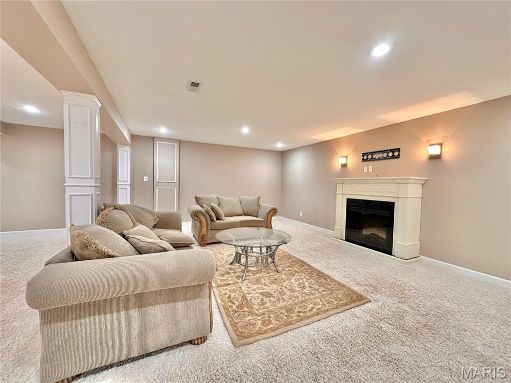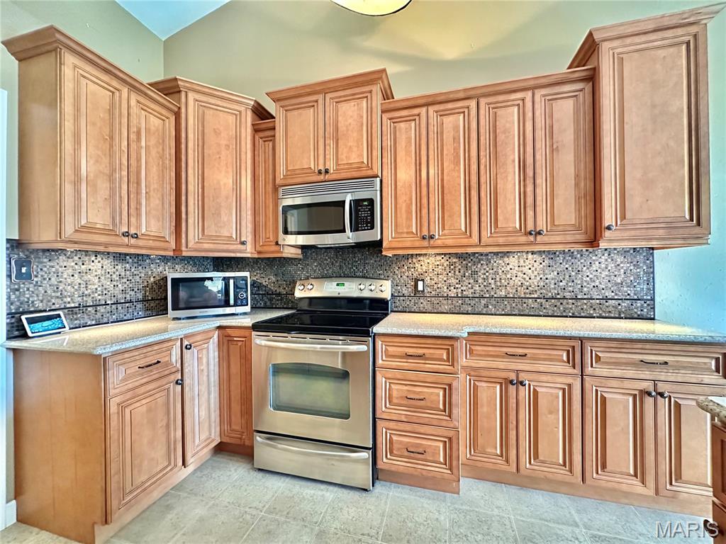 Welcome home to this spacious 3 bedroom, 3 bathroom villa nestled in a quiet residential neighborhood with no monthly HOA fees. Step inside to find vaulted ceilings and an open-concept layout featuring a living room with a cozy gas fireplace, formal dining room and eat-in kitchen. The kitchen is equipped with custom staggered cabinets with underlighting, granite countertops, stainless steel appliance and a dining area with sliding doors leading to the covered patio overlooking a private backyard. The main-level primary suite offers a walk-in closet and a luxurious ensuite bathroom with a double vanity, soaking tub and 4-foot shower. Convenient main-level laundry and the washer and dryer can stay! An attached 2-car garage adds extra convenience. The finished lower level expands your living space with a family room, built-in dry bar, custom lit shelving, an electric fireplace and the third bedroom with its own full bathroom. A large storage room and water backup sump pump system provide peace of mind and ample storage options. All appliances stay, making this home move-in ready! Home has passed occupancy. Close to SAFB, Interstate access, Mid America Airport, shopping and more!