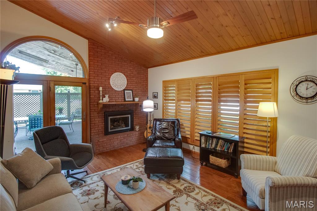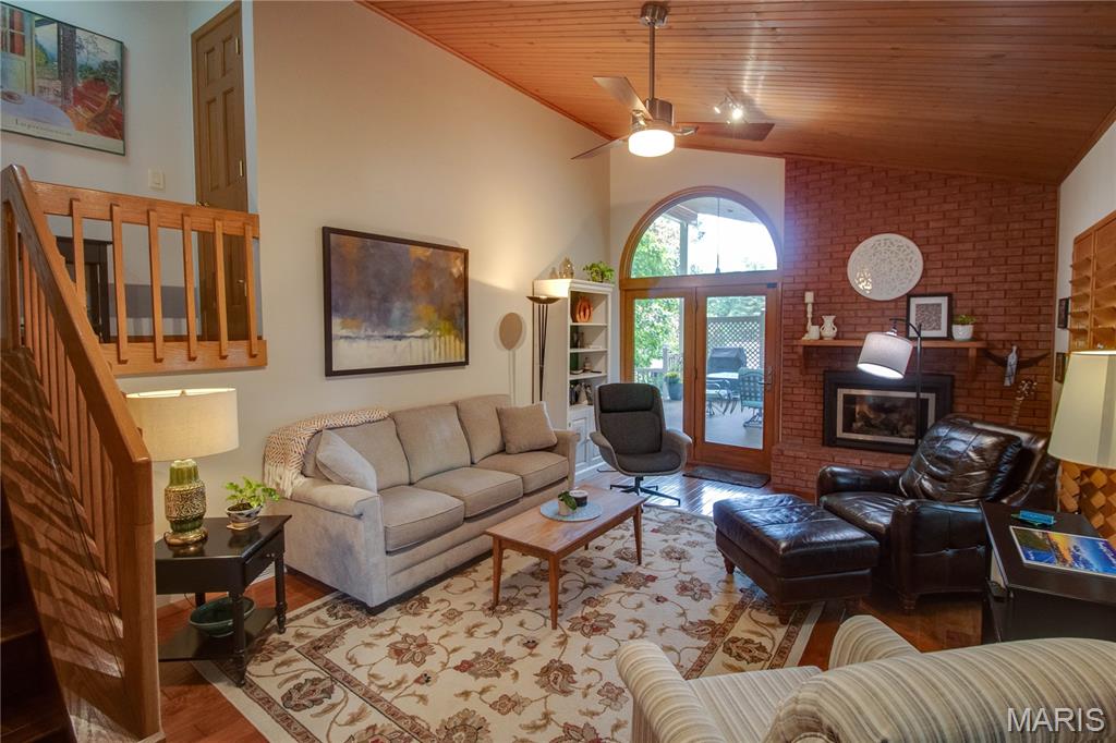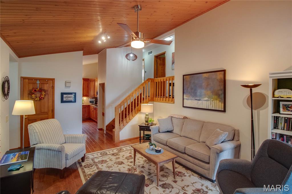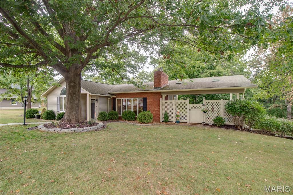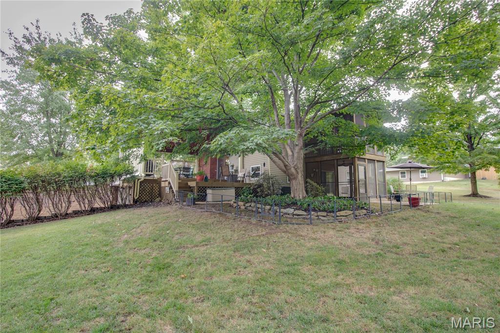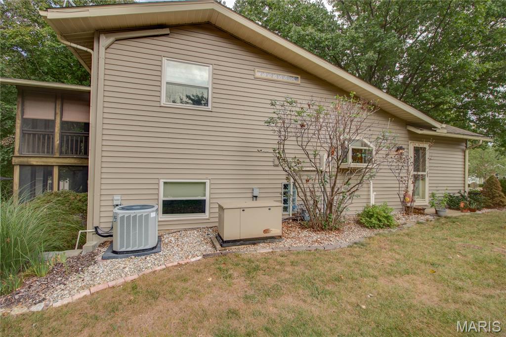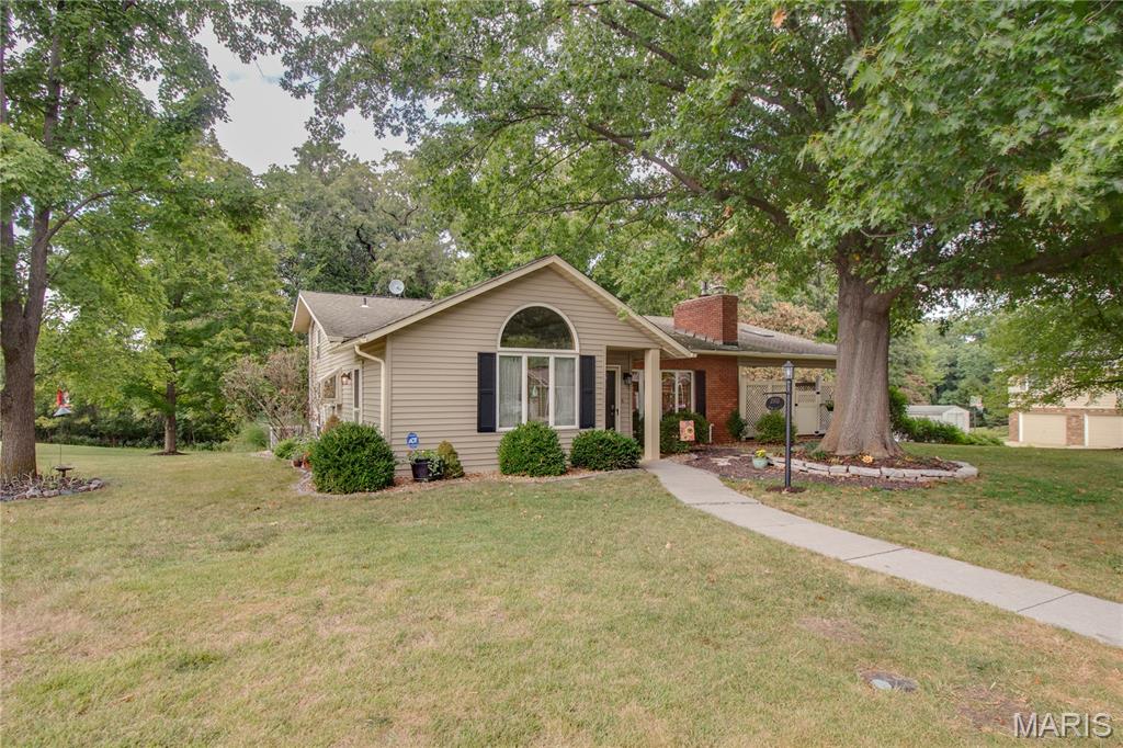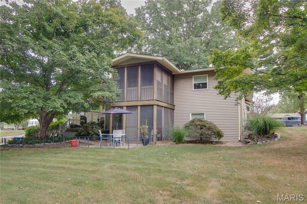 Immaculate Home with Mid-Century Modern Flair in Elsah Hills! This remodeled 3-bed, 2-bath quad-level home in the Elsah Hills neighborhood blends timeless mid-century modern design with thoughtful modern updates such as vaulted ceilings on the main level, solid wood interior doors, & gleaming hardwood floors. The open-concept kitchen offers generous cabinet space & flows easily into the main living area. The living room features a cozy gas fireplace, plantation shutters, & stunning natural light, while the spacious family room on the lower level offers a built-in electric fireplace, custom blinds, & heated floors. Enjoy two screened-in porches, one off the primary bedroom & one off the family room, both with ceiling fans—plus an expansive 20’x20’ covered patio with skylights & ceiling fans, located just off the living room. Relax in your private backyard oasis. Additional features include: Wet bar, 2-zone central a/c, Full-house 15 kW Generac generator, Heated floors in family room & lower-level bathroom, Sump pump, Norweco septic system, Detached custom-built 16’ x 12’ shed with electric, electric available at the parking pad for RV plug in, & tons of storage throughout. Recent updates include: Roof (2015), Gas furnace (2016), Water heater (2019). Set on a beautifully landscaped lot that backs up to serene woods, this home combines privacy, character, & modern comfort. The 2-car built-in garage adds convenience with plenty of parking in driveway. Schedule your showing today!