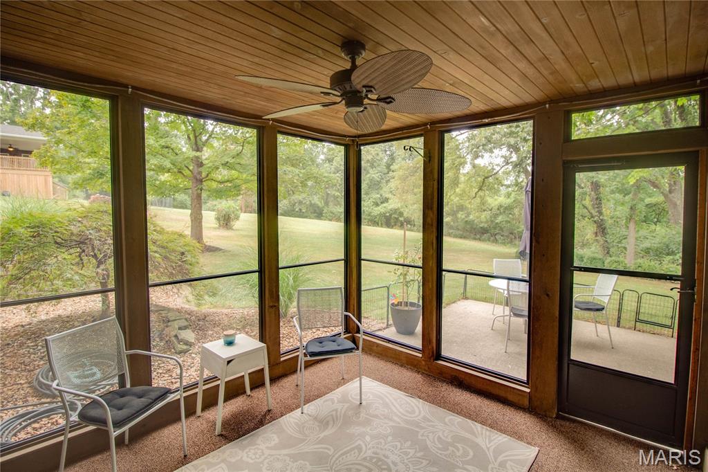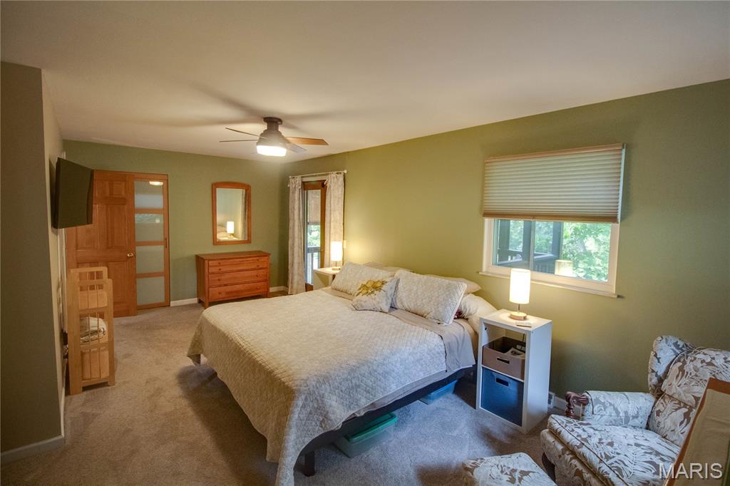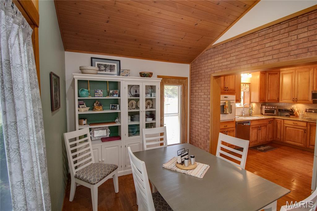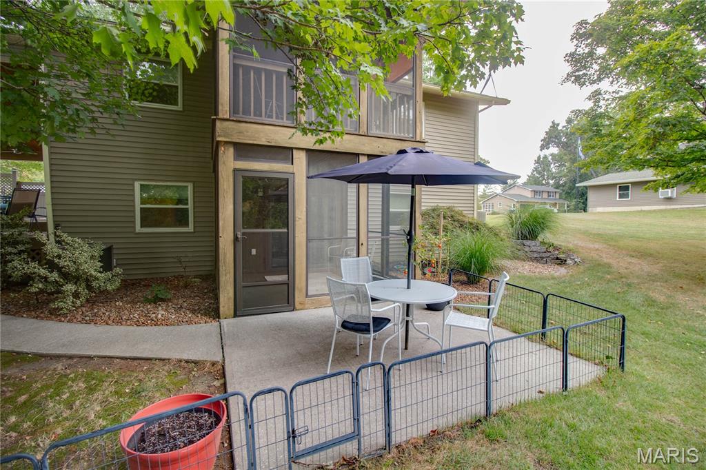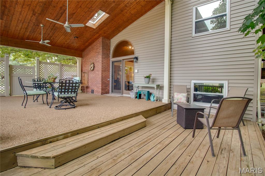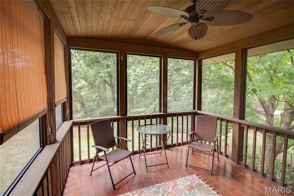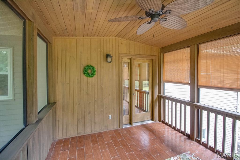 Immaculate Home with Mid-Century Modern Flair in Elsah Hills! This remodeled 3-bed, 2-bath quad-level home in the Elsah Hills neighborhood blends timeless mid-century modern design with thoughtful modern updates such as vaulted ceilings on the main level, solid wood interior doors, & gleaming hardwood floors. The open-concept kitchen offers generous cabinet space & flows easily into the main living area. The living room features a cozy gas fireplace, plantation shutters, & stunning natural light, while the spacious family room on the lower level offers a built-in electric fireplace, custom blinds, & heated floors. Enjoy two screened-in porches, one off the primary bedroom & one off the family room, both with ceiling fans—plus an expansive 20’x20’ covered patio with skylights & ceiling fans, located just off the living room. Relax in your private backyard oasis. Additional features include: Wet bar, 2-zone central a/c, Full-house 15 kW Generac generator, Heated floors in family room & lower-level bathroom, Sump pump, Norweco septic system, Detached custom-built 16’ x 12’ shed with electric, electric available at the parking pad for RV plug in, & tons of storage throughout. Recent updates include: Roof (2015), Gas furnace (2016), Water heater (2019). Set on a beautifully landscaped lot that backs up to serene woods, this home combines privacy, character, & modern comfort. The 2-car built-in garage adds convenience with plenty of parking in driveway. Schedule your showing today!