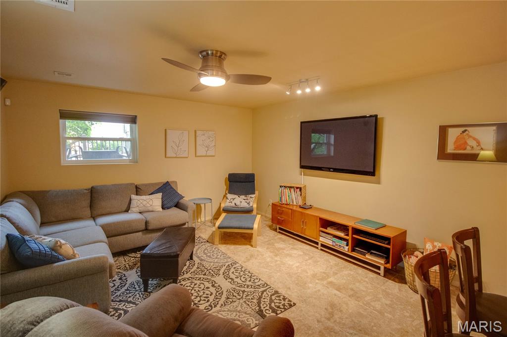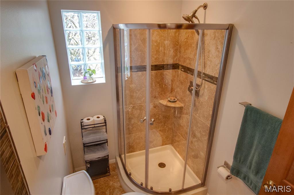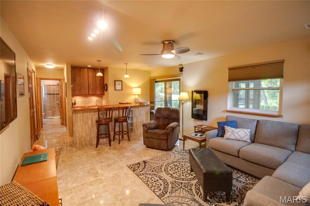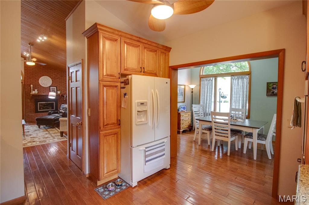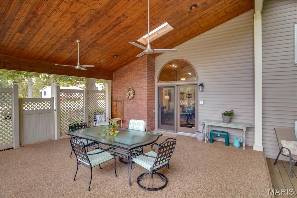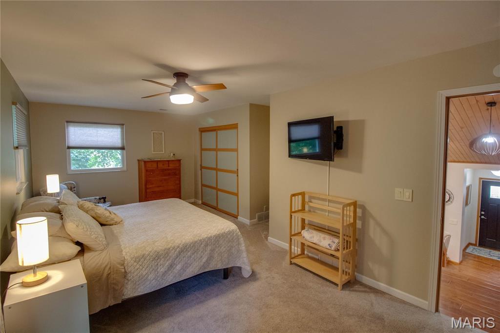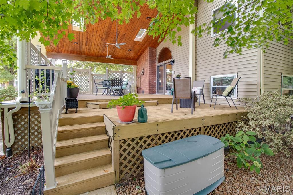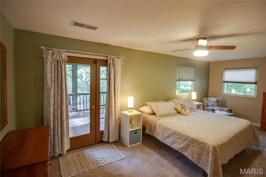 Immaculate Home with Mid-Century Modern Flair in Elsah Hills! This remodeled 3-bed, 2-bath quad-level home in the Elsah Hills neighborhood blends timeless mid-century modern design with thoughtful modern updates such as vaulted ceilings on the main level, solid wood interior doors, & gleaming hardwood floors. The open-concept kitchen offers generous cabinet space & flows easily into the main living area. The living room features a cozy gas fireplace, plantation shutters, & stunning natural light, while the spacious family room on the lower level offers a built-in electric fireplace, custom blinds, & heated floors. Enjoy two screened-in porches, one off the primary bedroom & one off the family room, both with ceiling fans—plus an expansive 20’x20’ covered patio with skylights & ceiling fans, located just off the living room. Relax in your private backyard oasis. Additional features include: Wet bar, 2-zone central a/c, Full-house 15 kW Generac generator, Heated floors in family room & lower-level bathroom, Sump pump, Norweco septic system, Detached custom-built 16’ x 12’ shed with electric, electric available at the parking pad for RV plug in, & tons of storage throughout. Recent updates include: Roof (2015), Gas furnace (2016), Water heater (2019). Set on a beautifully landscaped lot that backs up to serene woods, this home combines privacy, character, & modern comfort. The 2-car built-in garage adds convenience with plenty of parking in driveway. Schedule your showing today!