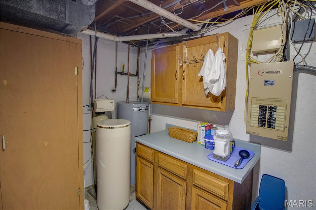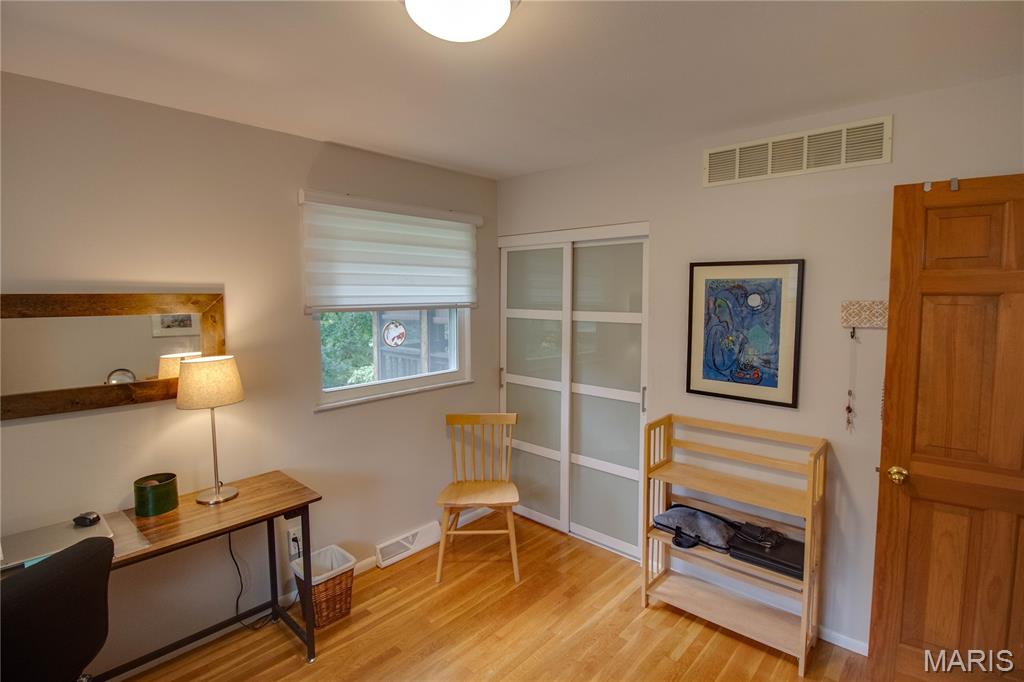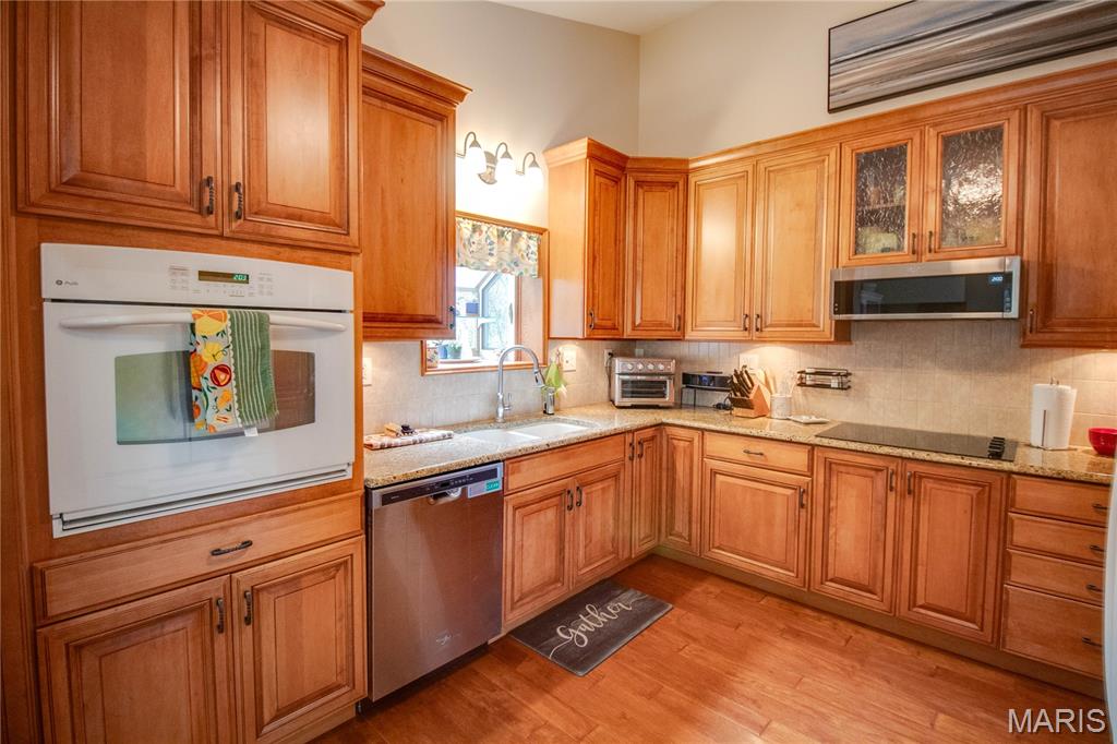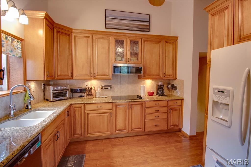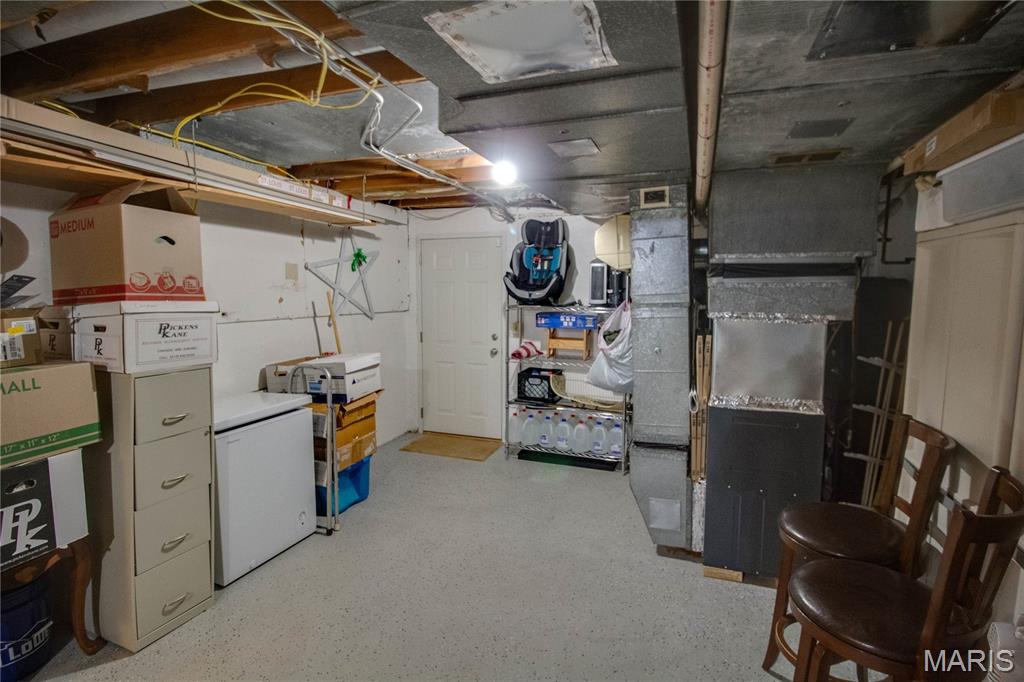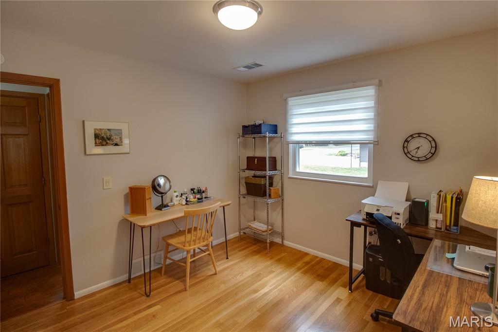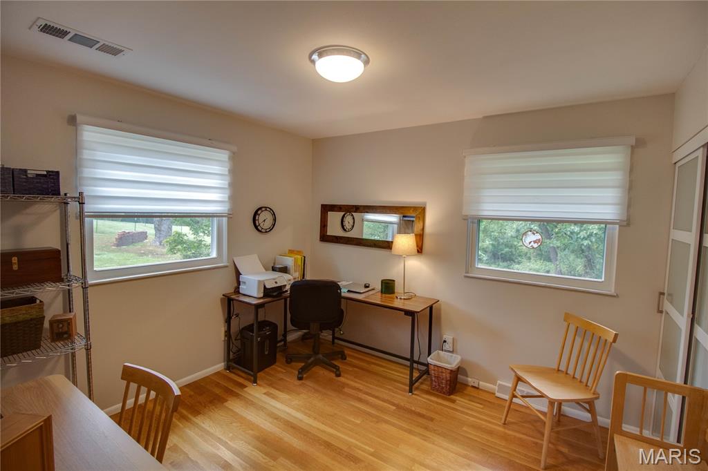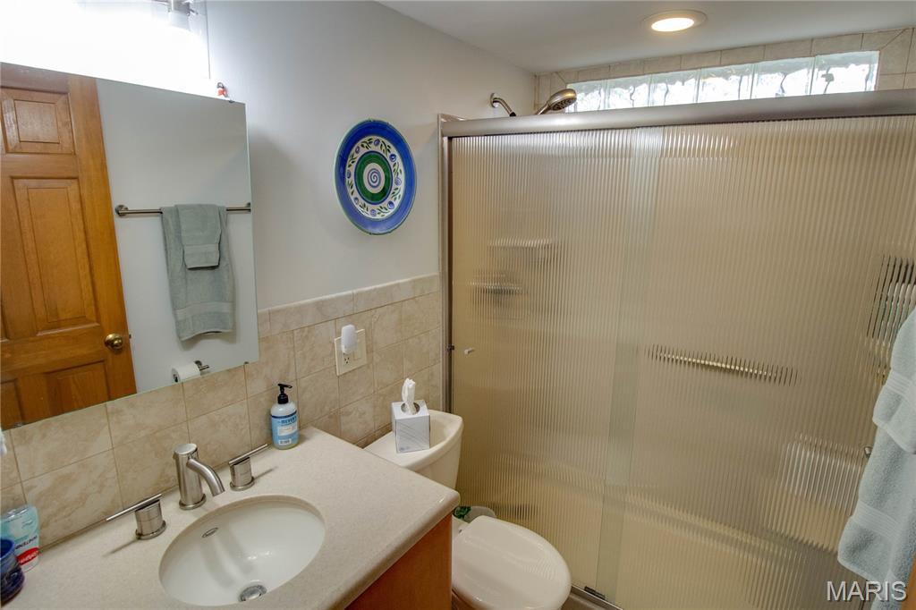 Immaculate Home with Mid-Century Modern Flair in Elsah Hills! This remodeled 3-bed, 2-bath quad-level home in the Elsah Hills neighborhood blends timeless mid-century modern design with thoughtful modern updates such as vaulted ceilings on the main level, solid wood interior doors, & gleaming hardwood floors. The open-concept kitchen offers generous cabinet space & flows easily into the main living area. The living room features a cozy gas fireplace, plantation shutters, & stunning natural light, while the spacious family room on the lower level offers a built-in electric fireplace, custom blinds, & heated floors. Enjoy two screened-in porches, one off the primary bedroom & one off the family room, both with ceiling fans—plus an expansive 20’x20’ covered patio with skylights & ceiling fans, located just off the living room. Relax in your private backyard oasis. Additional features include: Wet bar, 2-zone central a/c, Full-house 15 kW Generac generator, Heated floors in family room & lower-level bathroom, Sump pump, Norweco septic system, Detached custom-built 16’ x 12’ shed with electric, electric available at the parking pad for RV plug in, & tons of storage throughout. Recent updates include: Roof (2015), Gas furnace (2016), Water heater (2019). Set on a beautifully landscaped lot that backs up to serene woods, this home combines privacy, character, & modern comfort. The 2-car built-in garage adds convenience with plenty of parking in driveway. Schedule your showing today!