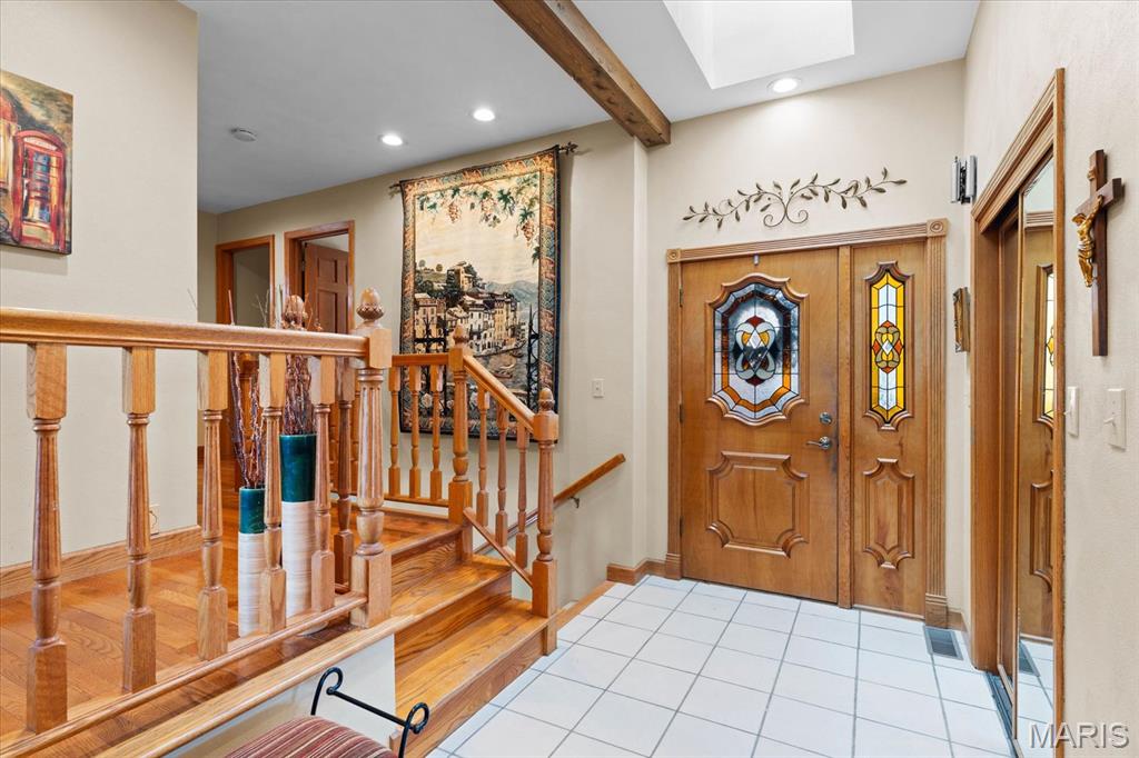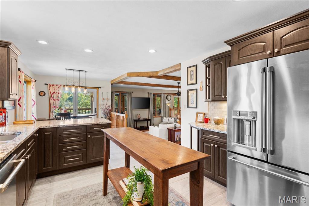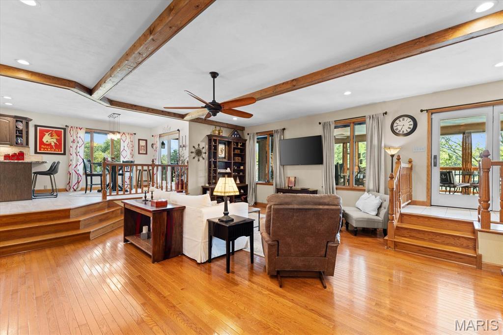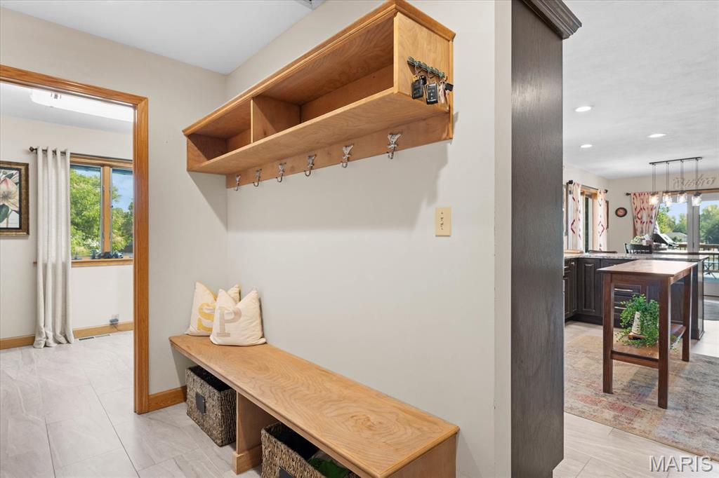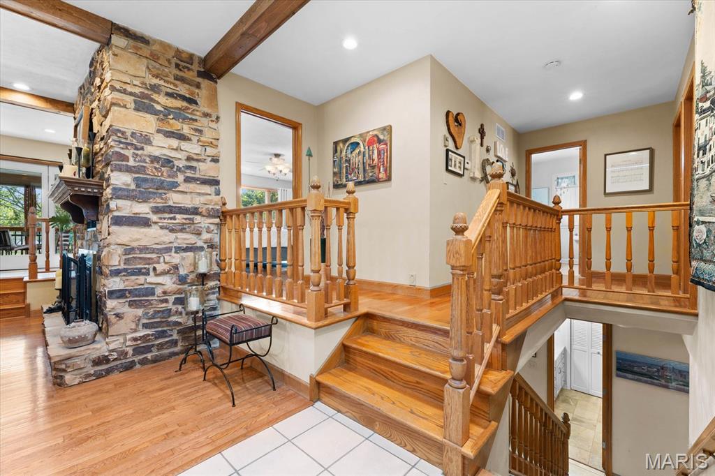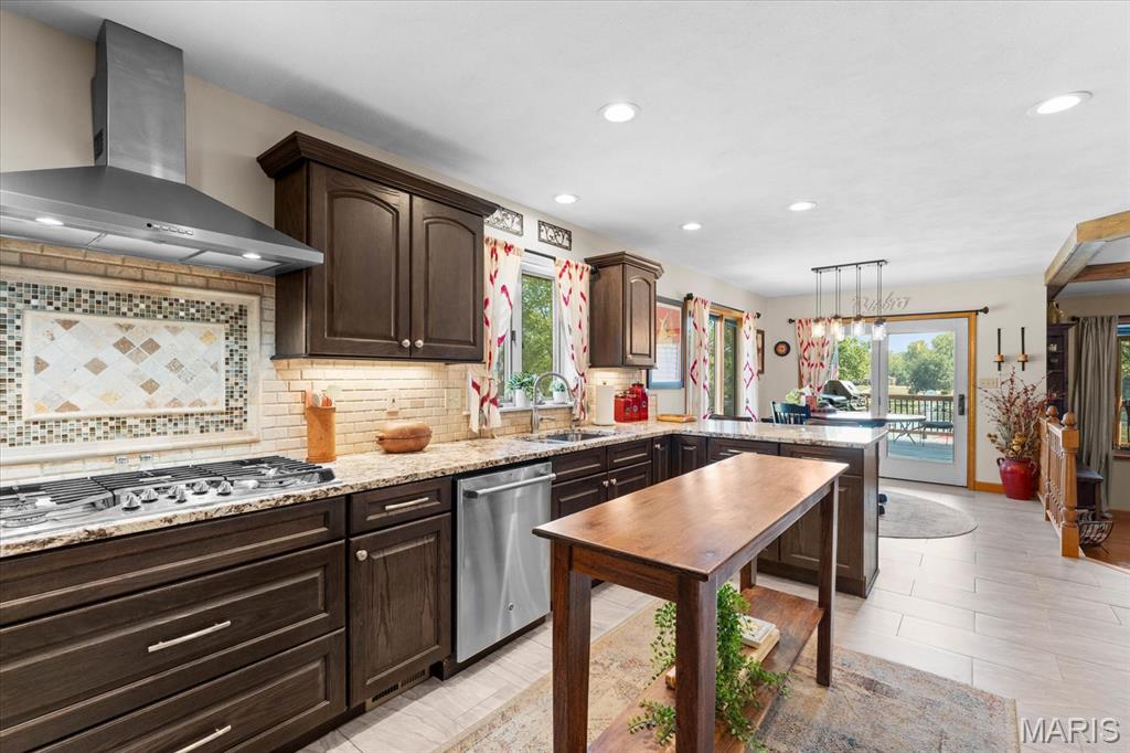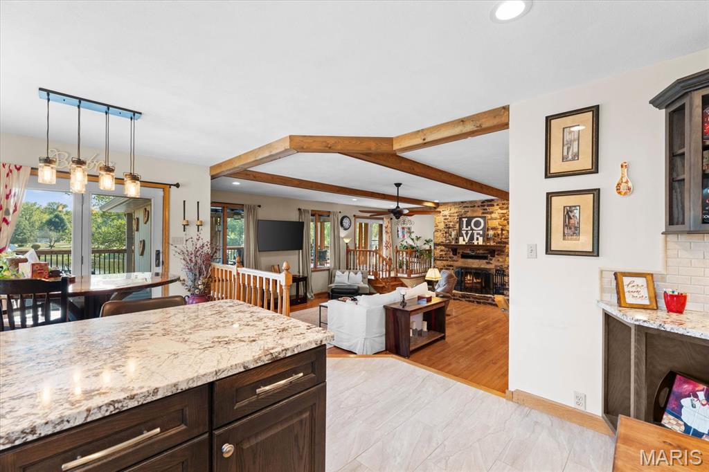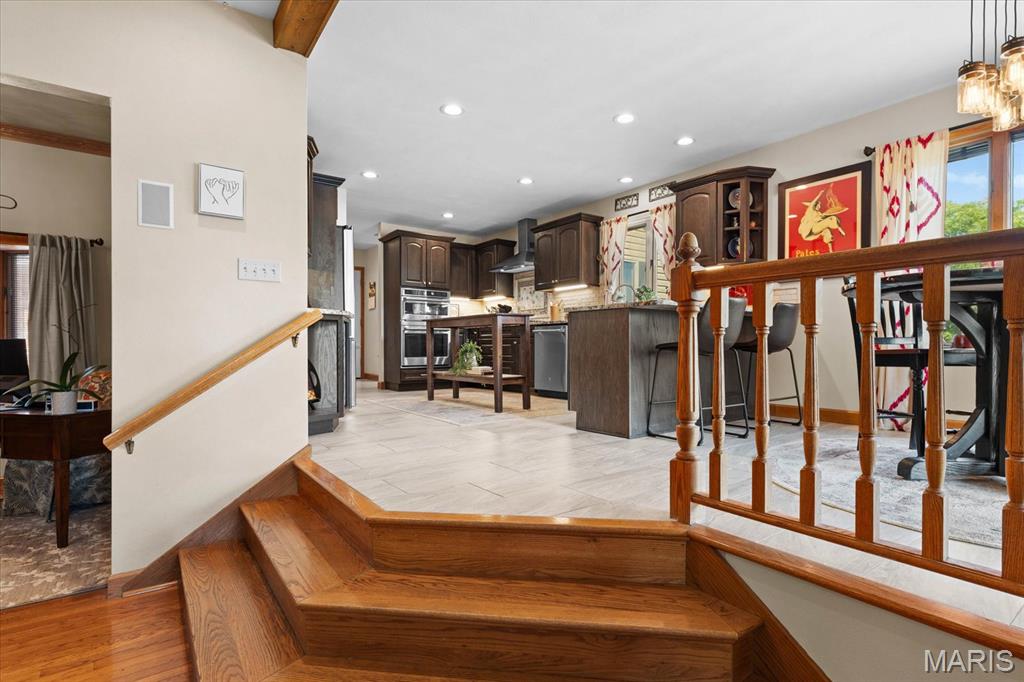 Escape to your lakeside retreat with this unique multi-level split ranch, exuding a vacation-like vibe from the moment you arrive. The home features a recently updated kitchen with modern appliances, walk-in pantry, laundry room, half bath, and breakfast room leading to the covered deck. The main living area features the living room with fireplace, and dining room currently used as an office. On the other end you have three bedrooms, including a master suite with a double vanity, soaker tub, and walk-in closet. With 5 bathrooms, a convenient laundry room, and an oversized two-car garage, this home effortlessly blends style and functionality. Added in 2024, a 1,500 sq. ft. air-conditioned workshop with its own bathroom extends off the garage, ideal for hobbies or business. The walk-out basement includes a wet bar, office, and three-quarter bath. Outside, the pool deck overlooks the serene lake, creating an inviting space for relaxation and entertaining. The pool has new pipes concrete and pump/filter system. With a newer roof and thoughtful updates throughout, this property combines comfort, charm, and lifestyle. - Ask for list of upgrades & improvements