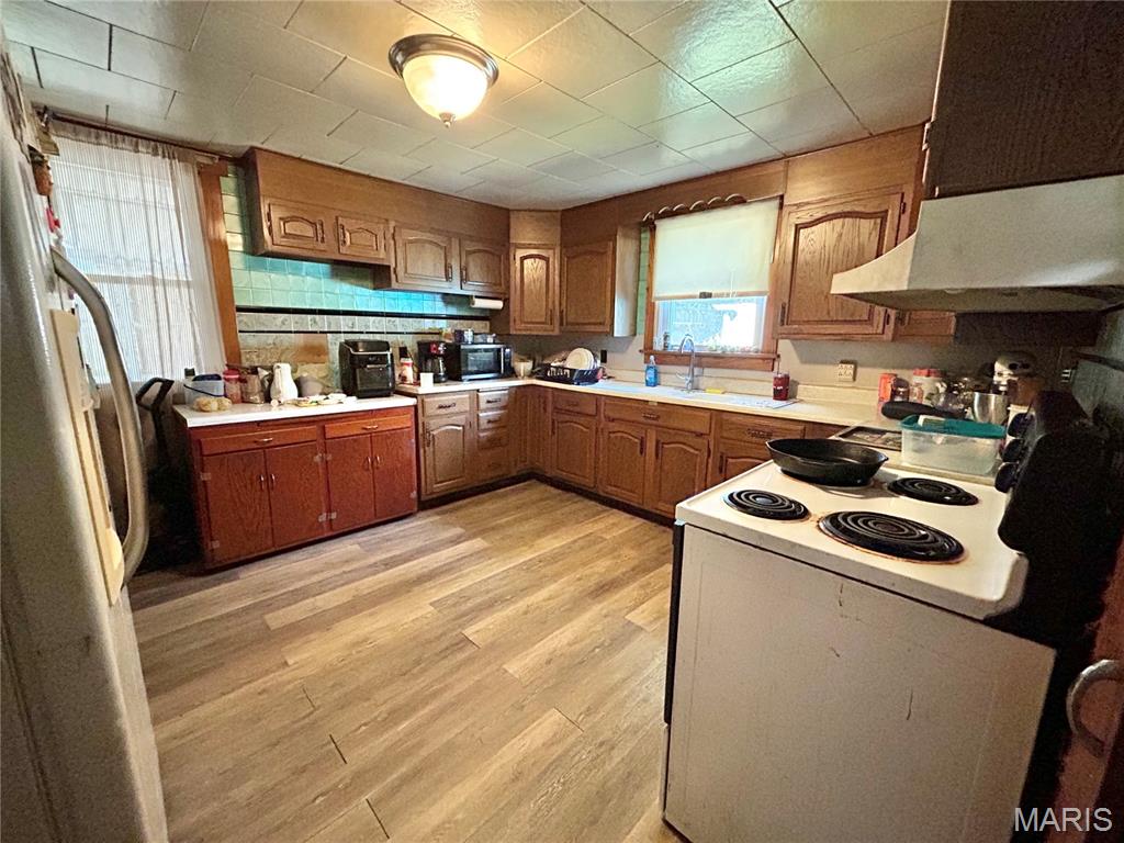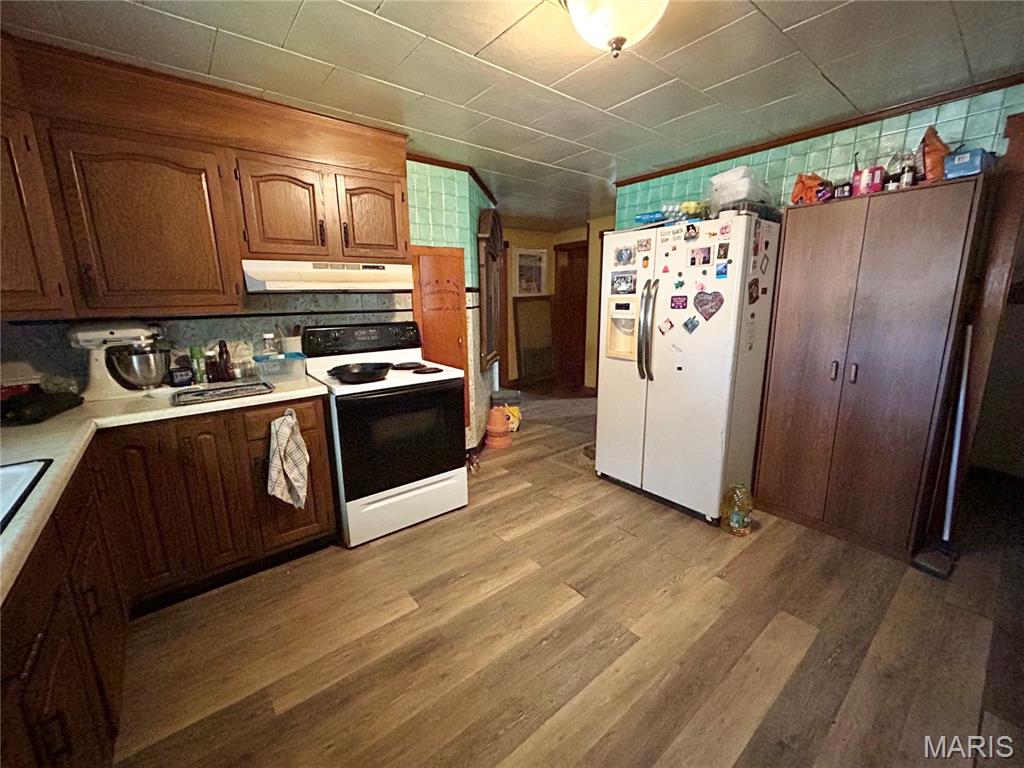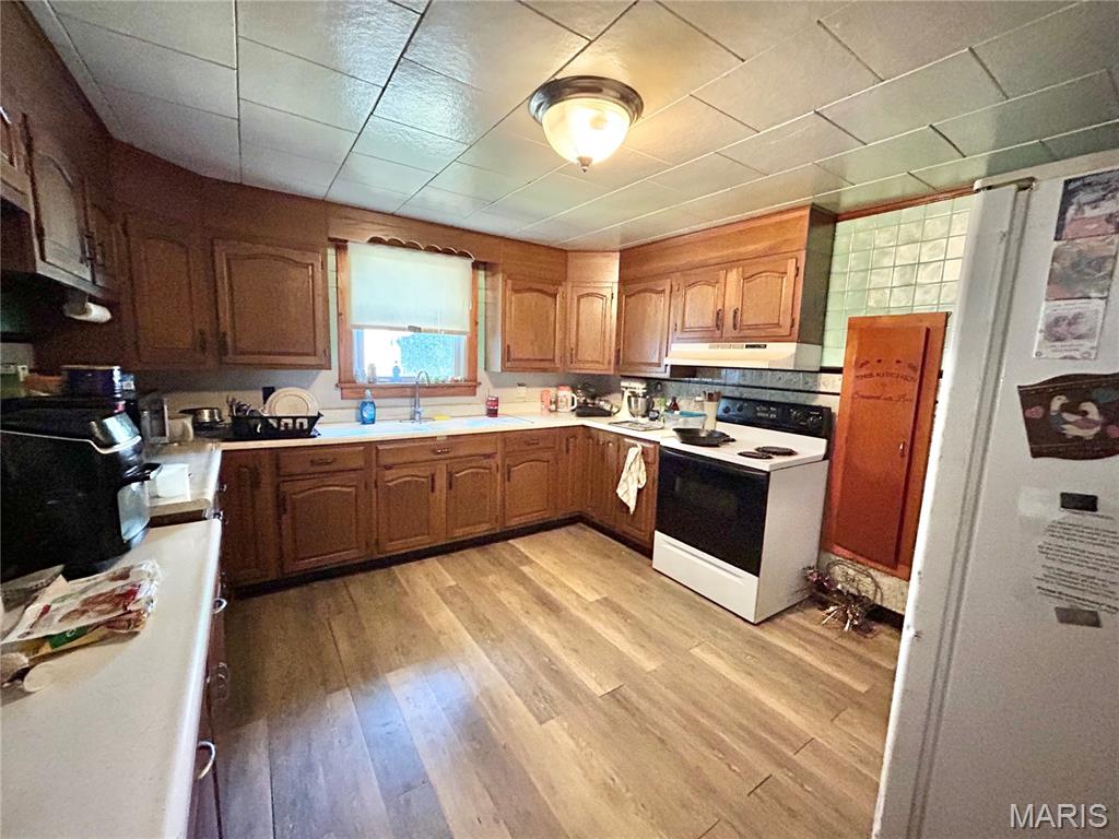 2-bedroom, 2-bath home with great potential! The second bath is conveniently located in the garage, which along with the main floor laundry, features heated floors for added comfort. Inside, you’ll find beautiful wood floors, an updated bathroom, a spacious kitchen, and a main floor laundry. The unfinished walkout basement offers plenty of room to expand, while the large fenced lot includes a storage shed and a covered patio for outdoor enjoyment. Roof replaced in 2017 and windows updated in 2008. With a little TLC, this property could shine—don’t miss your chance to make it yours! Property being sold as-is.