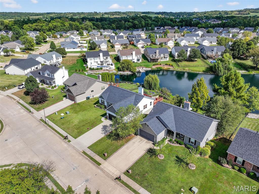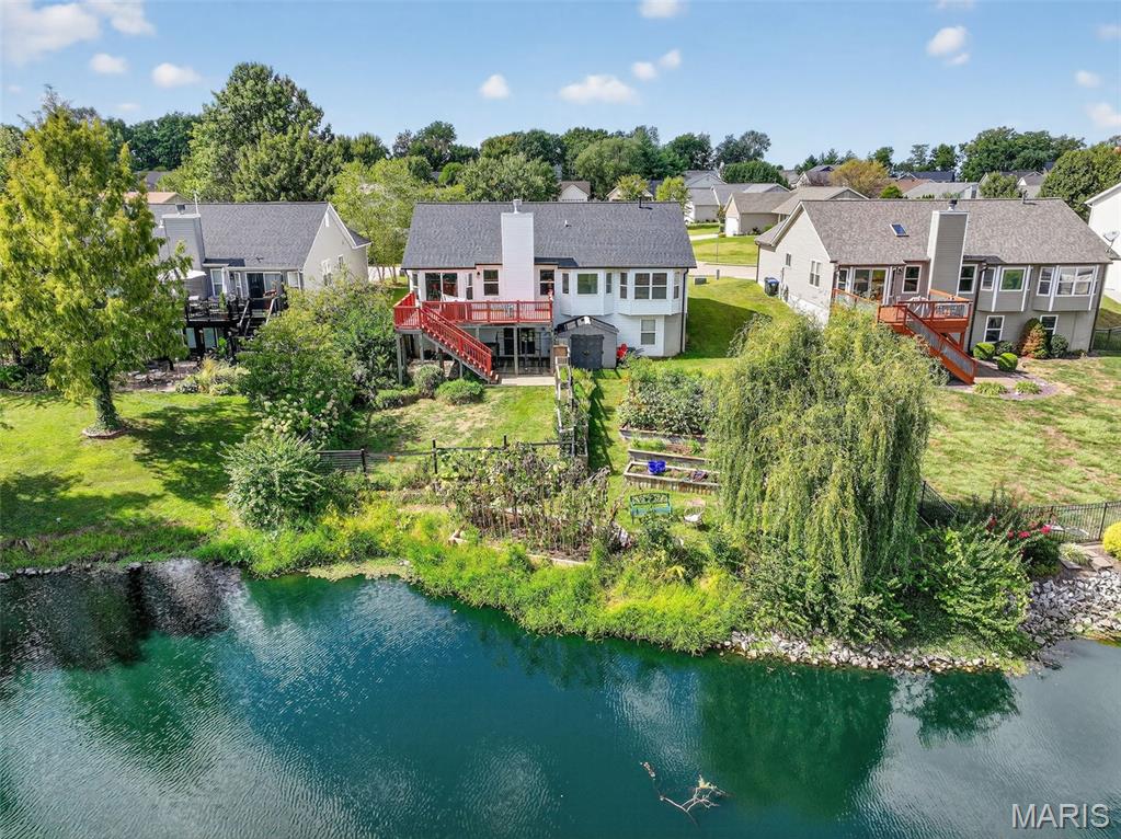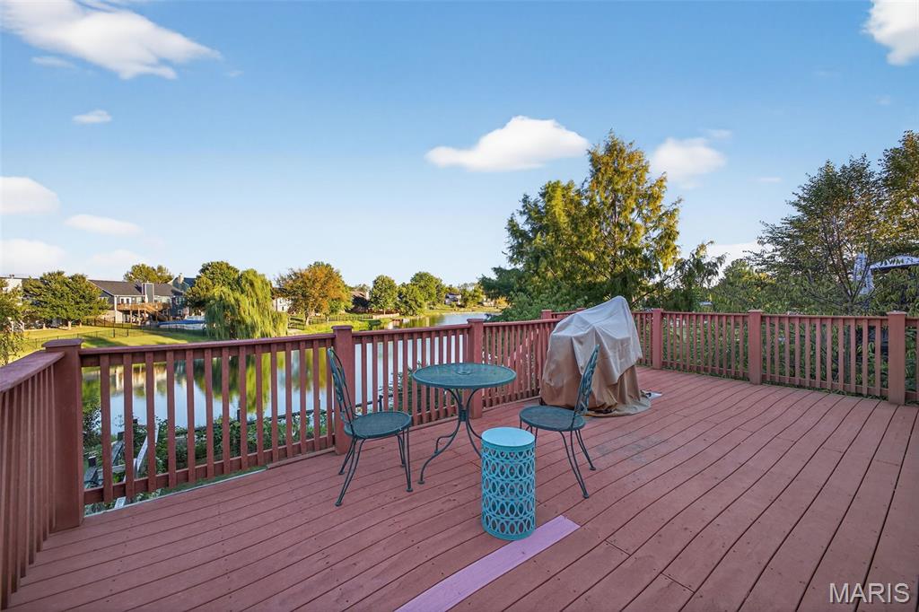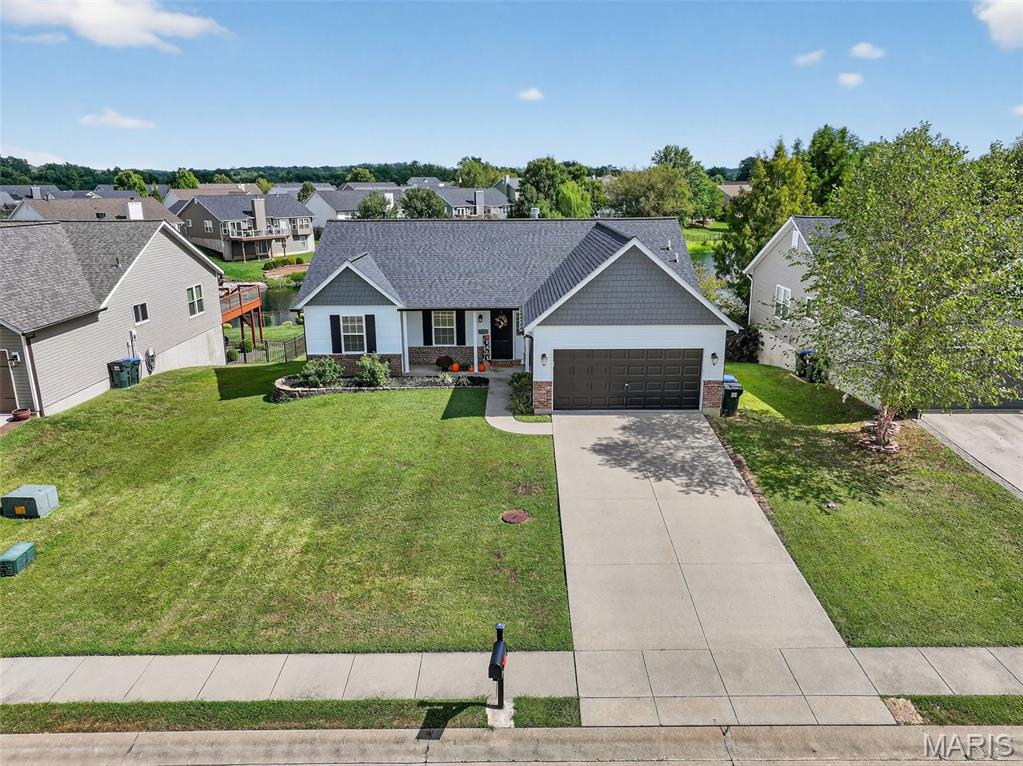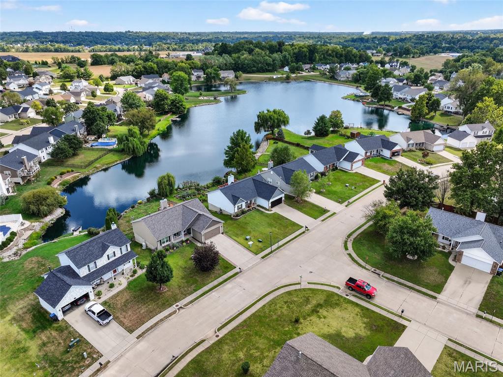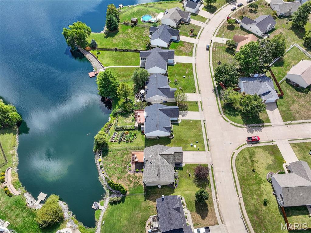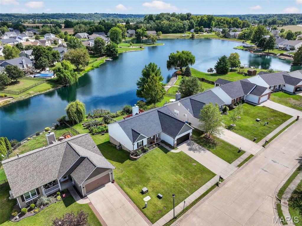 ANOTHER CHANCE AT THIS STUNNING PROPERTY WITH BRAND NEW DECK! A little bit city, a little bit country! This stunning ranch home in the highly sought-after Columbia Lakes subdivision offers a rare opportunity to own a slice of lakeside paradise, perfectly blending serene, country-like living with easy access to urban conveniences. Nestled right on the lake with breathtaking water views and direct lake access, this move-in-ready home has been updated with brand-new siding and roof, ensuring lasting beauty and durability. Step inside the freshly painted interior that exudes warmth and sophistication. The open floor plan features vaulted ceilings, abundant natural light streaming through large windows that showcase the lake, and a cozy wood-burning fireplace that anchors the living space. The heart of the home is the spacious kitchen featuring a show-stopping 10' custom-built cherrywood island, perfect for meal prep, gatherings, or casual dining, complemented by all stainless-steel appliances. The kitchen flows seamlessly into the breakfast and living areas, ideal for both entertaining & everyday living. Outdoors, enjoy a large deck & patio overlooking the lake, complete with a fire pit for cozy evenings, a full raised bed garden for gardening enthusiasts, & a fenced yard with a dedicated pet area. Additionally, find a primary suite with vaulted ceilings and a bathroom with a lake view, a walk-out basement with a wet bar, & storage space. Located minutes from the hwy, it offers quick access to STL. Lakeside living with city conveniences!