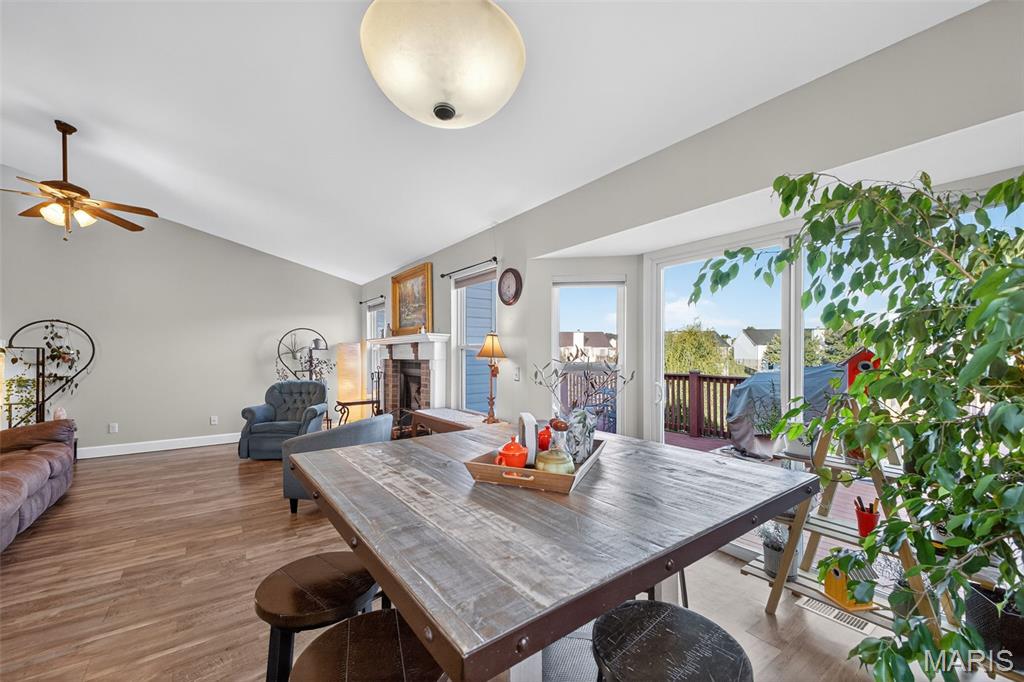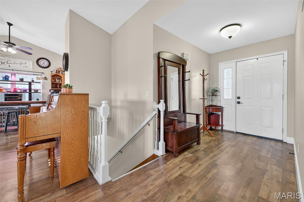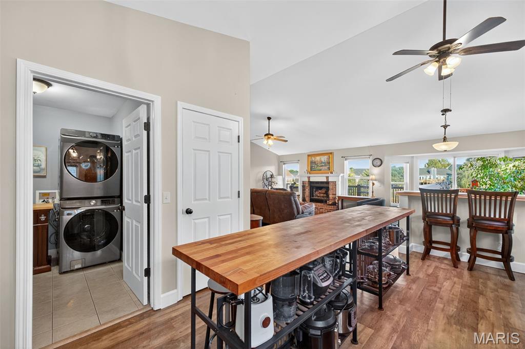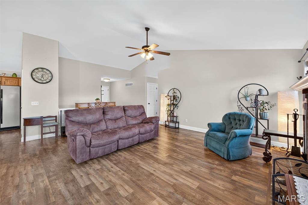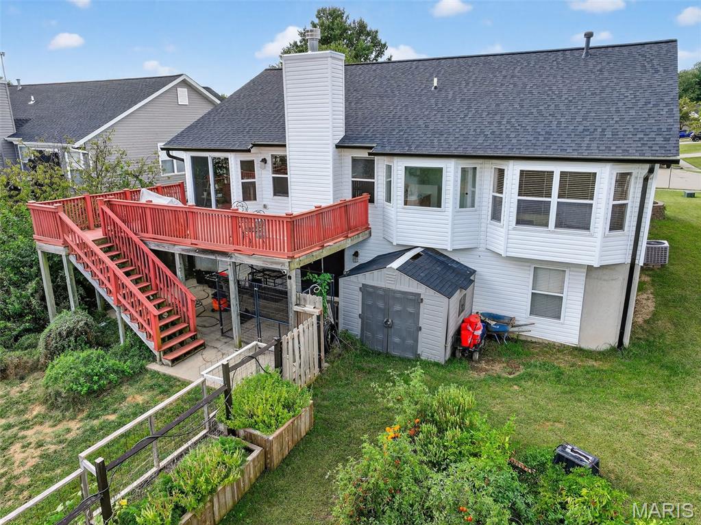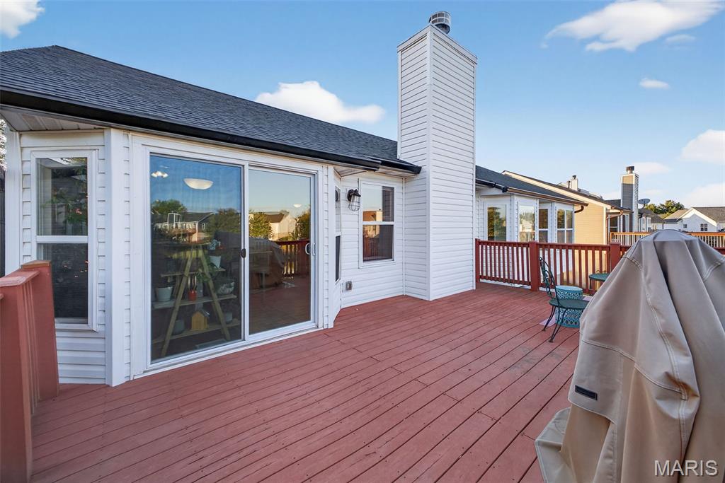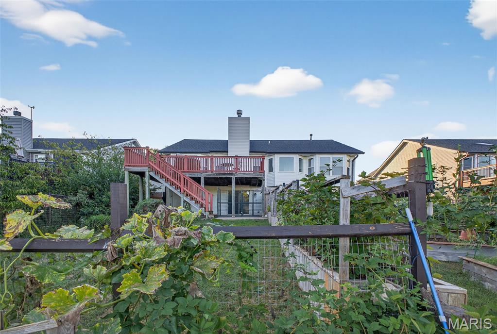 ANOTHER CHANCE AT THIS STUNNING PROPERTY WITH BRAND NEW DECK! A little bit city, a little bit country! This stunning ranch home in the highly sought-after Columbia Lakes subdivision offers a rare opportunity to own a slice of lakeside paradise, perfectly blending serene, country-like living with easy access to urban conveniences. Nestled right on the lake with breathtaking water views and direct lake access, this move-in-ready home has been updated with brand-new siding and roof, ensuring lasting beauty and durability. Step inside the freshly painted interior that exudes warmth and sophistication. The open floor plan features vaulted ceilings, abundant natural light streaming through large windows that showcase the lake, and a cozy wood-burning fireplace that anchors the living space. The heart of the home is the spacious kitchen featuring a show-stopping 10' custom-built cherrywood island, perfect for meal prep, gatherings, or casual dining, complemented by all stainless-steel appliances. The kitchen flows seamlessly into the breakfast and living areas, ideal for both entertaining & everyday living. Outdoors, enjoy a large deck & patio overlooking the lake, complete with a fire pit for cozy evenings, a full raised bed garden for gardening enthusiasts, & a fenced yard with a dedicated pet area. Additionally, find a primary suite with vaulted ceilings and a bathroom with a lake view, a walk-out basement with a wet bar, & storage space. Located minutes from the hwy, it offers quick access to STL. Lakeside living with city conveniences!
