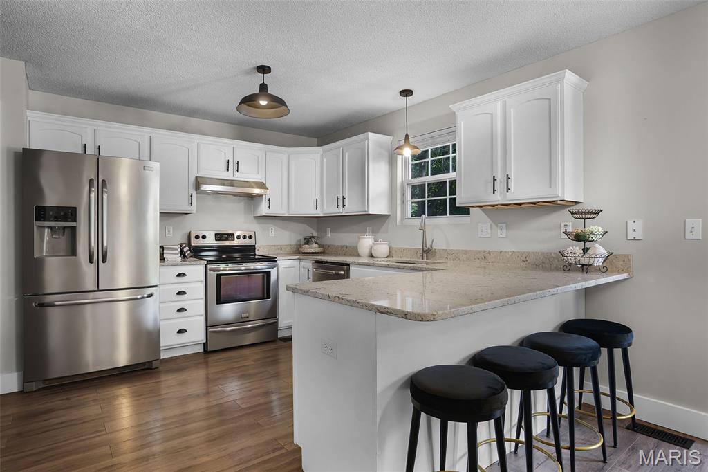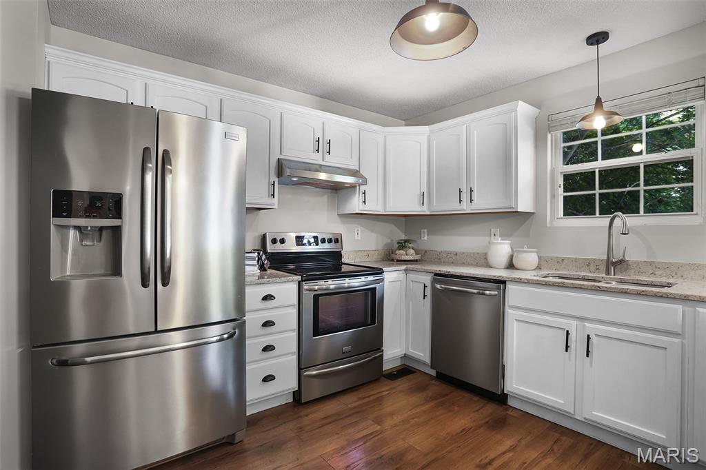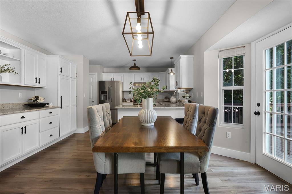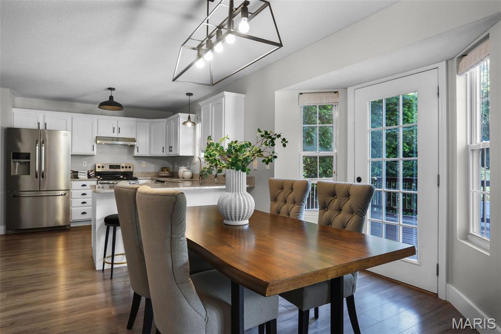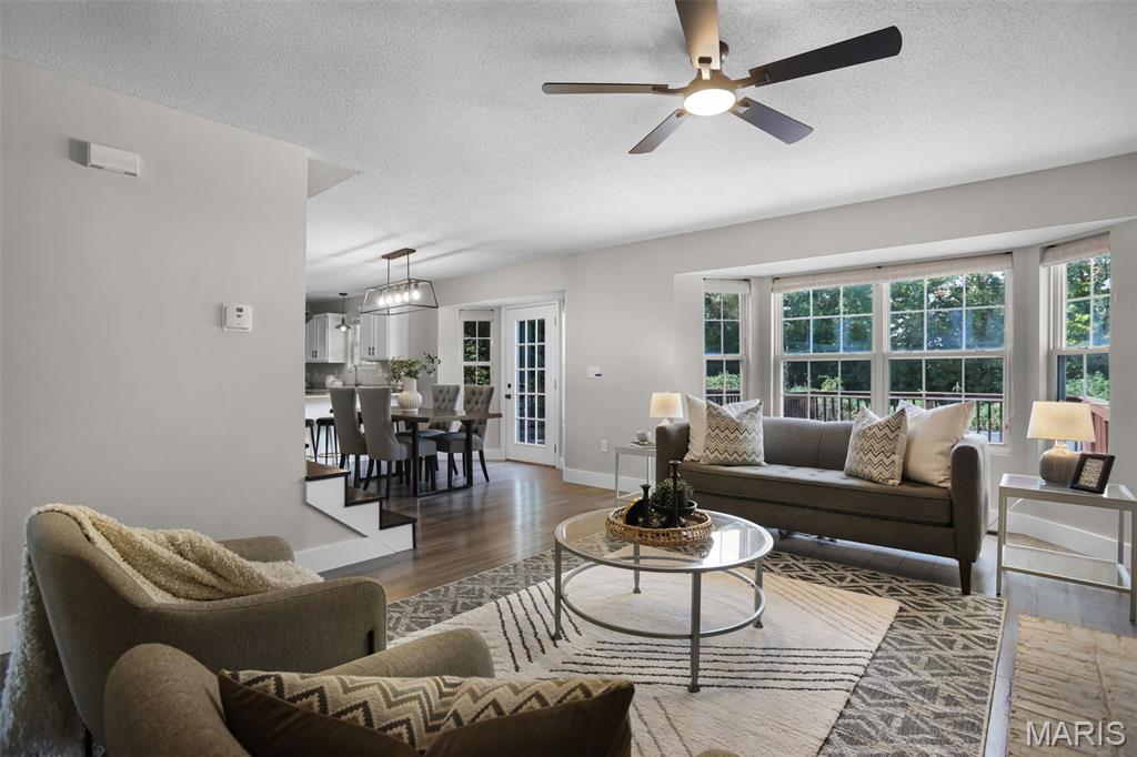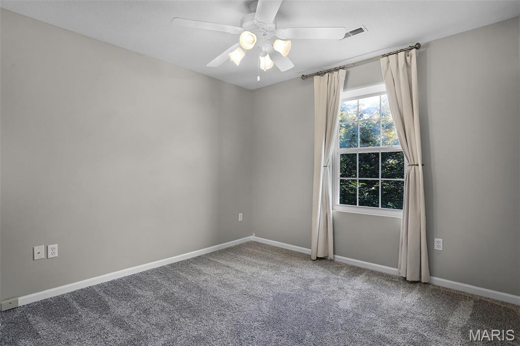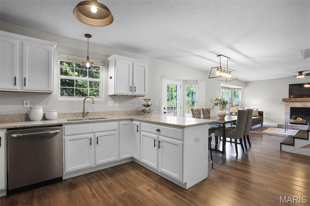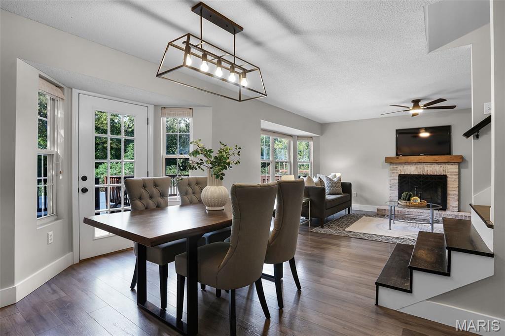 Nestled in the sought-after Huntington Place Subdivision, this charming two-story home blends comfort, style, and convenience. From the moment you step inside, you’re greeted by an inviting layout designed for both everyday living and entertaining. The front entry opens to a spacious living room, where warm laminate floors and a whitewashed brick fireplace set the stage for cozy nights at home. The kitchen is a true highlight—bright and modern with quartz countertops, stainless steel appliances, and crisp white cabinetry. A built-in coffee bar adds personality and function, while the adjoining dining area makes gatherings easy and enjoyable. Upstairs, the owner’s retreat feels open and relaxing with its vaulted ceiling, walk-in closet, and private bath. Two more generous bedrooms and an additional full bath provide plenty of space for family or guests. The finished lower level offers even more flexibility with a large family room perfect for game days or movie nights, plus ample storage to keep everything organized. Outside, unwind on the oversized deck overlooking a fenced backyard with just the right mix of sun and shade—ideal for summer cookouts or quiet evenings outdoors. With close proximity to bike trails, shopping, and major highways, this home offers a lifestyle that’s as convenient as it is enjoyable. Move right in and start making memories!