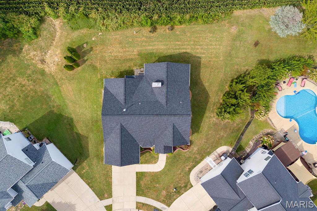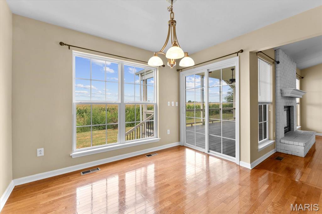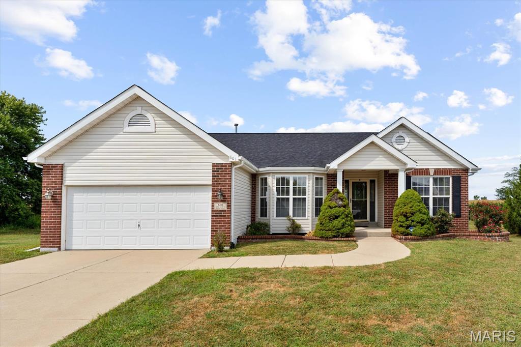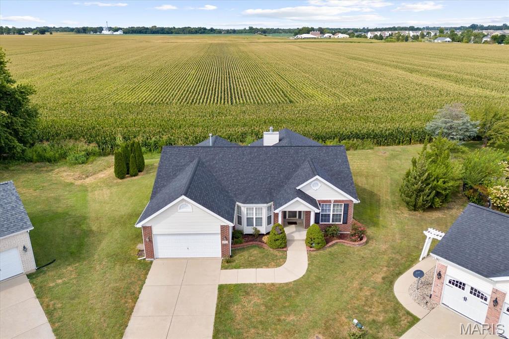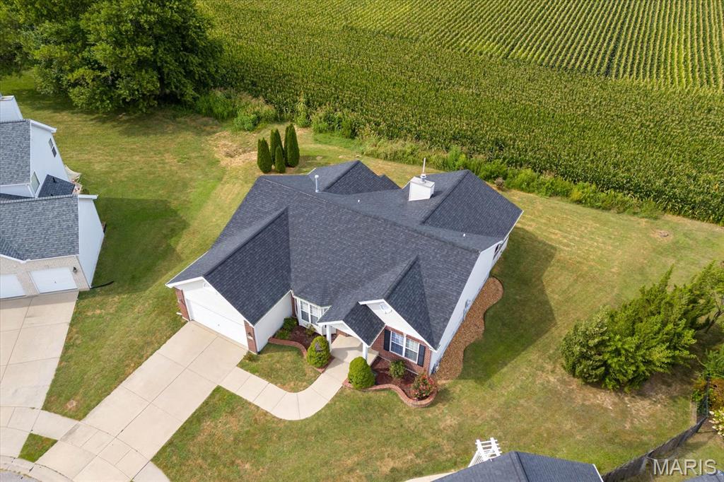 Nestled on a quiet cul-de-sac in the Fountains subdivision, this home backs to farm ground for added privacy. The open main level boasts hardwood floors, vaulted ceilings, and a bright, welcoming layout. A formal dining room with carpet and a bay window offers an inviting space for gatherings, while the kitchen features a breakfast room with direct access to the covered back deck—perfect for indoor-outdoor living. The split primary suite floorplan provides added privacy, complemented by two guest bedrooms and a full guest bath on the main level. Convenience is built in with main level laundry. The finished basement expands the living space with a spacious rec/family room, a guest bedroom that has access to the full bathroom. Meticulously maintained, this home is filled with natural light and an open, comfortable feel throughout! New roof 2025.