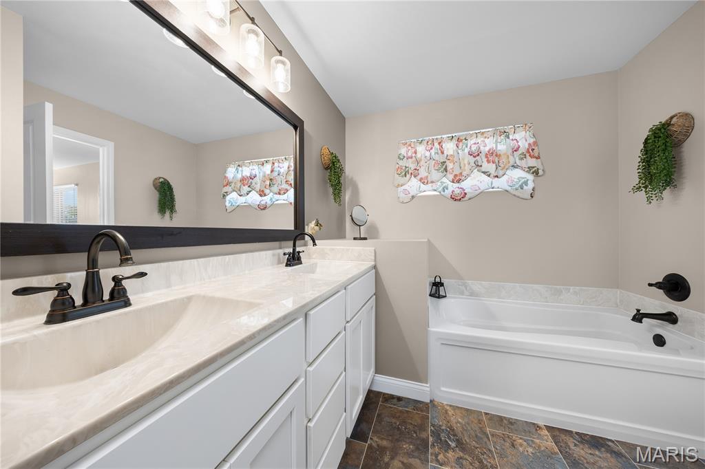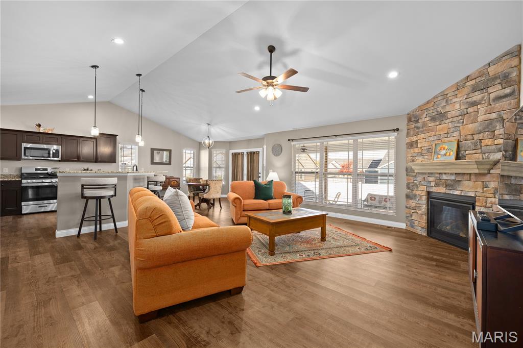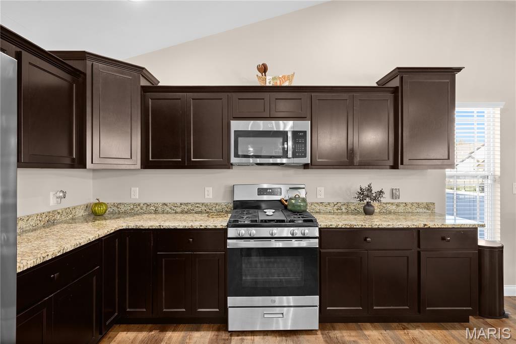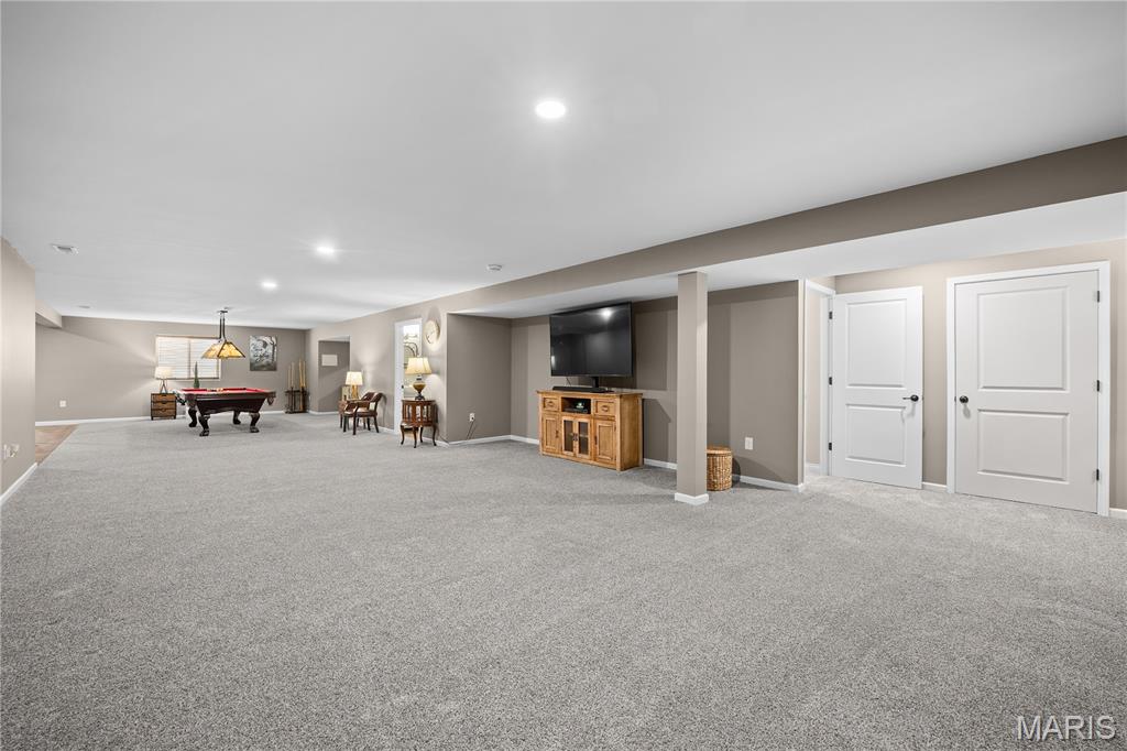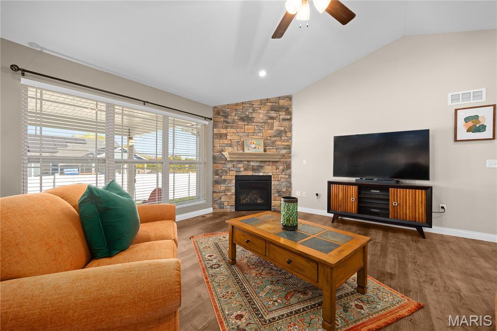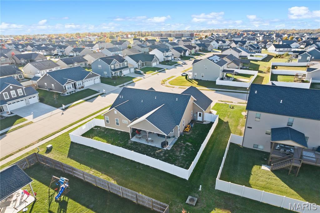 Located within the Villages of Wingate and the Mascoutah School District, this impeccably maintained corner home offers convenient proximity to a walking path, playground, Metro East bike trail, and Wingate Elementary. The residence features numerous enhancements, including granite countertops, vaulted ceilings, a contemporary-rustic fireplace, coordinated GE stainless steel kitchen appliances, Maytag washer and dryer, engineered wood flooring throughout, ceramic-tiled bathroom floors, marble window sills, and abundant natural lighting. The master suite is distinguished by French doors opening into a spacious bedroom with an expansive walk-in closet, dual-sink vanity, separate shower, and a soaking tub. The professionally finished basement provides a family room, gym area, half bath with plumbing & space prepared for a future shower, bonus game or reading nook, and an egress window that easily allows for conversion into a fourth bedroom. Outdoor amenities include a 31-foot-long covered patio enclosed by a six-foot backyard vinyl fence, as well as a landscaped front yard with a 29-foot covered porch ideal for relaxation. Additional offerings comprise a finished garage, whole-house dehumidifier, smart thermostat, and an ADT smart security system featuring four exterior cameras, a ring doorbell, and window/door sensors.