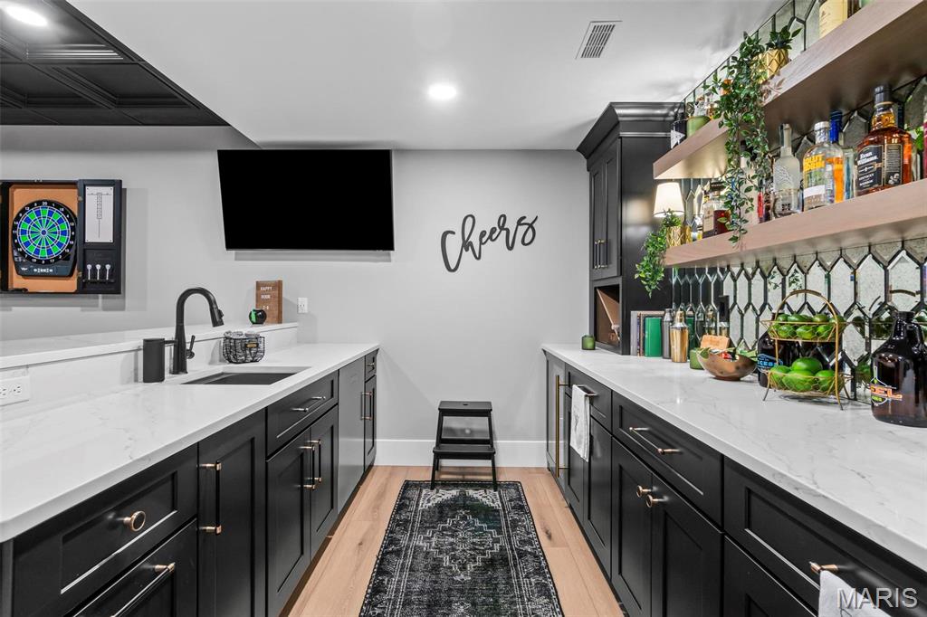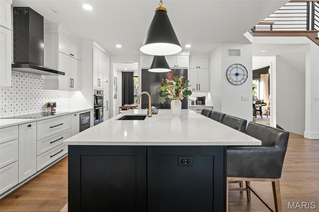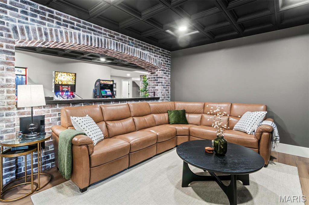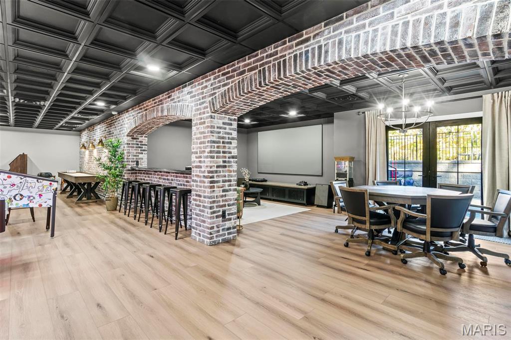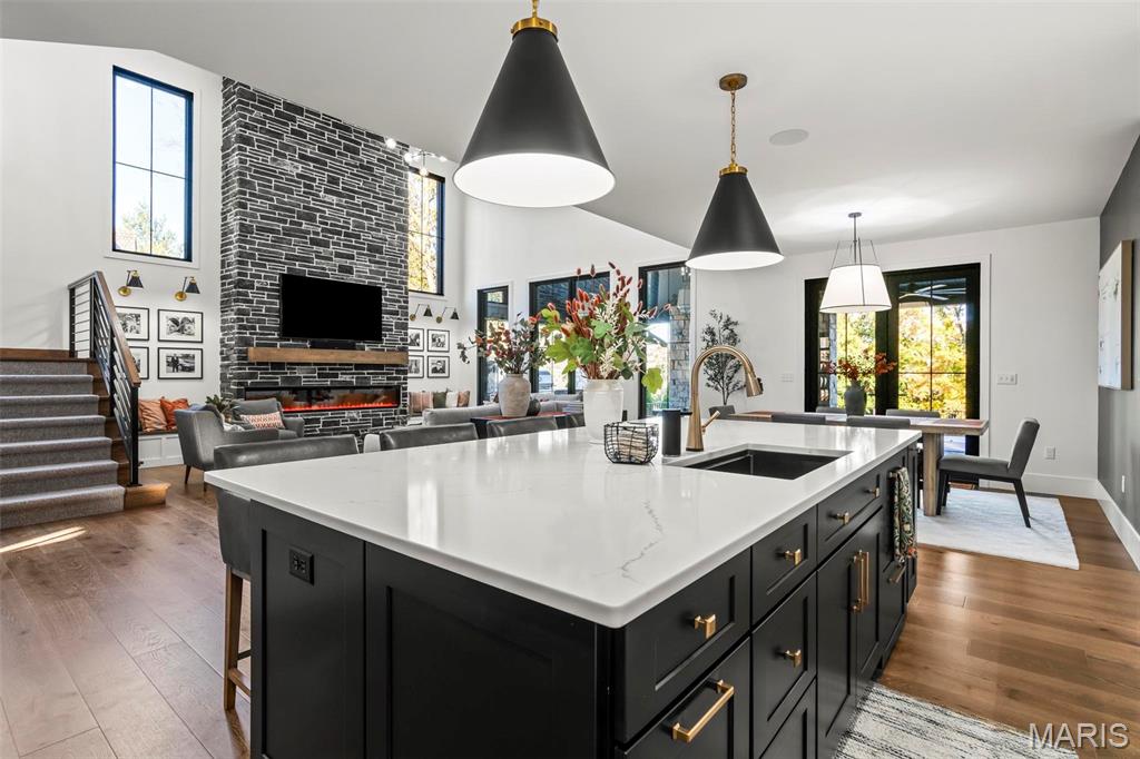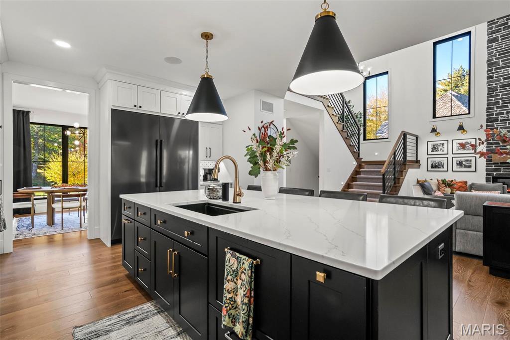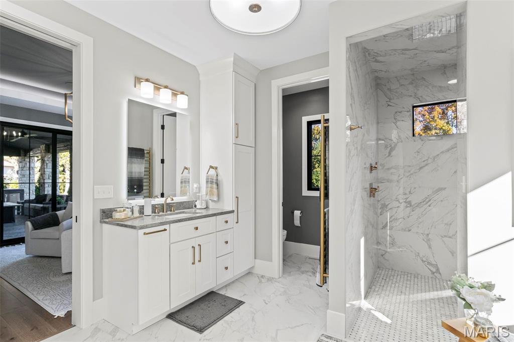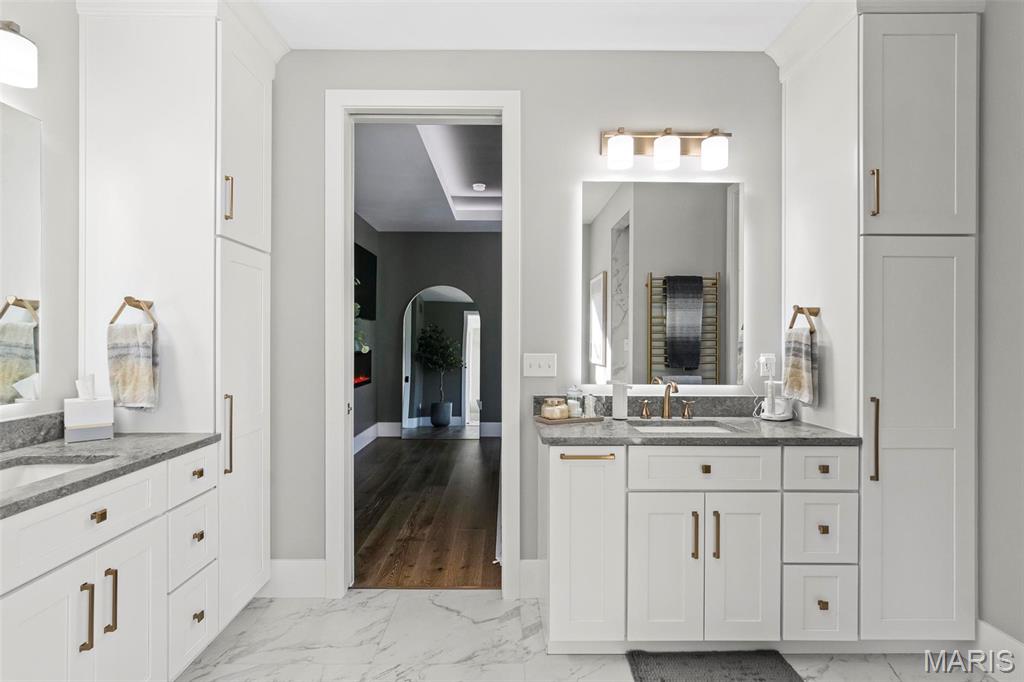 Welcome to 22 Southbridge Ln, a rare opportunity to own one of the most custom and luxurious homes in Edwardsville’s prestigious Stonebridge subdivision. Newer construction, built in 2022, and perfectly situated on nearly an acre, this estate blends timeless sophistication, advanced technology, and impeccable craftsmanship. From the moment you enter, the quality is unmistakable. The main level showcases wide-plank engineered hardwood floors, architectural ceilings, designer lighting, and a spacious open floor plan. The chef’s kitchen features custom cabinetry, an oversized island, and a high-end Dacor appliance package, all finished with exceptional detail. Adjacent to the kitchen is a formal dining room, ideal for entertaining, and a dedicated office with custom built-ins, providing a refined workspace that complements today’s lifestyle. The primary suite offers a true spa-like retreat with heated bathroom floors, heated shower floor, and a heated towel rack, along with peaceful views overlooking the backyard and pool area. Upstairs, you’ll find two large bedrooms connected by a stylish Jack-and-Jill bathroom, plus a versatile loft area perfect for a study nook, playroom, or additional lounge space—providing flexibility for family and guests. The finished lower level is built for entertainment and leisure, featuring a theater area, full bar, and immersive audio system. Hidden design elements elevate the space: a custom bookshelf conceals the home’s advanced mechanicals—including the HVAC, ERV, and scent diffusion system—while another hidden door leads to a private storage area and a reinforced safe room that is both tornado- and fire-rated. Behind the luxury finishes lies a foundation of engineering excellence. The home is equipped with 400-amp electrical service, a full-house generator with automatic transfer switch, whole-house water filtration system with app-monitored flow, dual backup sump pumps, dual water supply, steam humidifier, and MERV-16 air filtration for unmatched comfort and air quality. Every system was selected for reliability, efficiency, and long-term performance. The outdoor living space is truly resort-caliber. The four-layer anti-slip patio, covered entertaining area, and luxury outdoor kitchen complete the backyard oasis—featuring a hybrid grill, built-in refrigerator, generous counter space, and integrated lighting. Whether hosting a party or enjoying a quiet evening poolside, this outdoor space is second to none. Built with precision, maintained with care, and finished to perfection, 22 Southbridge Lane stands as one of Edwardsville’s most impressive residences. With unmatched quality, innovative systems, and exquisite design throughout, this home defines modern luxury living.