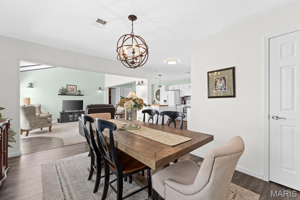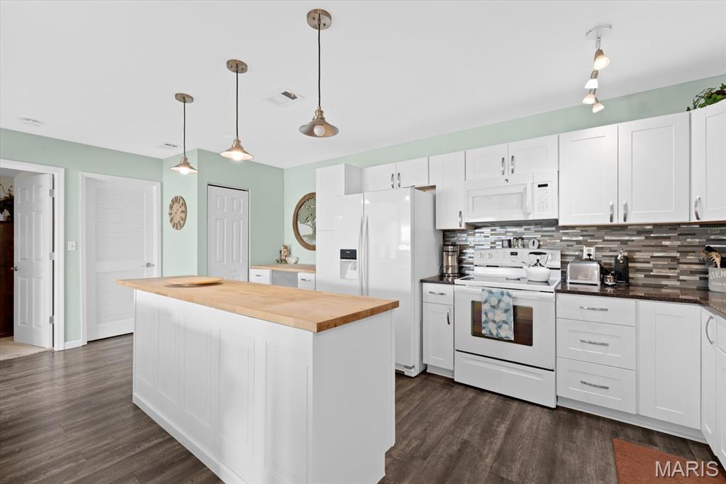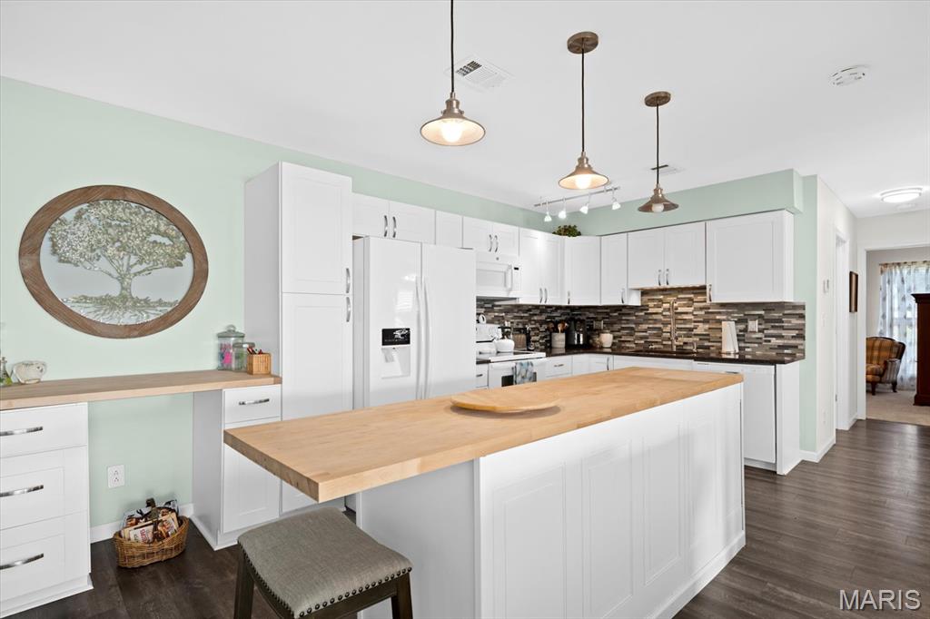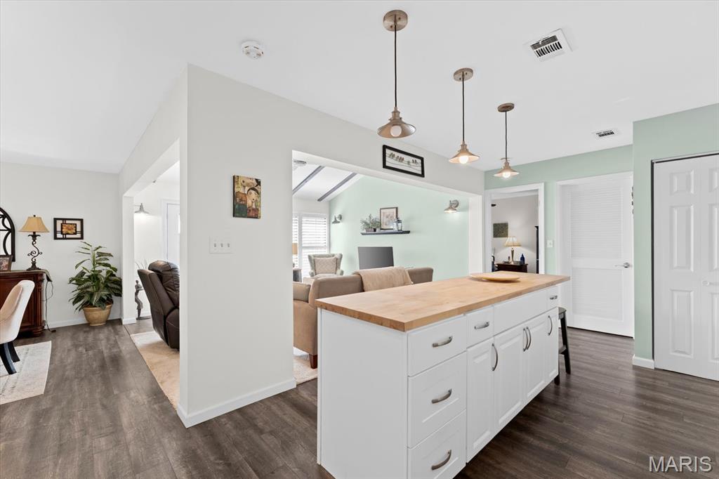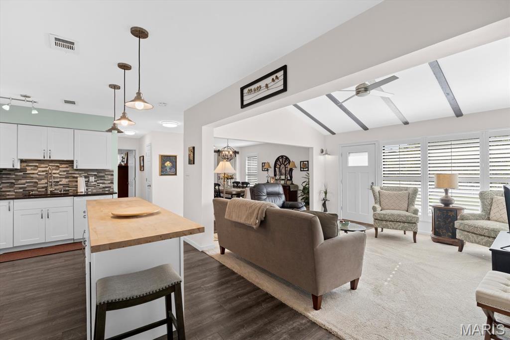 This inviting 3 bedroom, 2 full bath home offers a bright, beautifully updated interior with a warm, open flow that’s perfect for everyday living. The living room features vaulted ceilings with stylish exposed beams, abundant natural light, and a seamless connection to the dining area, creating a comfortable and welcoming atomosphere. The kitchen is a true standout—fresh, modern, and thoughtfully designed. Enjoy updated white cabinetry, a spacious butcher-block island, attractive backsplash detailing, and generous counter space ideal for cooking, gathering, and entertaining. Pendant lighting adds charm, while the open layout keeps the kitchen connected to the main living spaces. With its peaceful cul-de-sac setting, newer finishes, and clean, well-maintained feel throughout, this home is truly move-in ready. Conveniently located near shopping, dining, parks, and Scott AFB-comfort, style, and everyday convenience all in one place. Buyers & agents are responsible for verifying accuracy of all MLS data.