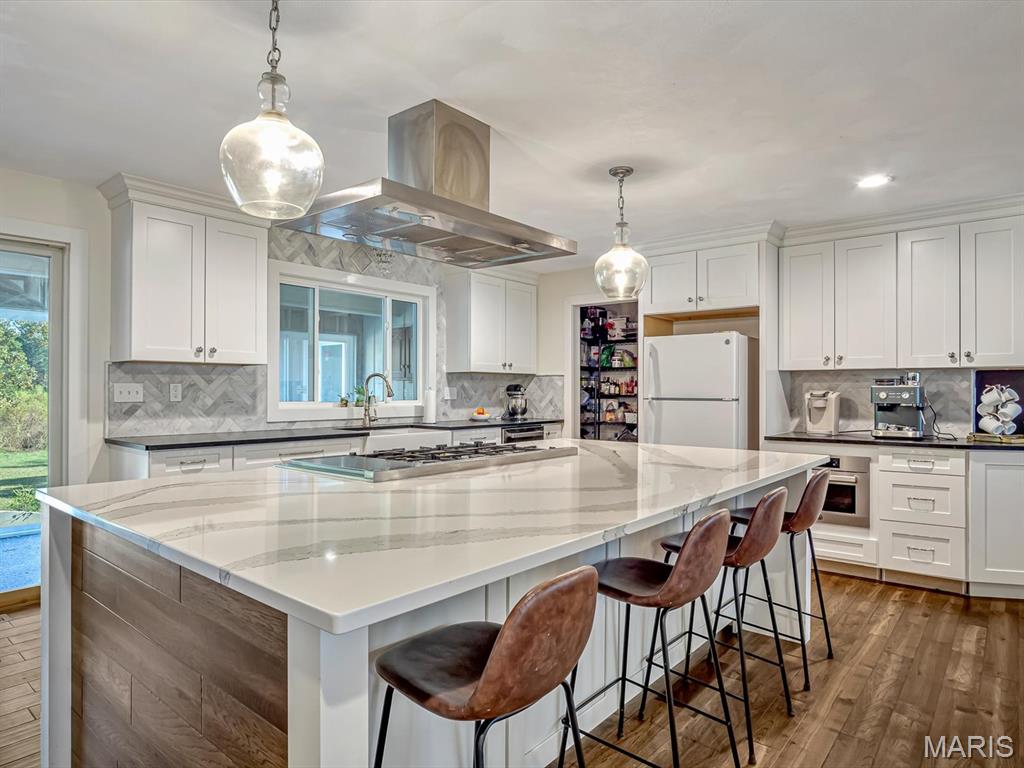Discover peaceful rural living on 12 picturesque acres featuring a private pond, flowing creek, and serene wooded surroundings. This beautifully updated one-story home offers a rare blend of modern finishes and inviting charm. Inside, you'll find premium wood flooring, remodeled bathrooms, and a stunning kitchen designed for both everyday living and entertaining. The kitchen features a large custom island, quartz and honed granite countertops, and an adjoining wet bar complete with refrigeration drawers and an undermount ice maker. The spacious primary suite includes a beautifully updated en suite bathroom and a cleverly designed hidden closet. Two tankless water heaters add efficiency and comfort throughout the home. Enjoy quiet mornings or relaxing evenings in the large enclosed porch overlooking the peaceful backyard and natural landscape. The unfinished walkout basement provides an excellent opportunity to expand your living space and customize it to your needs, whether you envision a recreation room, home gym, workshop, or additional bedrooms. The property also includes two generous outbuildings with electric service and concrete pads—ideal for equipment storage, hobbies, or converting into workshop or studio space. While the home boasts extensive updates and improvements, a few unfinished projects remain, giving the next owner the opportunity to add personal touches and make the space truly their own. With its open layout, beautiful finishes, and exceptional outdoor amenities, this property is a rare find. Enjoy the privacy, space, and natural beauty of rural living with the convenience of a thoughtfully updated home ready to welcome its next owner.