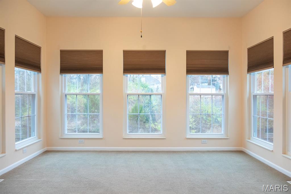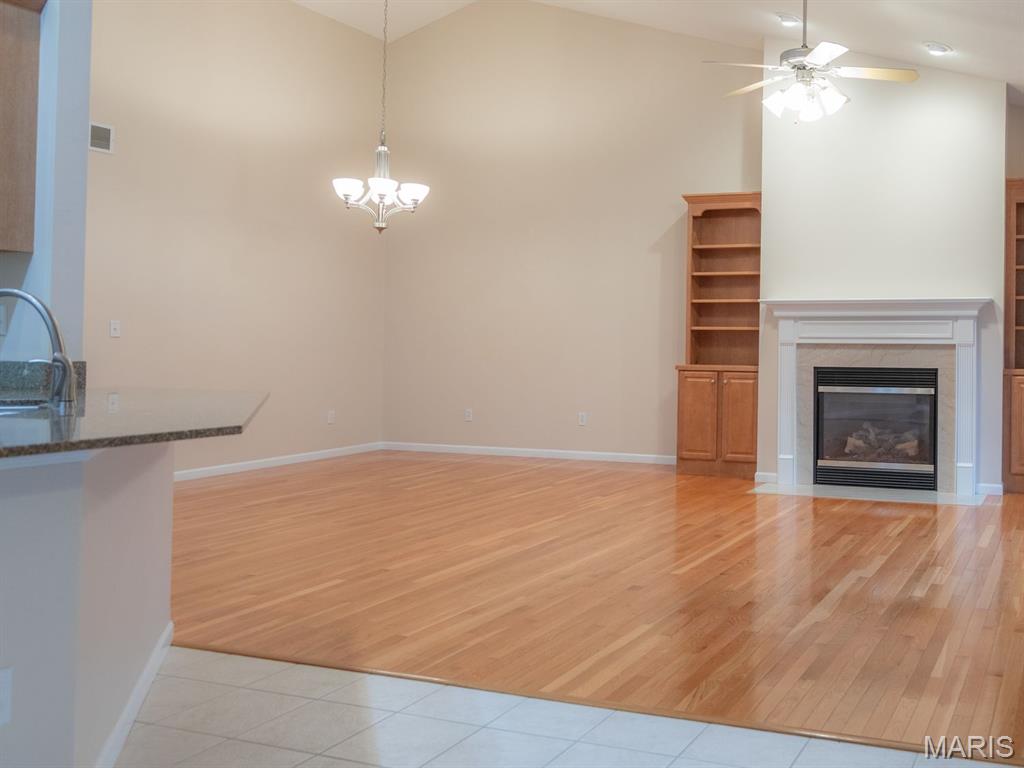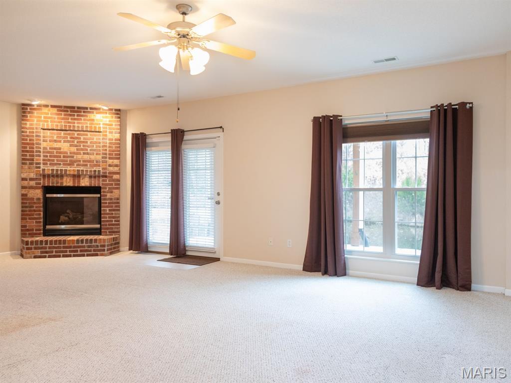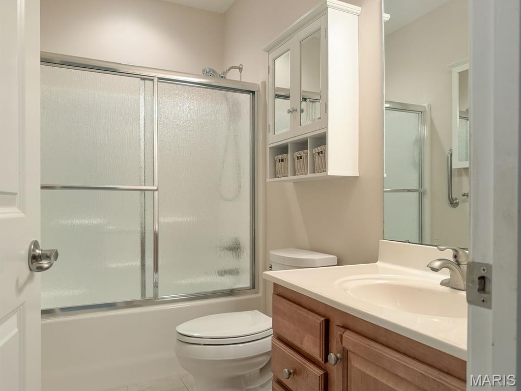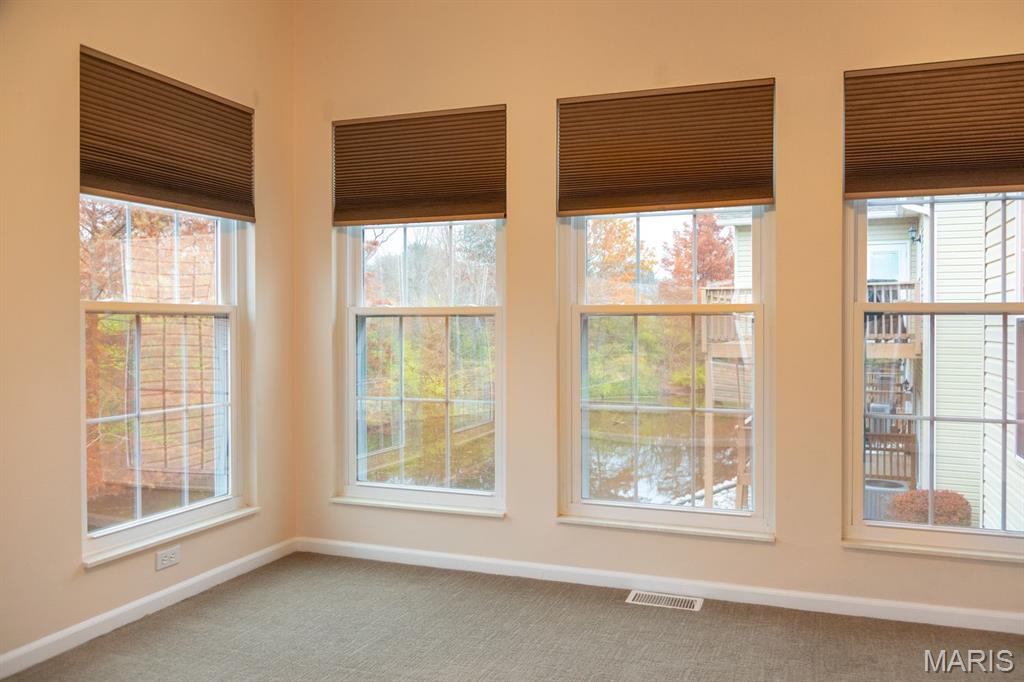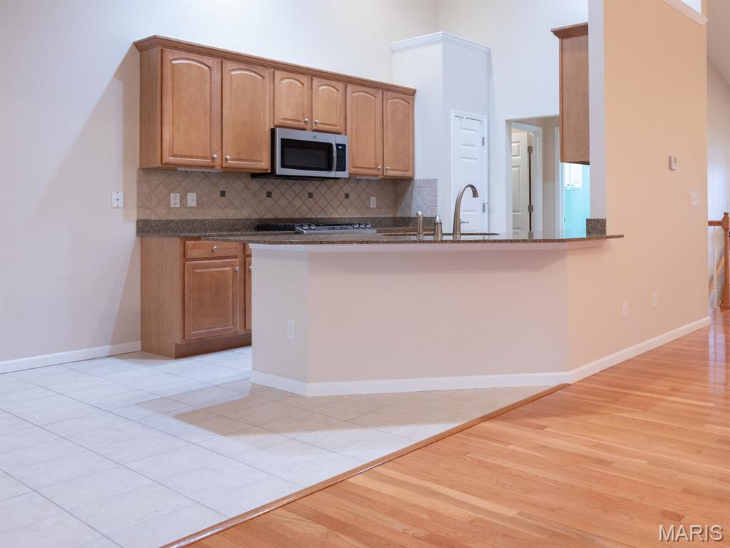 THE VILLAS OF STONEBRIDGE COMMUNITY OF MARYVILLE - This home features a large entry way, front guest bedroom with a full hall bathroom. You will love the beautiful dining room/living room with hardwood floors, bookcases and brick floor to ceiling gas log fireplace that opens to a lovely kitchen with granite countertops, ceramic backsplash, maple cabinets and gas stove. Relax in the cheerful sunroom and look out at the peaceful pond. Do not miss the large primary suite and bath with dual sinks, whirlpool tub, separate shower and walk in closet. There is a main floor laundry off the garage. In the lower level you will enjoy a third bedroom with large walk in closet, third full bathroom, large family room, second brick, gas log fireplace, wet bar area with space for a refrigerator, furnace room & workshop room. Walk out to the large patio (24' x 11') and enjoy the view of the pond. Some Updates: Furnace/ac & hot water heater 2023, Roof 2017 and updated windows. Call your favorite agent now for a showing. Close to walking/bike trails, interstates, shopping.