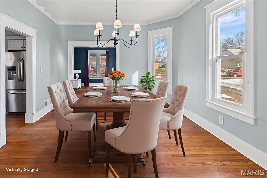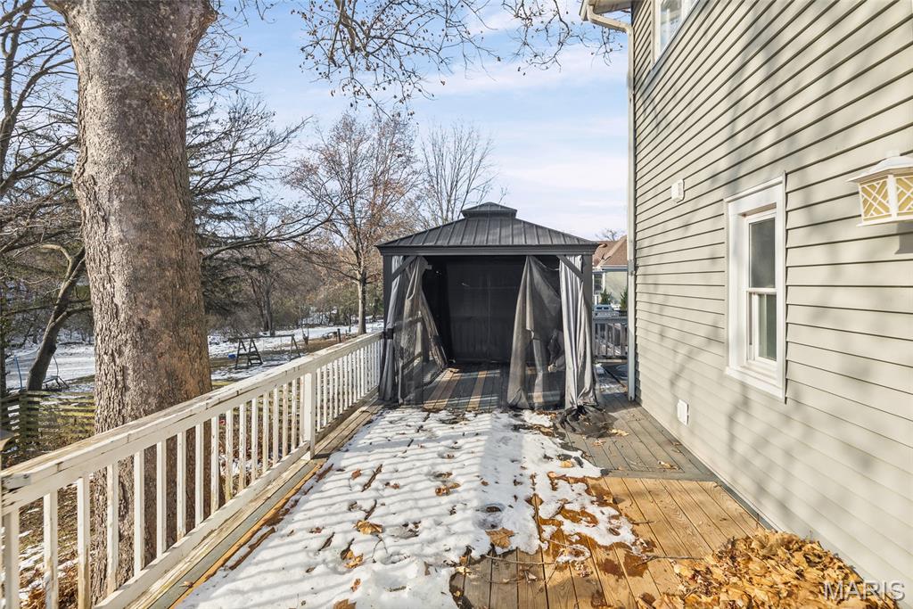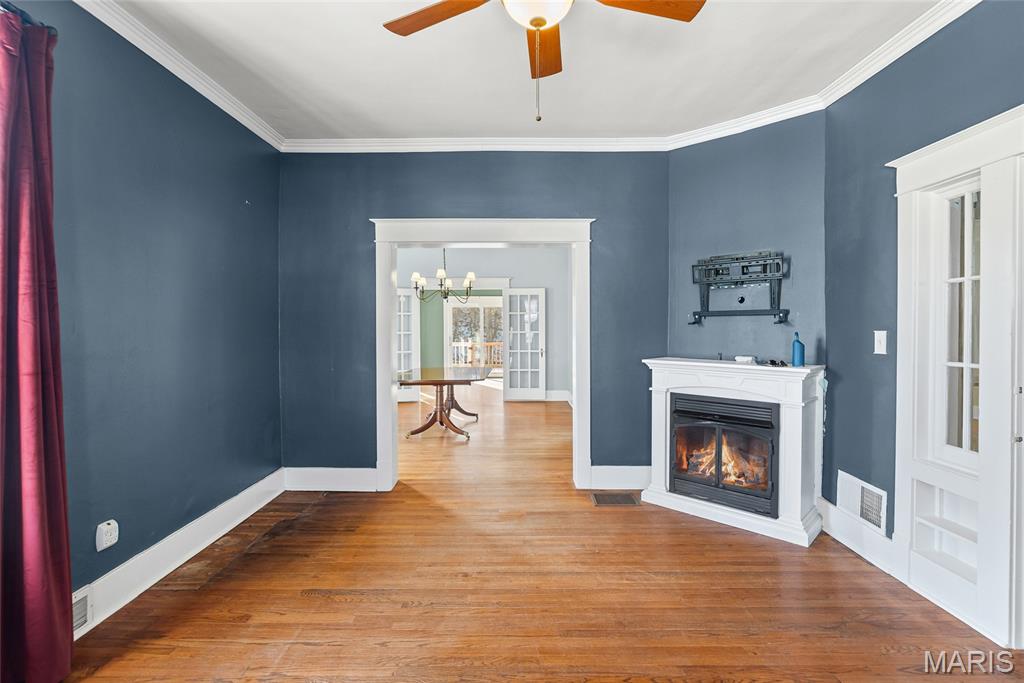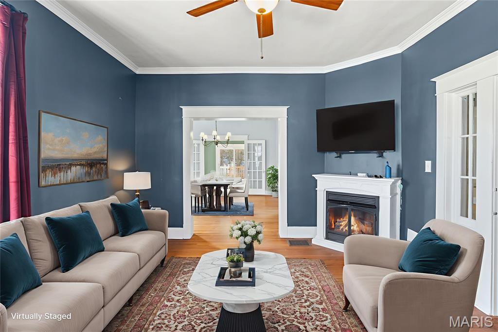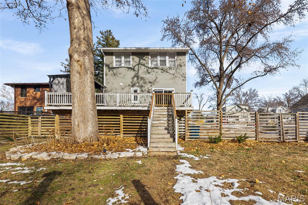 Step into timeless character and modern comfort in this beautifully preserved 1905 historic home in the heart of Alton. Featuring 3 bedrooms and 2 full bathrooms, this home blends original charm with thoughtful updates throughout. Stunning original hardwood floors flow through the home, complemented by large newer windows that flood each space with natural light. The updated kitchen is a true highlight, showcasing crisp white cabinetry, quartz countertops, stainless steel appliances including a gas range, and a classic subway tile backsplash. The main level offers a spacious living room with a cozy gas fireplace, formal dining room, updated kitchen, full bathroom, and a comfortable family room that opens directly to the expansive deck—perfect for entertaining or relaxing outdoors. Upstairs you’ll find three bedrooms, a second full bath, and a primary suite with an attached bonus room ideal for a home office, sitting area, or nursery. A large second-floor laundry room adds everyday convenience, with washer and dryer included. Outside, enjoy the rare 3/4-acre lot with a fenced backyard and oversized deck overlooking the peaceful setting. HVAC replaced in 2023. This is a special opportunity to own a historic home with modern upgrades, abundant space, and a beautiful outdoor retreat—don’t miss it!