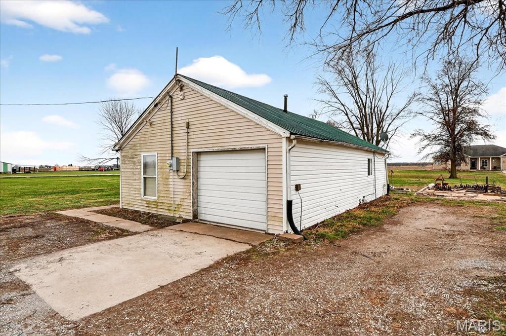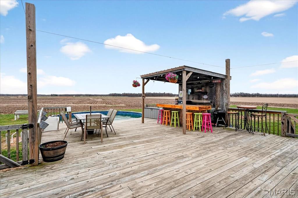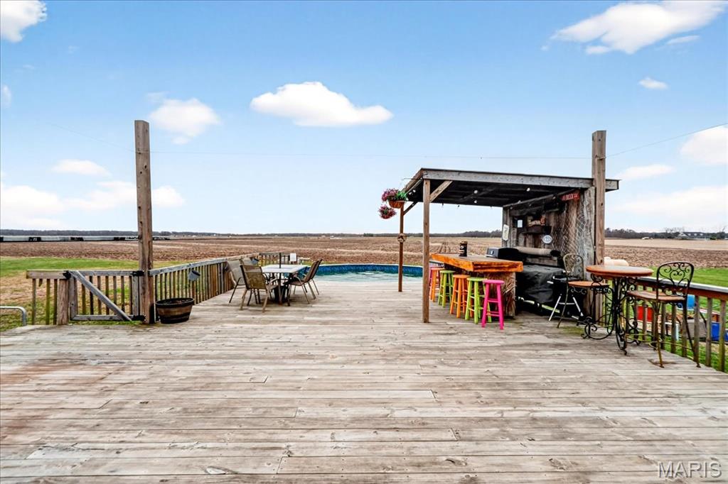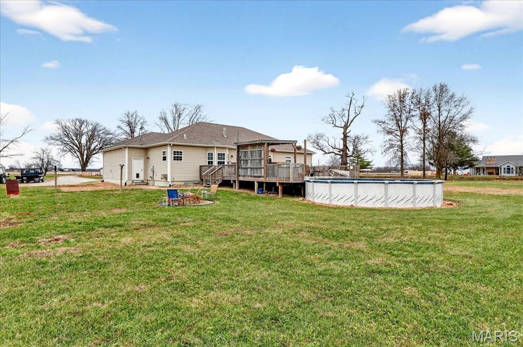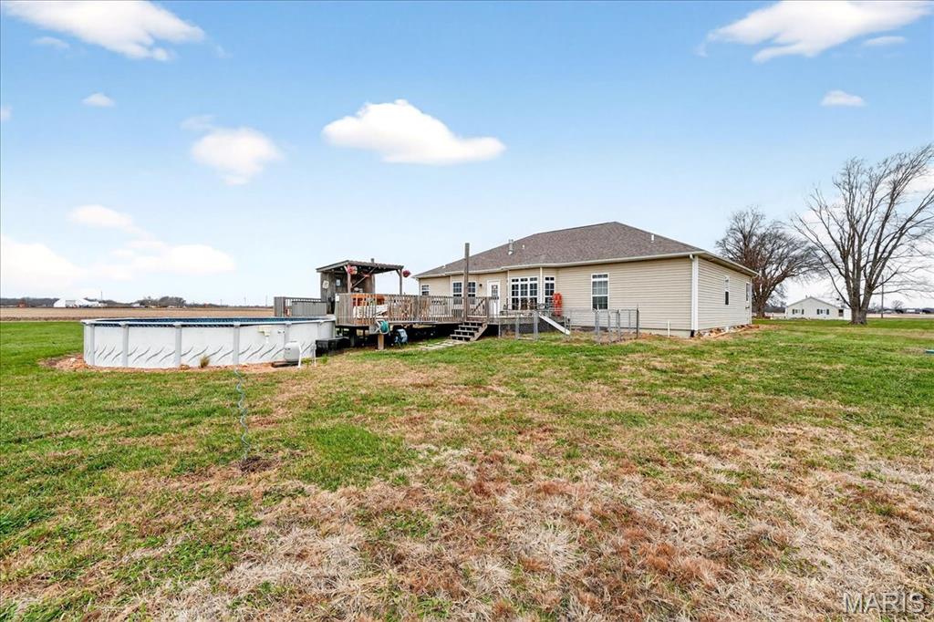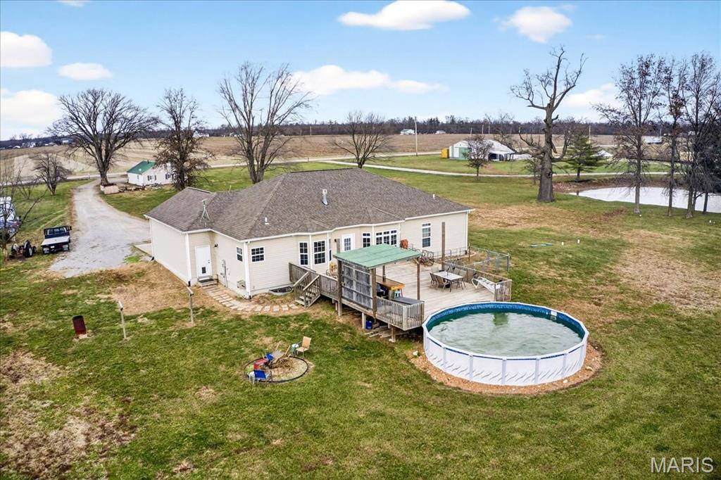 Spacious country living on 3.22 acres! This well-maintained ranch features an open floor plan with 9-ft ceilings and abundant natural light. The inviting living area includes a double-sided fireplace and flows into a large kitchen with quartz countertops, soft-close cabinetry, ample counter space, and an eat-in dining area. Additional highlights include central vacuum and an efficient geothermal HVAC system. The primary suite offers a private ensuite bath, while additional bedrooms provide flexibility for guests or home office use. Main-floor laundry adds convenience, and Bluetooth speakers in the kitchen and primary shower offer a modern touch. Enjoy outdoor living on the expansive deck with an above-ground pool and custom tiki bar—ideal for entertaining. The home features an oversized attached garage with built-in workbench and shelving, plus an oversized detached garage/workshop. The full basement offers extensive storage and future potential. Located just 3 miles from schools, shopping, and dining.