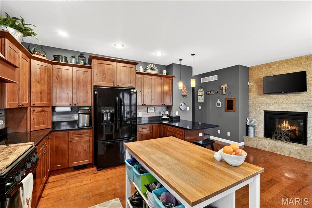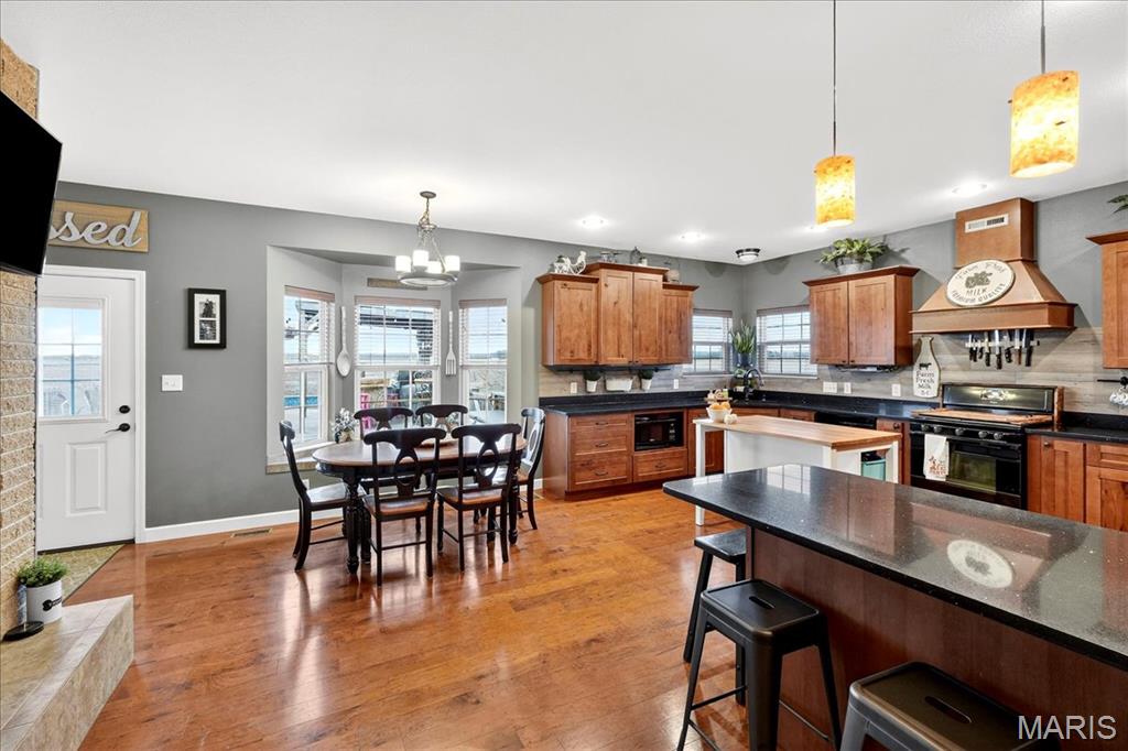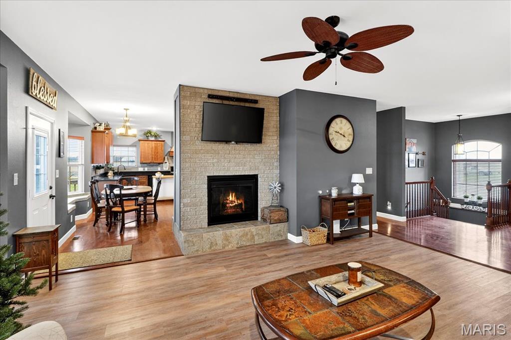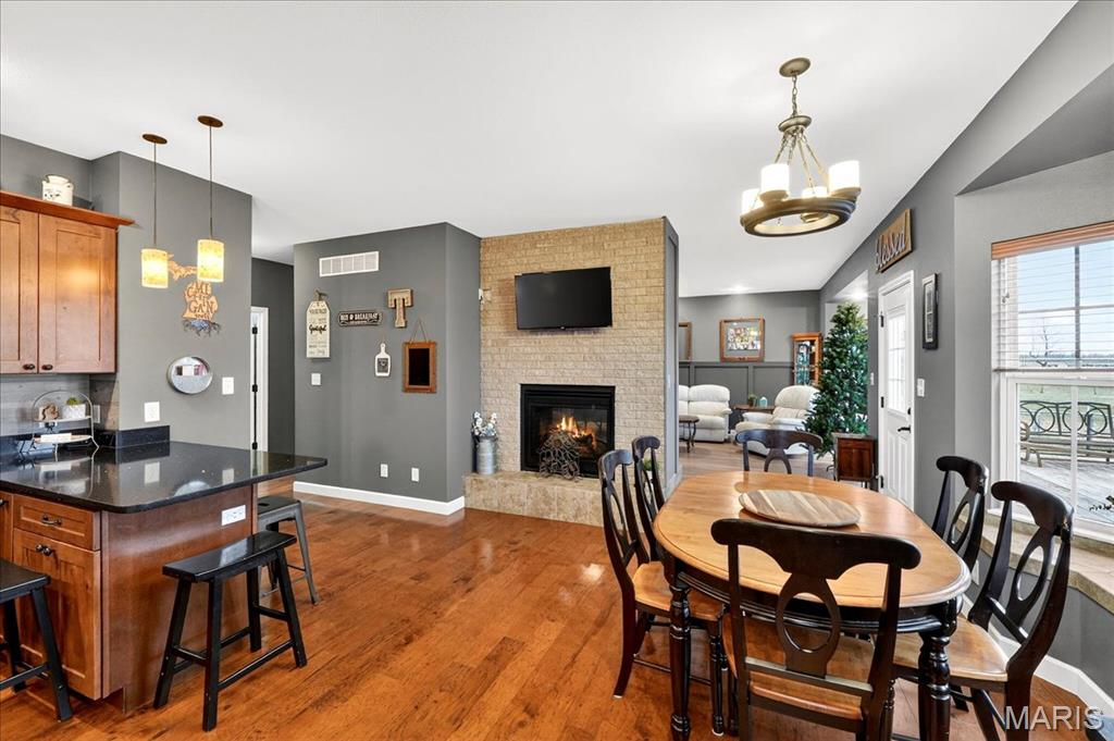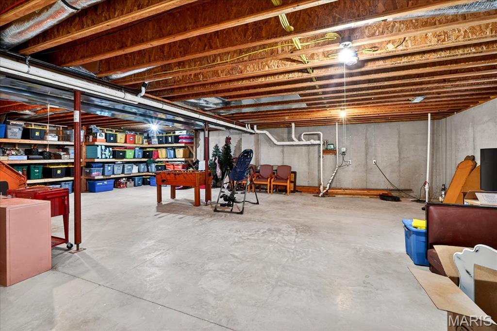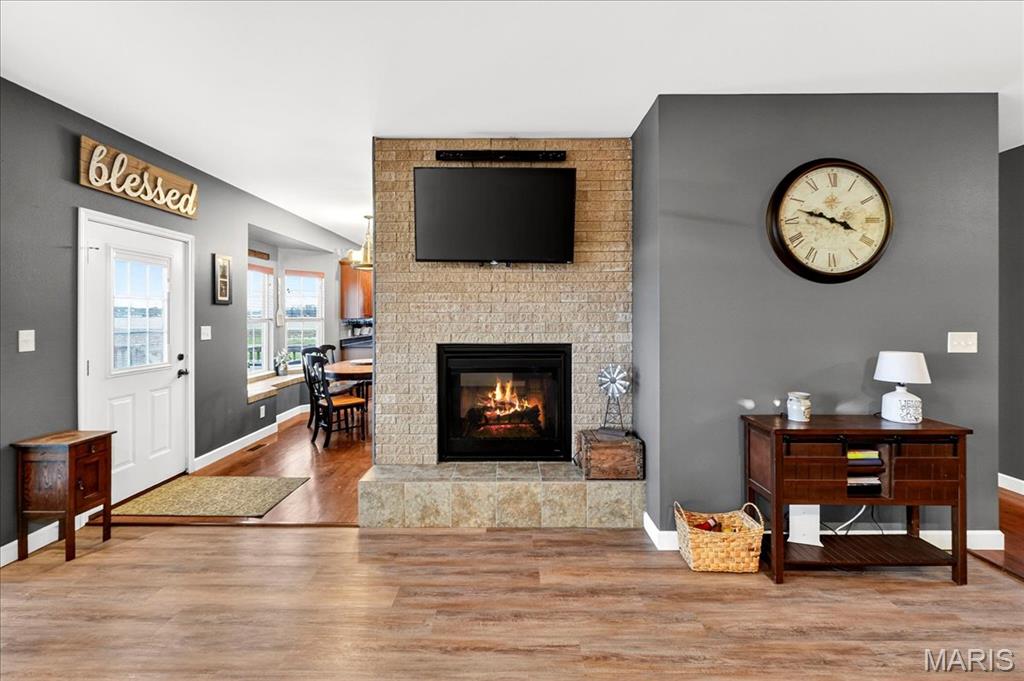 Spacious country living on 3.22 acres! This well-maintained ranch features an open floor plan with 9-ft ceilings and abundant natural light. The inviting living area includes a double-sided fireplace and flows into a large kitchen with quartz countertops, soft-close cabinetry, ample counter space, and an eat-in dining area. Additional highlights include central vacuum and an efficient geothermal HVAC system. The primary suite offers a private ensuite bath, while additional bedrooms provide flexibility for guests or home office use. Main-floor laundry adds convenience, and Bluetooth speakers in the kitchen and primary shower offer a modern touch. Enjoy outdoor living on the expansive deck with an above-ground pool and custom tiki bar—ideal for entertaining. The home features an oversized attached garage with built-in workbench and shelving, plus an oversized detached garage/workshop. The full basement offers extensive storage and future potential. Located just 3 miles from schools, shopping, and dining.