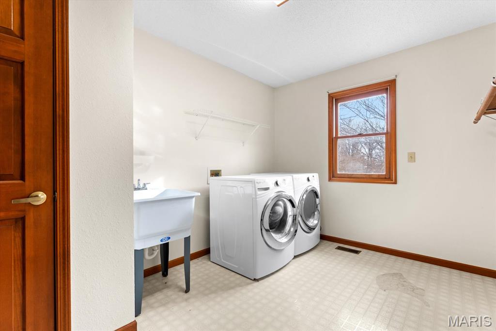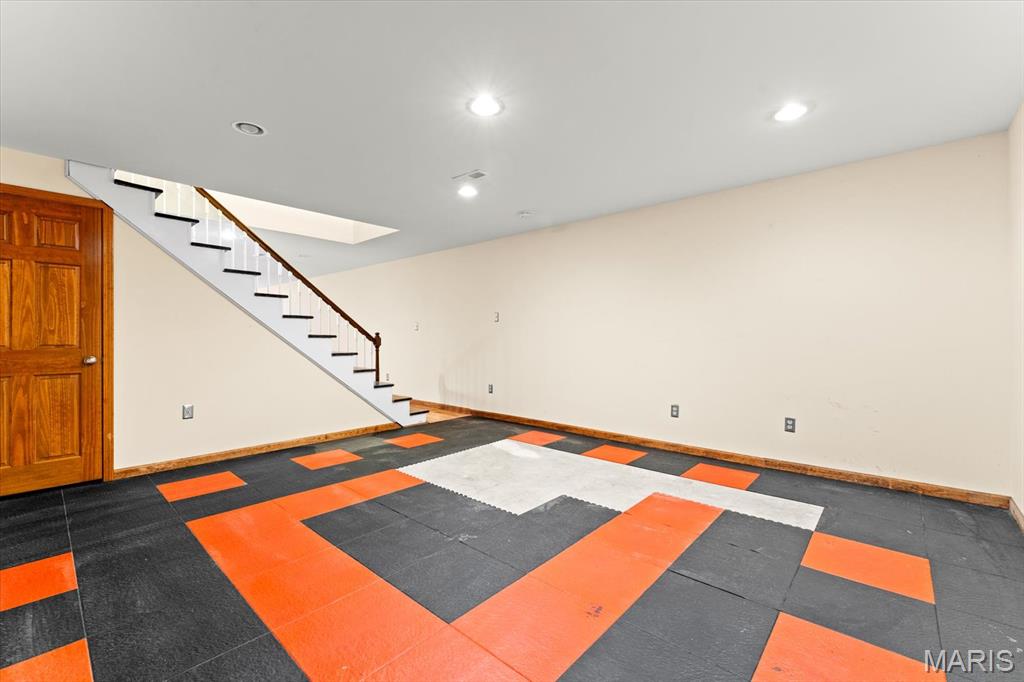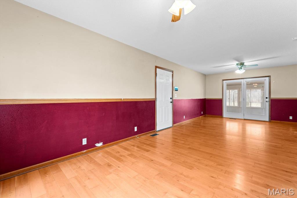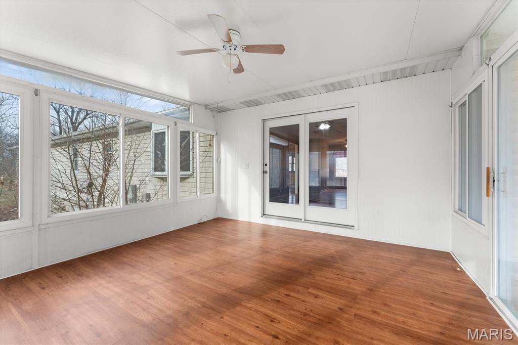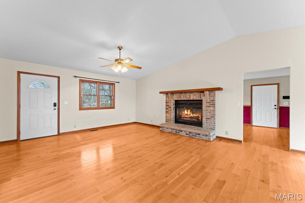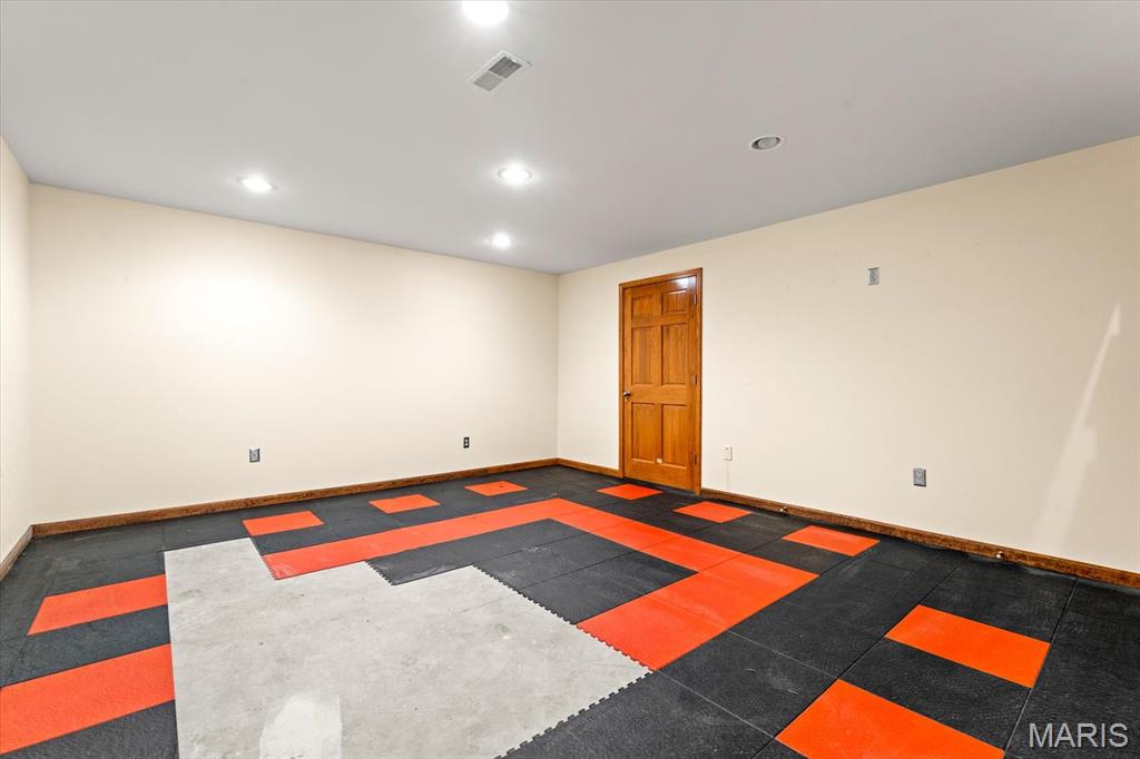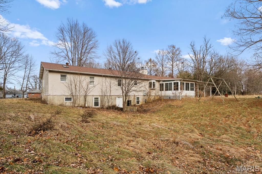 Welcome Home to 207 Irma Lane! A private, 5-bedroom/3-bathroom ranch with fully finished basement, sunroom, 2-car attached and 2-car detached garage on nearly 1.5 acres! The front covered porch takes you into the open floor plan with hardwood floors and vaulted ceiling. Sit and gather with friends and family in the living room and beautiful brick fireplace which opens to the separate dining room and kitchen. Kitchen has stainless steel appliances that all stay, and some built in cabinet drawers for ease of use! Additional large bonus/hearth room can be used to your heart's content! Sizeable main floor laundry with utility closet space. 2 main floor bedrooms with large spare bathroom and double vanities, and main floor primary bedroom & with ensuite including separate vanities, and huge walk-in closet! The lower level includes a large recreation room, exercise room/playroom, 2 additional bedrooms & a full bathroom with soaker tub. Plenty of GARAGE space, land, and no HOA! Located close to interstate access, SIUE, shopping, dining, SAFB & Downtown STL.