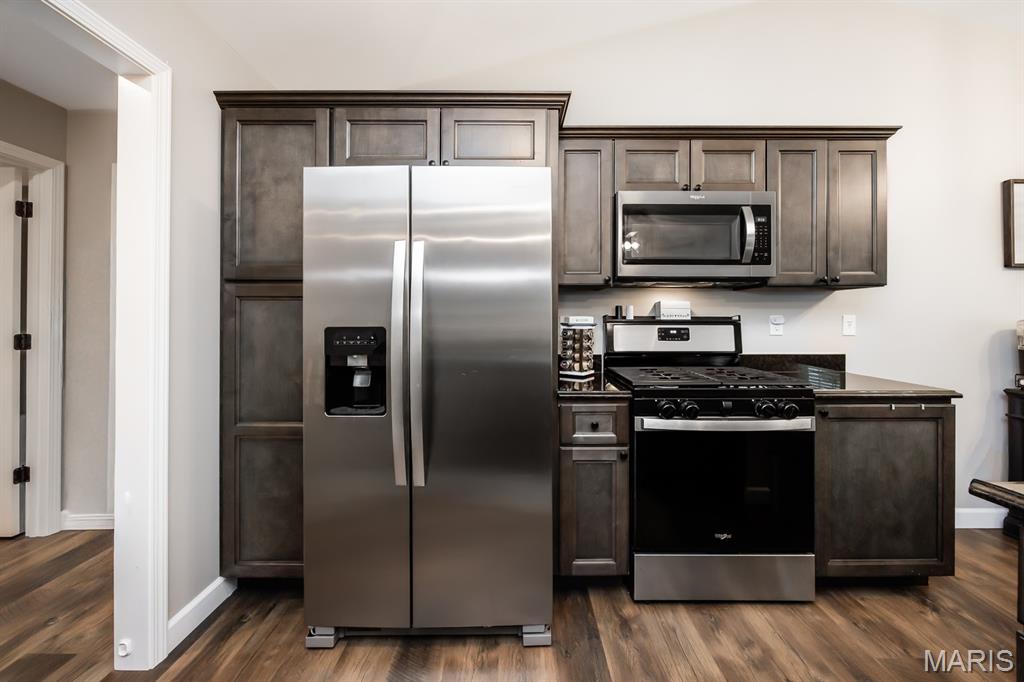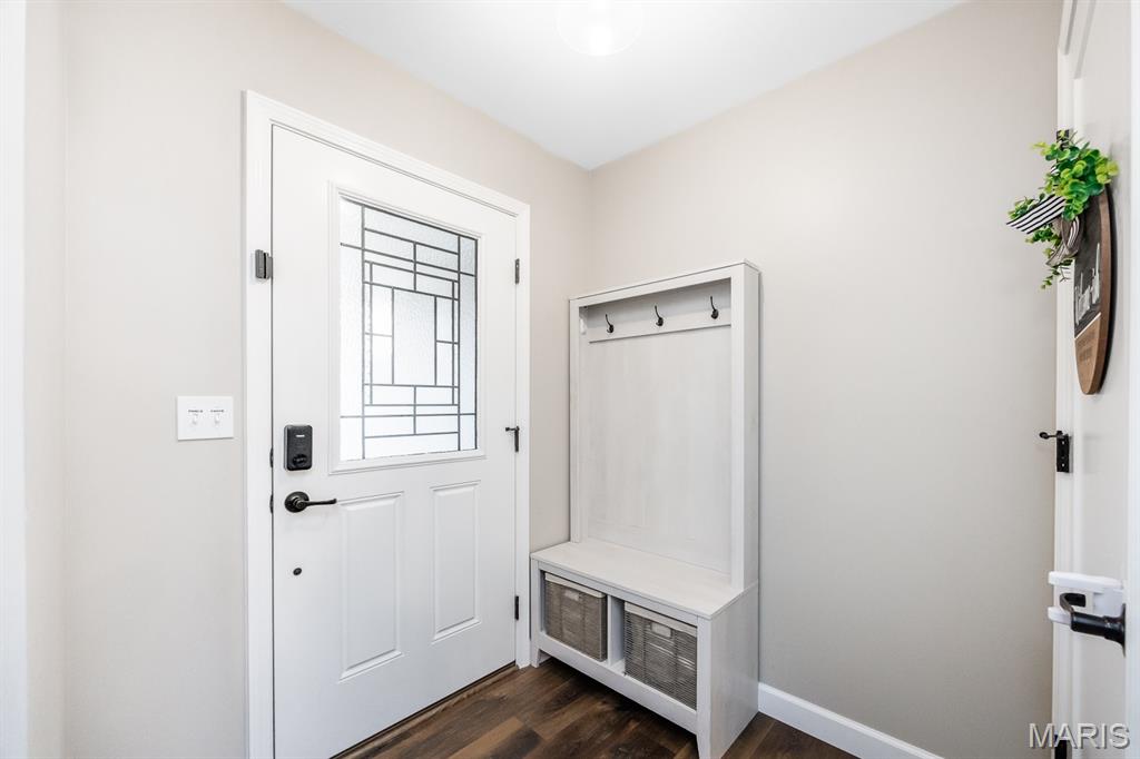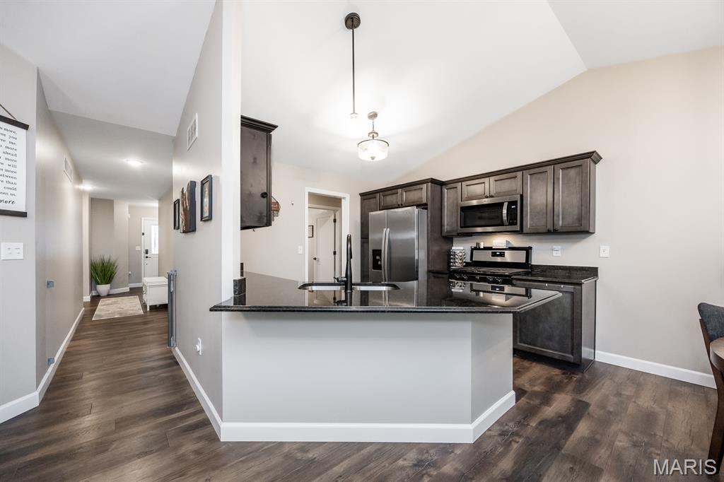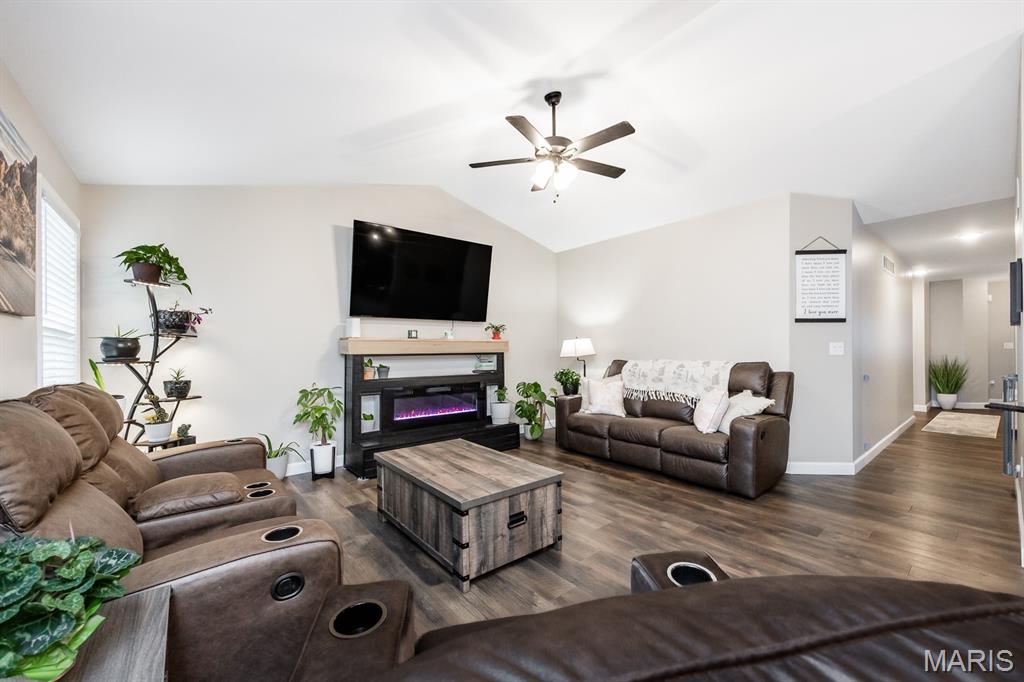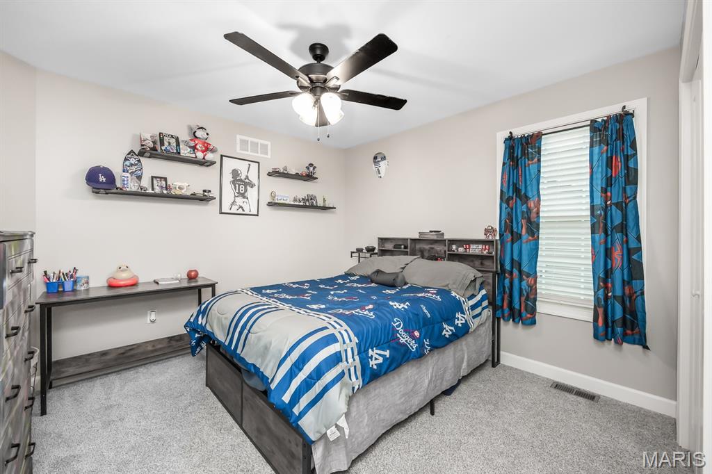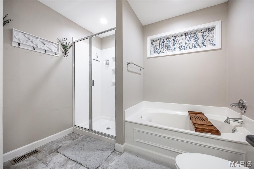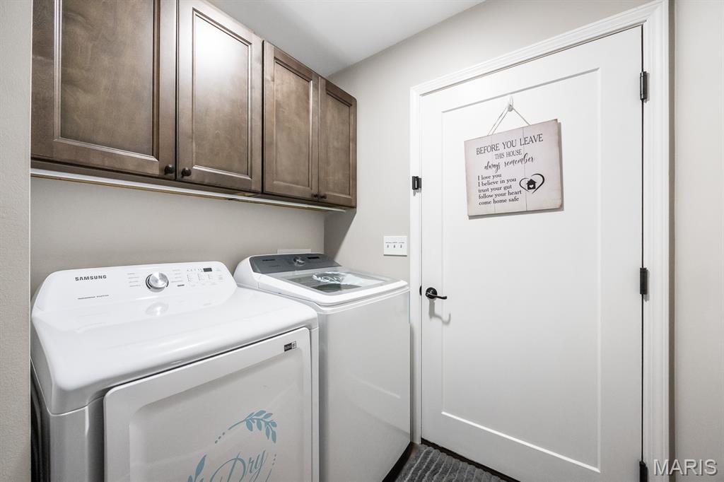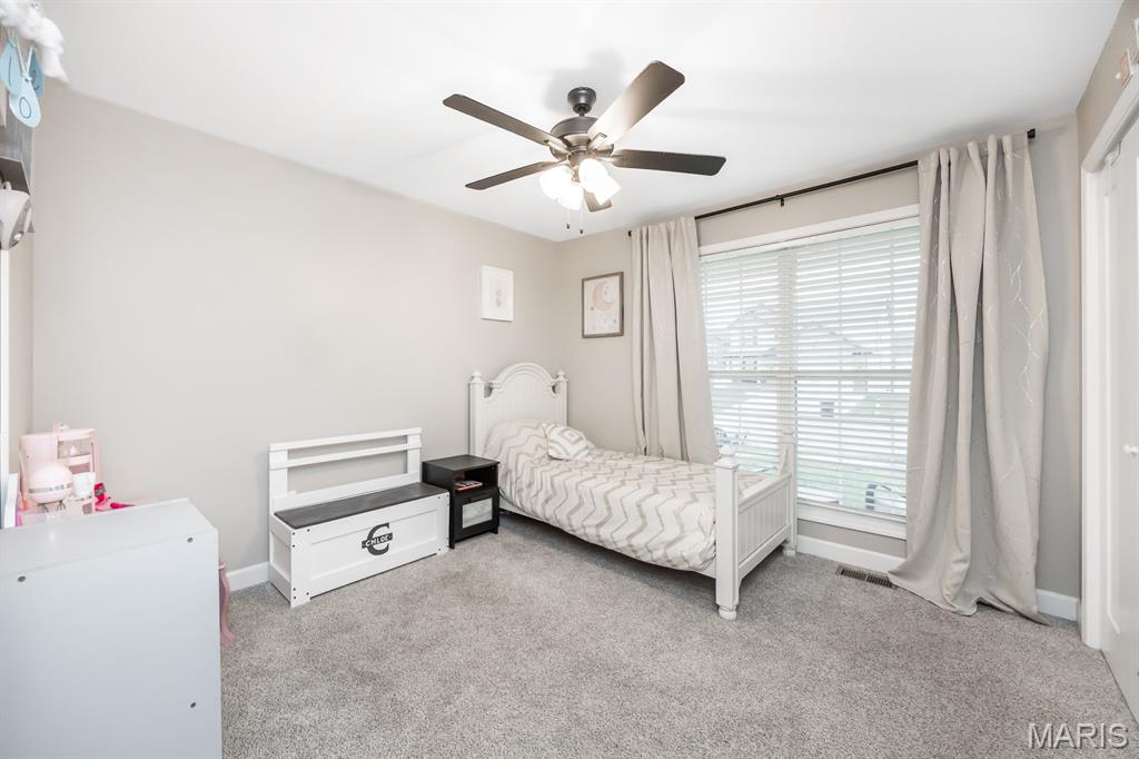 This beautifully maintained Fairway Model by New Tradition Homes offers over 1,600 sq ft of comfortable, single-level living in the highly desirable O’Fallon School District. Designed with an open floor plan and a split-bedroom layout, this 3-bedroom, 2-bath ranch provides both functionality and privacy. The kitchen features custom solid wood cabinetry with soft-close doors and drawers, granite countertops, and a breakfast bar, opening seamlessly to the living area—perfect for everyday living and entertaining. Step outside to the covered patio and enjoy the fully fenced backyard with a black aluminum fence, ideal for relaxing, pets, or play. The spacious primary suite includes a walk-in closet and a private bath with a soaking tub and separate shower. Two additional bedrooms, a full bath, and a convenient laundry room located just off the 2-car garage add to the home’s thoughtful layout. The full unfinished basement provides excellent storage and future expansion potential and includes a rough-in for a full bathroom and an egress window, making it ideal for a future bedroom or additional living space. Located in the sought-after Fountains subdivision, residents enjoy access to association amenities including a community pool, clubhouse, stocked lake for fishing, common grounds, soccer and baseball fields. The home is also conveniently located near Scott AFB, shopping, dining, and all the Metro East has to offer, with easy access to St. Louis—just 20 minutes away.