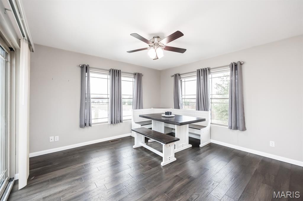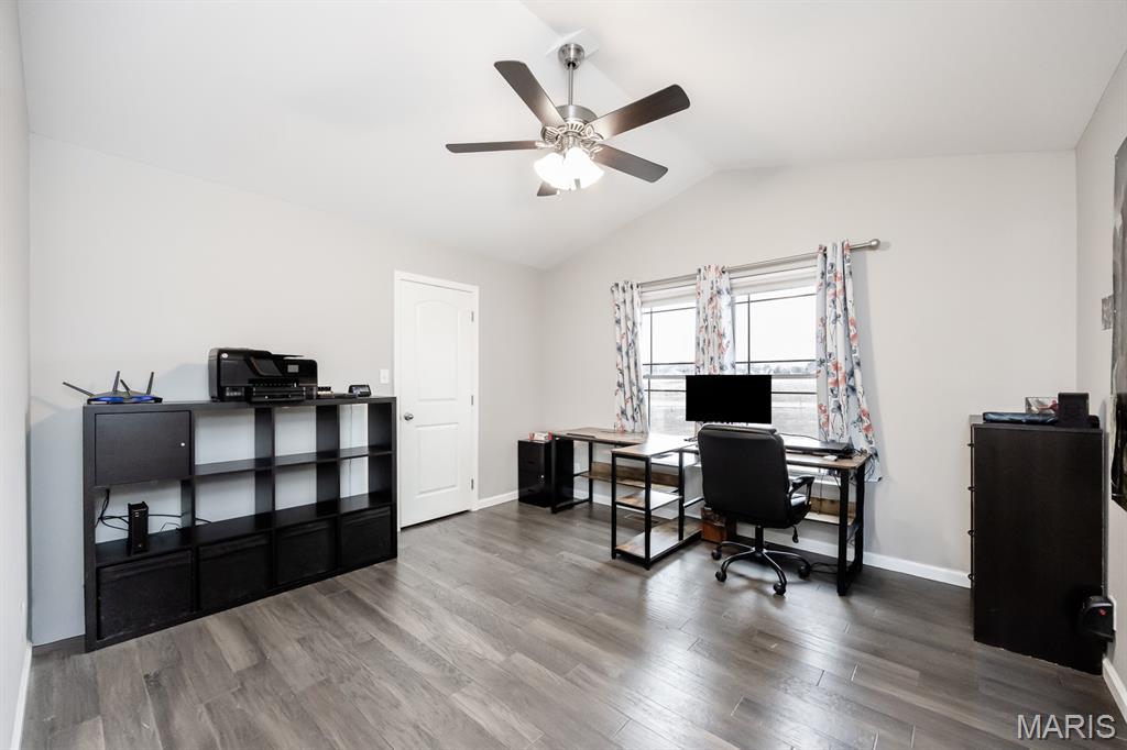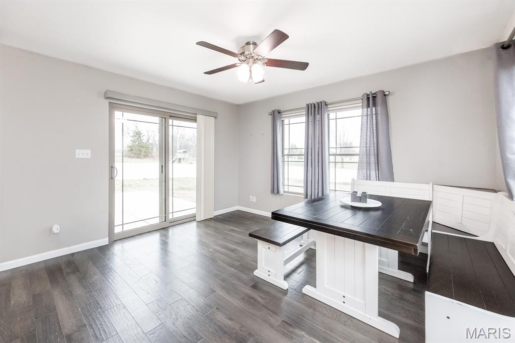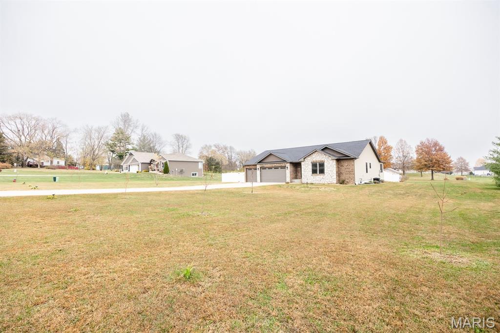 This open four-bedroom ranch is situated on 1.24 acres and offers a spacious, thoughtfully designed floor plan. The main living area features vaulted ceilings, engineered wood flooring, and a gas fireplace, creating a warm and inviting space. A split-bedroom layout provides privacy, and a convenient main-floor laundry room adds everyday ease. The large kitchen is beautifully appointed with white cabinetry, granite countertops, tile backsplash, pantry, and an oversized island with breakfast bar. A sunroom filled with natural light features multiple windows and a sliding door that opens to the patio and a large, privacy-fenced backyard with three gates. Outdoor features include a 12x16 shed, with the wood swing frame included. The primary suite offers a luxurious bath with a walk-in marble shower, separate whirlpool tub, double vanity, and a spacious 12x8 walk-in closet. Bedrooms two and three also include walk-in closets. The finished lower level expands the living space with family room with egress window, fourth bedroom with egress window and walk-in closet, full bath with shower and linen closet, and a large open bonus area. The storage area offers built-in shelving, a storage closet, and a stairway to the attached three-car garage—ideal for moving items in and out. Additional highlights include custom window blinds throughout, three-car attached garage, beautiful landscaping, fruit trees, 5 raised gardening bed, and lots of berry bushes.