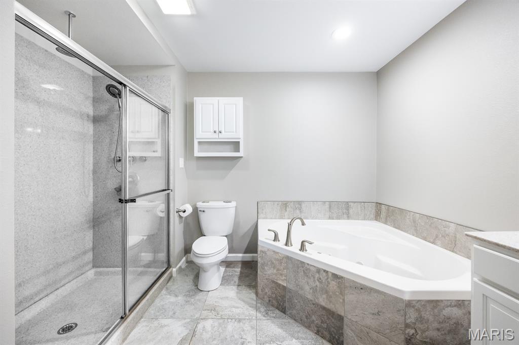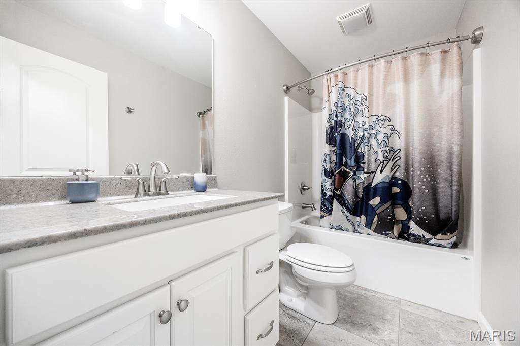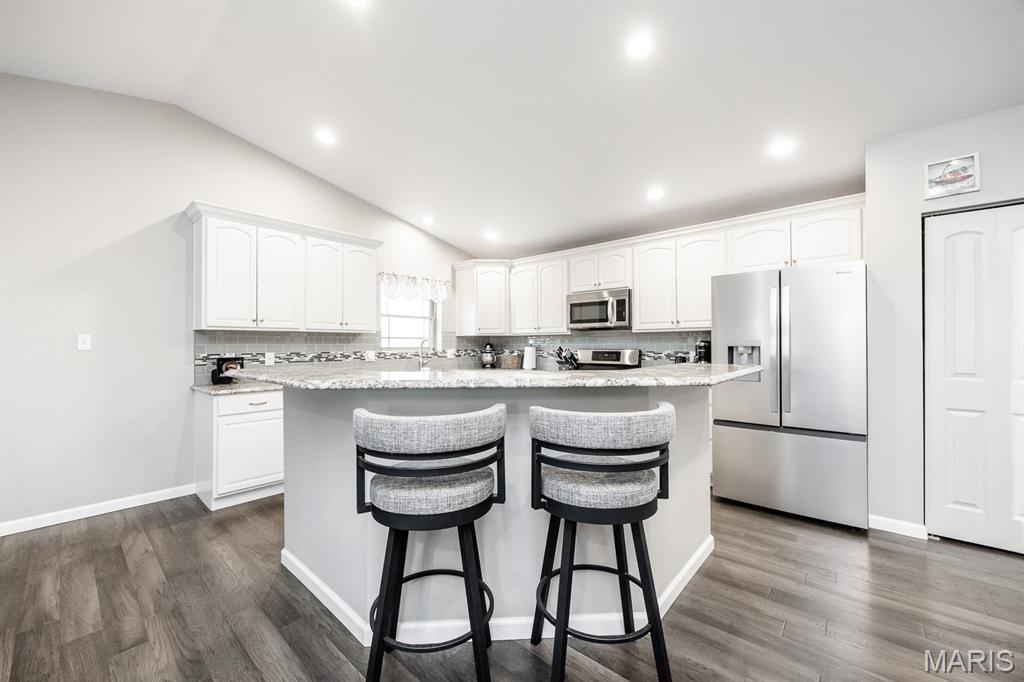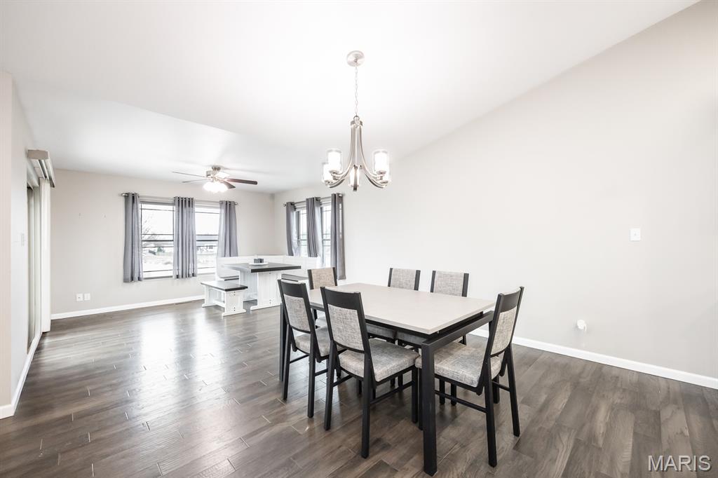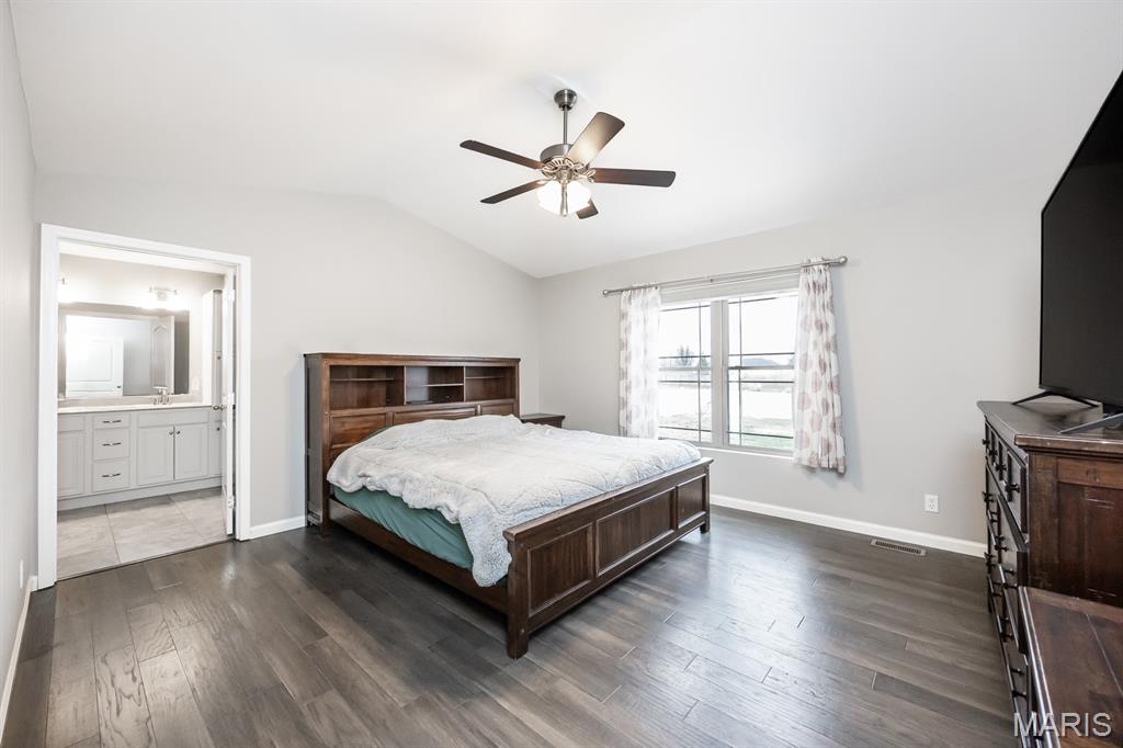 This open four-bedroom ranch is situated on 1.24 acres and offers a spacious, thoughtfully designed floor plan. The main living area features vaulted ceilings, engineered wood flooring, and a gas fireplace, creating a warm and inviting space. A split-bedroom layout provides privacy, and a convenient main-floor laundry room adds everyday ease. The large kitchen is beautifully appointed with white cabinetry, granite countertops, tile backsplash, pantry, and an oversized island with breakfast bar. A sunroom filled with natural light features multiple windows and a sliding door that opens to the patio and a large, privacy-fenced backyard with three gates. Outdoor features include a 12x16 shed, with the wood swing frame included. The primary suite offers a luxurious bath with a walk-in marble shower, separate whirlpool tub, double vanity, and a spacious 12x8 walk-in closet. Bedrooms two and three also include walk-in closets. The finished lower level expands the living space with family room with egress window, fourth bedroom with egress window and walk-in closet, full bath with shower and linen closet, and a large open bonus area. The storage area offers built-in shelving, a storage closet, and a stairway to the attached three-car garage—ideal for moving items in and out. Additional highlights include custom window blinds throughout, three-car attached garage, beautiful landscaping, fruit trees, 5 raised gardening bed, and lots of berry bushes.