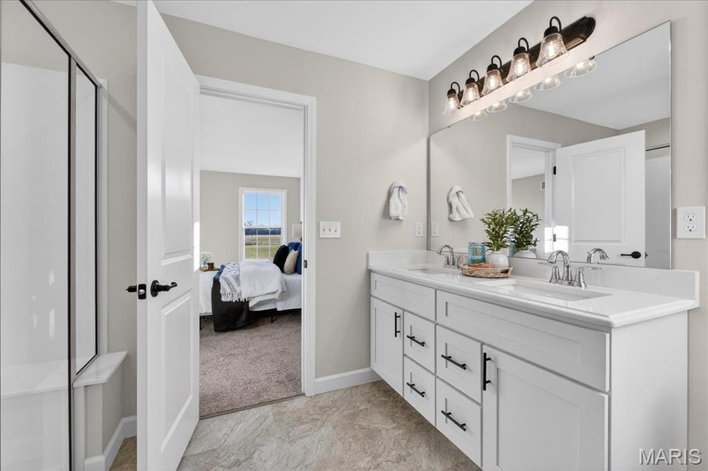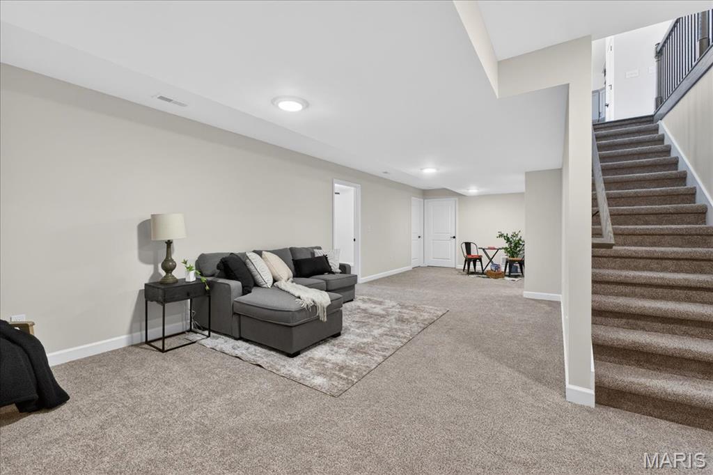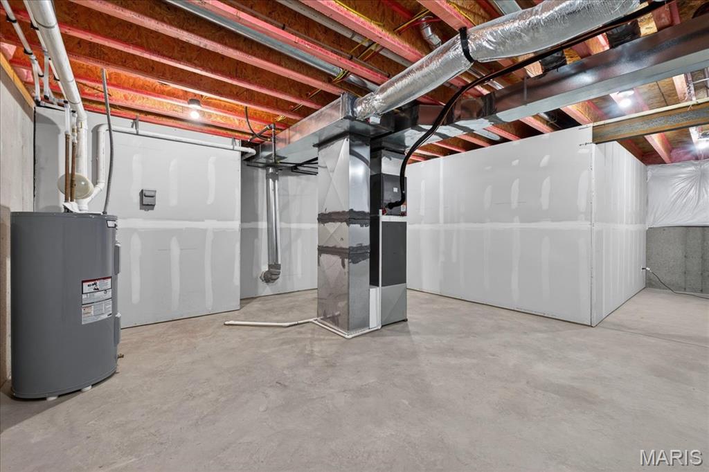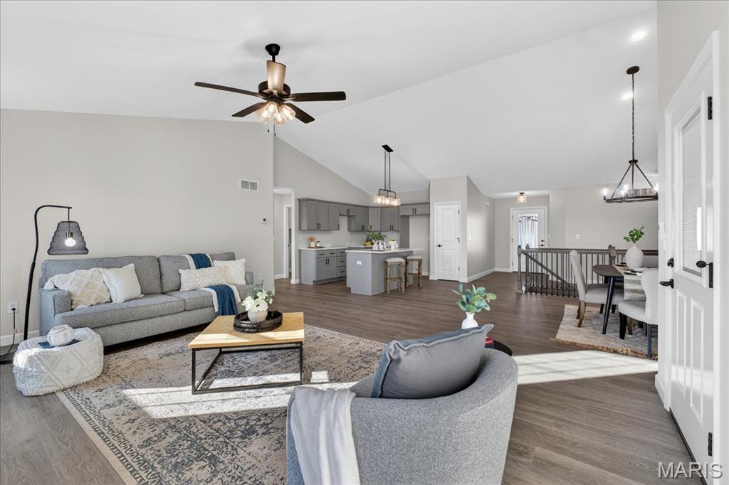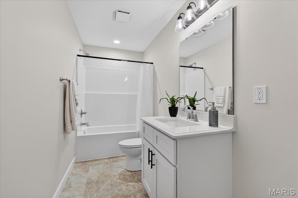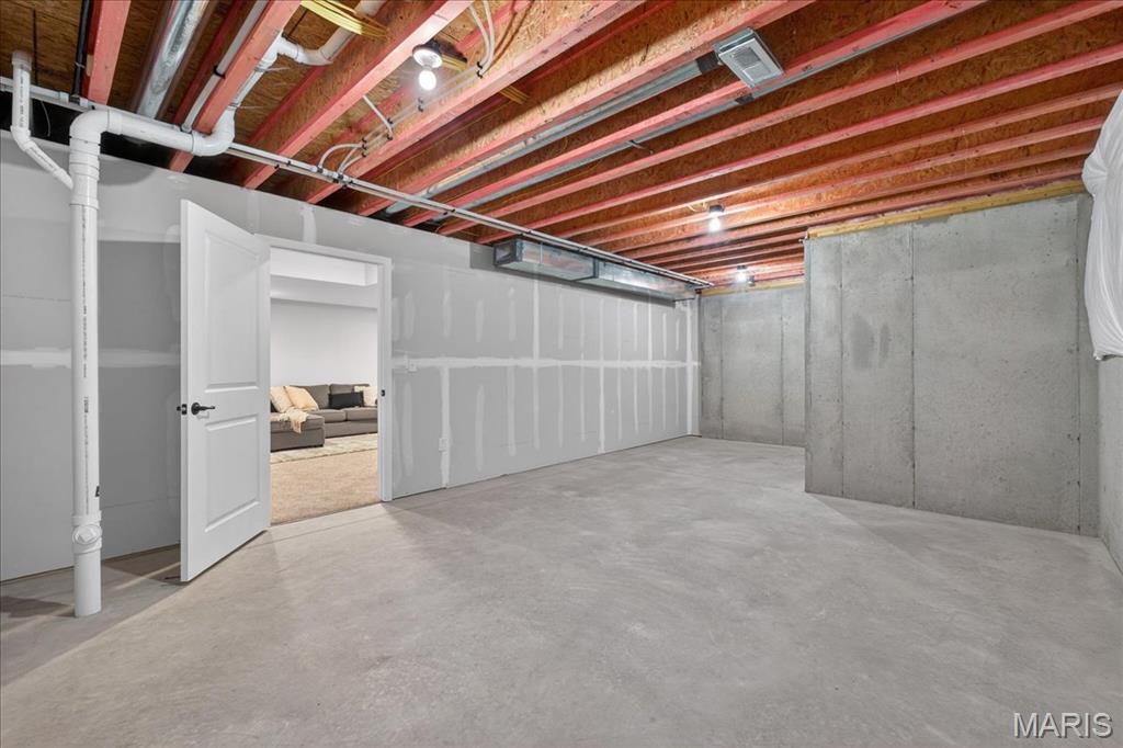 Welcome to The Grant by New Tradition Homes, a beautifully designed 5-bedroom, 3-bath ranch in the sought after Milburn Estates community. Offering over 2,600 sq. ft. of finished living space, this modern split-bedroom layout delivers comfort, style, and functionality. Step inside to an open concept main level with hard surface flooring throughout the living areas. The kitchen impresses with solid wood, soft-close cabinetry, granite countertops, and a spacious island overlooking the vaulted living and dining spaces, perfect for entertaining. Enjoy cozy evenings by the fireplace or unwind on your covered patio just off the living room, where the backyard backs to Munie Farms, providing a peaceful, private setting with no homes directly behind you. The main floor also features a generous owner’s suite with a private bath, along with two additional bedrooms and a full bathroom. The partially finished basement expands your living options with a massive family room, two more bedrooms, and a full bath, plus ample unfinished space for storage or future customization. Located on a quiet cul-de-sac, you’ll love being just minutes from Scott Air Force Base, O’Fallon amenities, shopping, dining, and top-rated schools.