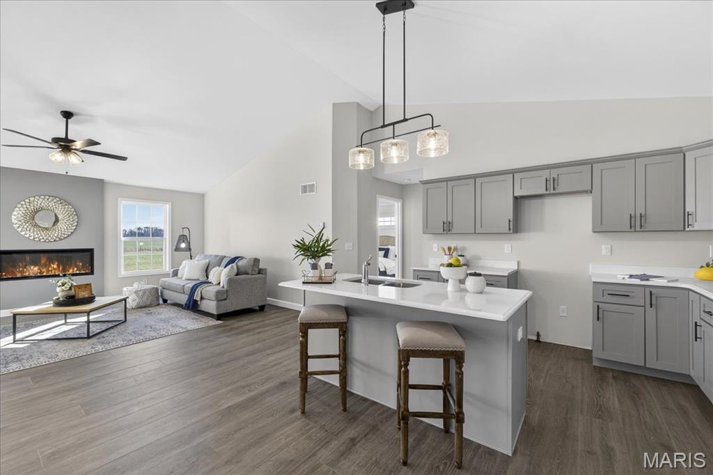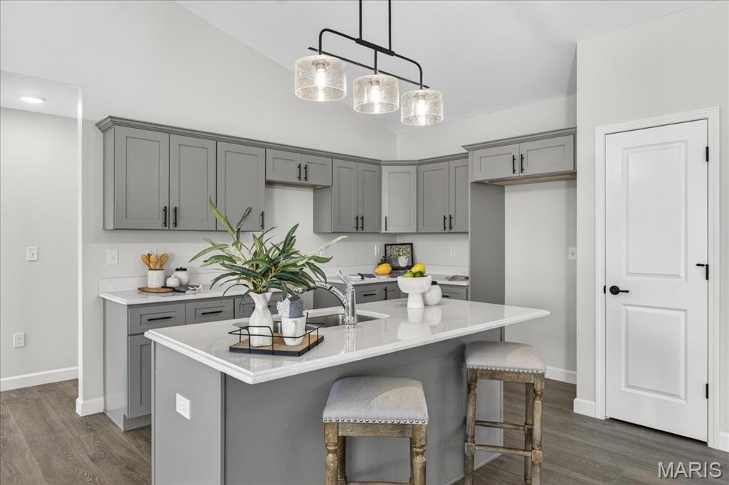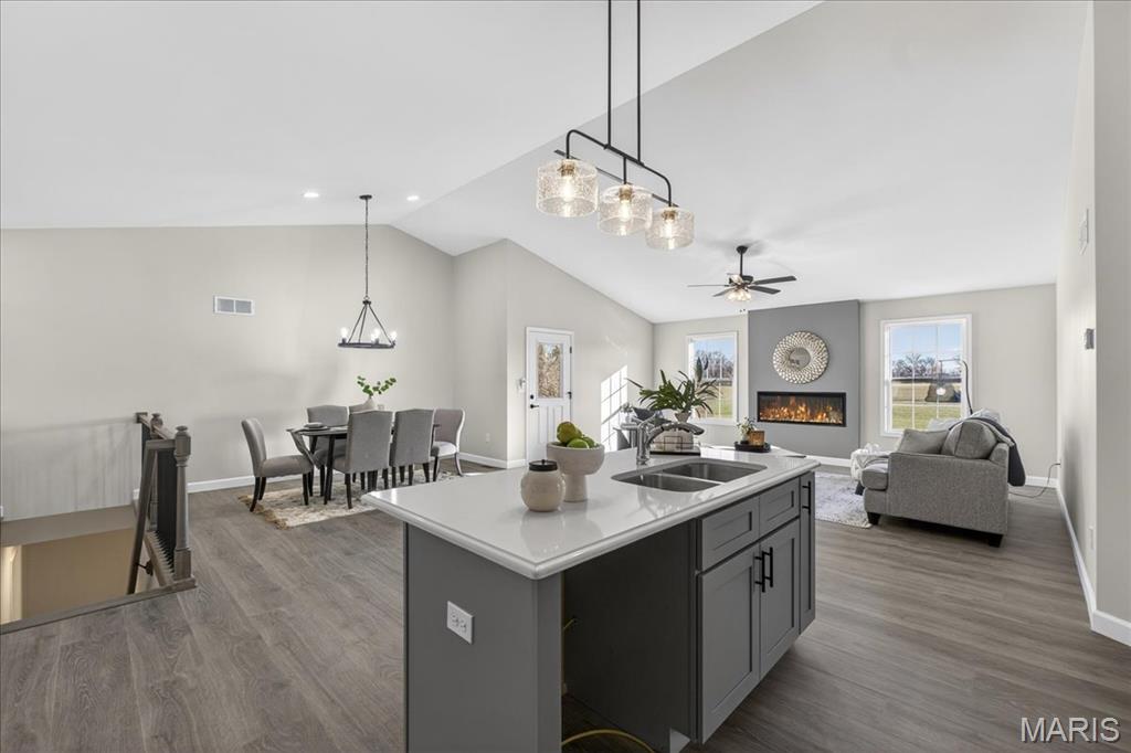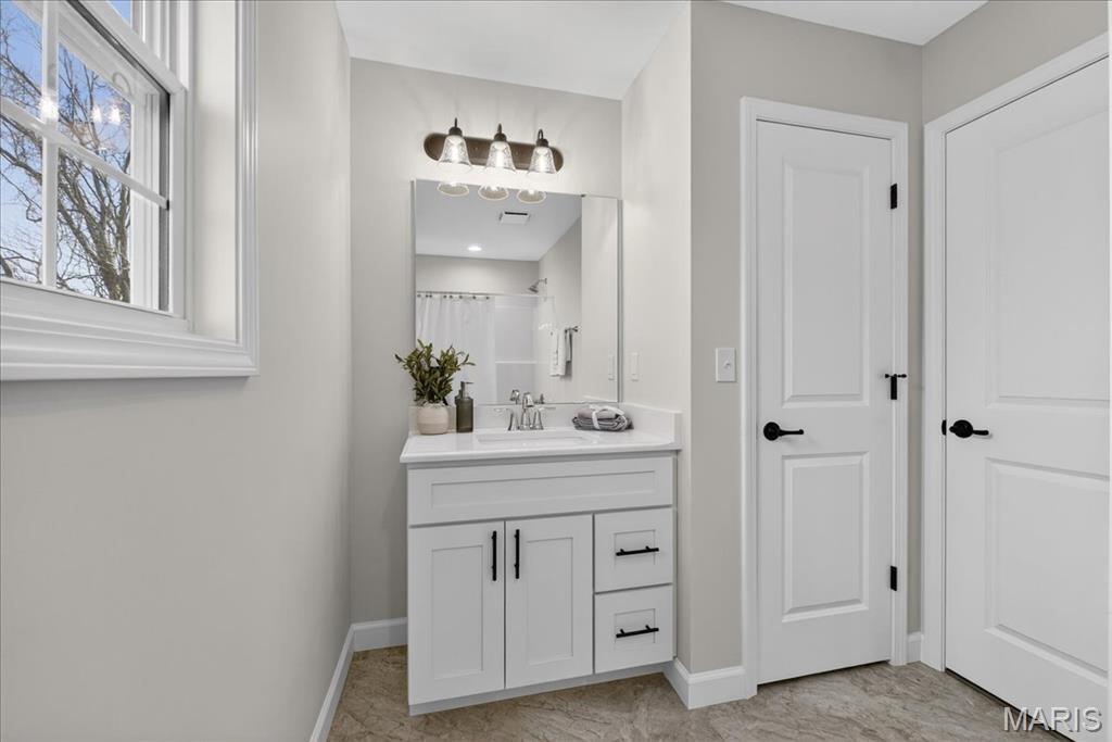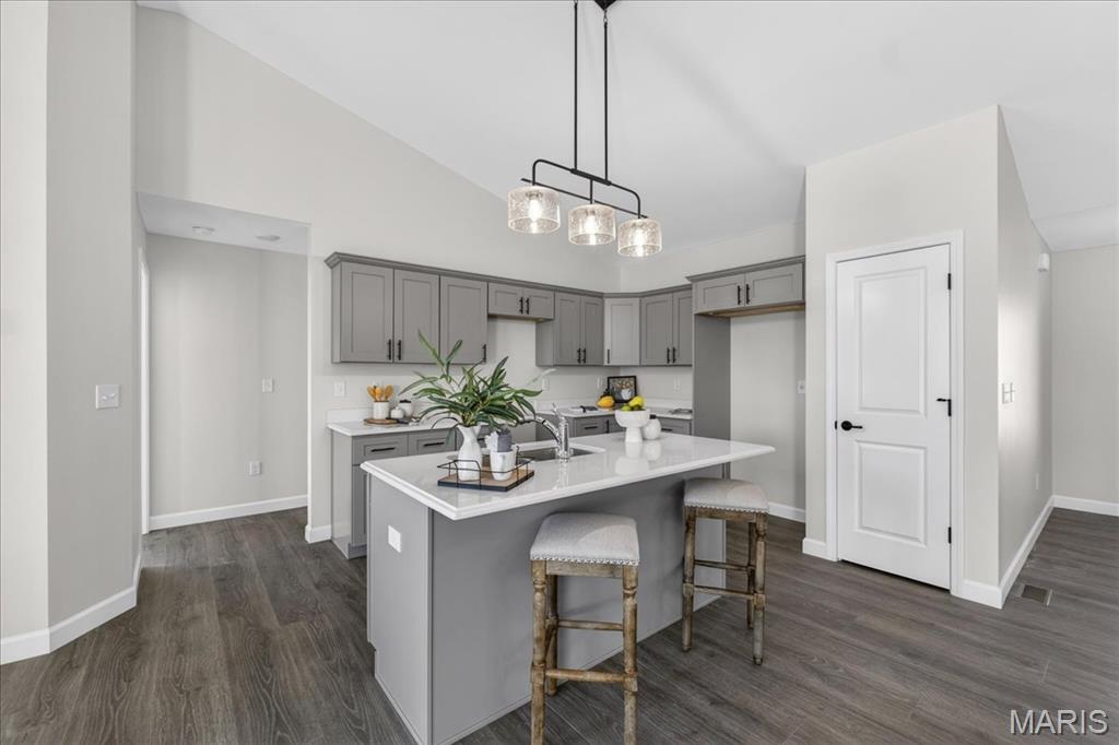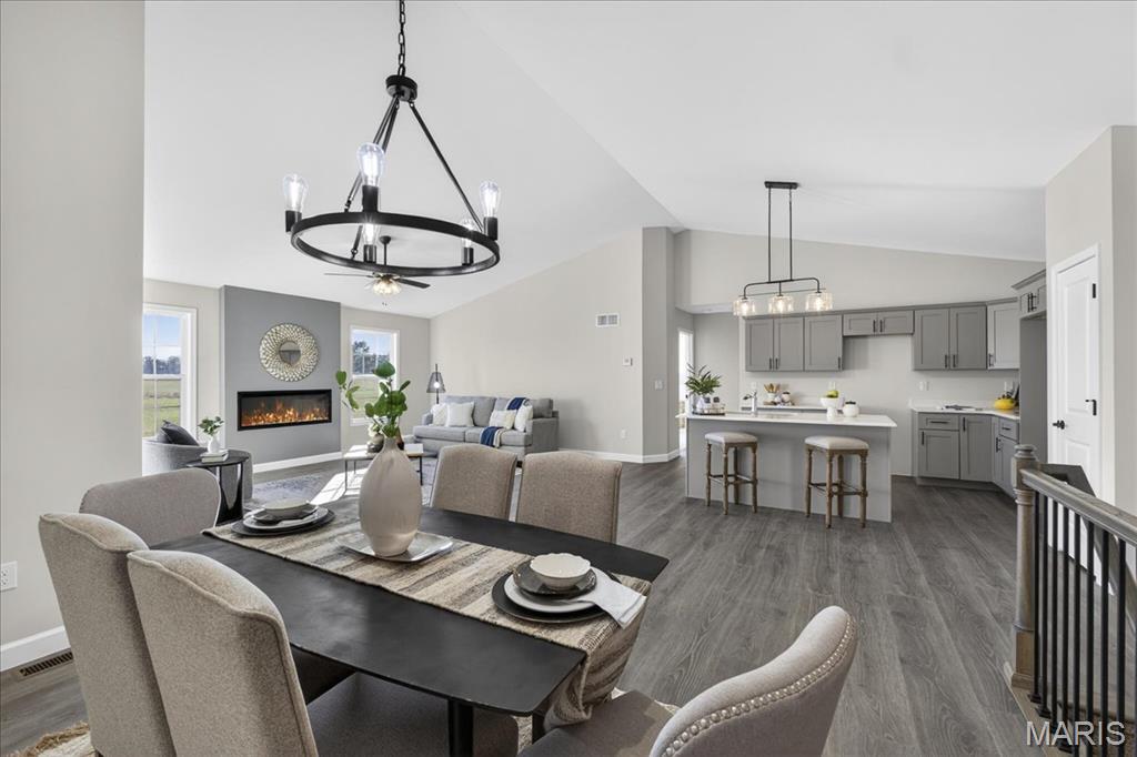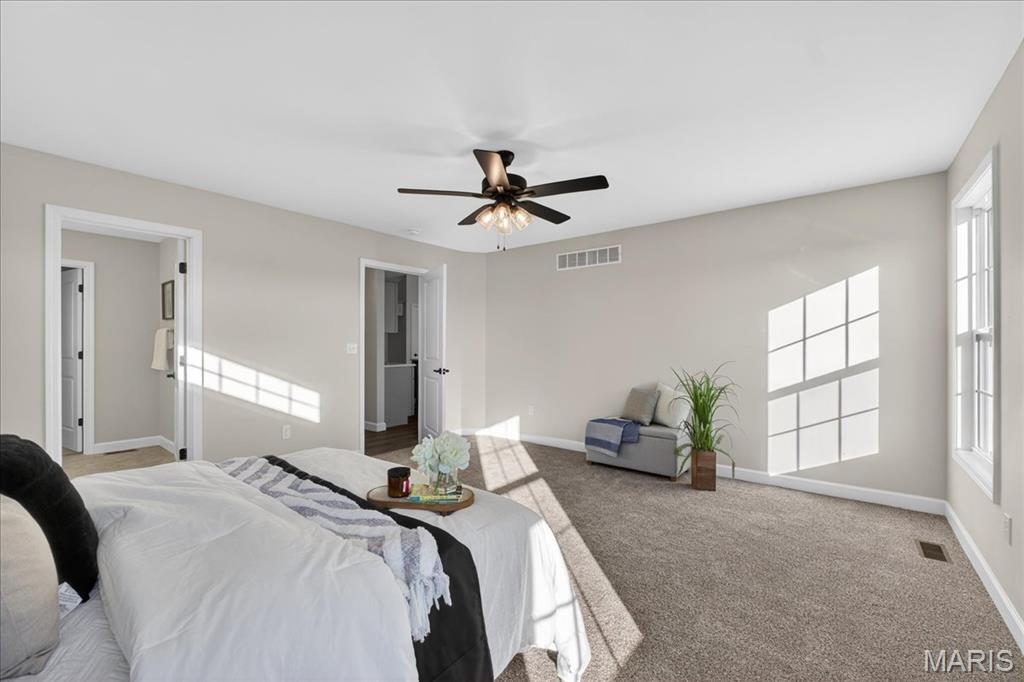 Welcome to The Grant by New Tradition Homes, a beautifully designed 5-bedroom, 3-bath ranch in the sought after Milburn Estates community. Offering over 2,600 sq. ft. of finished living space, this modern split-bedroom layout delivers comfort, style, and functionality. Step inside to an open concept main level with hard surface flooring throughout the living areas. The kitchen impresses with solid wood, soft-close cabinetry, granite countertops, and a spacious island overlooking the vaulted living and dining spaces, perfect for entertaining. Enjoy cozy evenings by the fireplace or unwind on your covered patio just off the living room, where the backyard backs to Munie Farms, providing a peaceful, private setting with no homes directly behind you. The main floor also features a generous owner’s suite with a private bath, along with two additional bedrooms and a full bathroom. The partially finished basement expands your living options with a massive family room, two more bedrooms, and a full bath, plus ample unfinished space for storage or future customization. Located on a quiet cul-de-sac, you’ll love being just minutes from Scott Air Force Base, O’Fallon amenities, shopping, dining, and top-rated schools.
