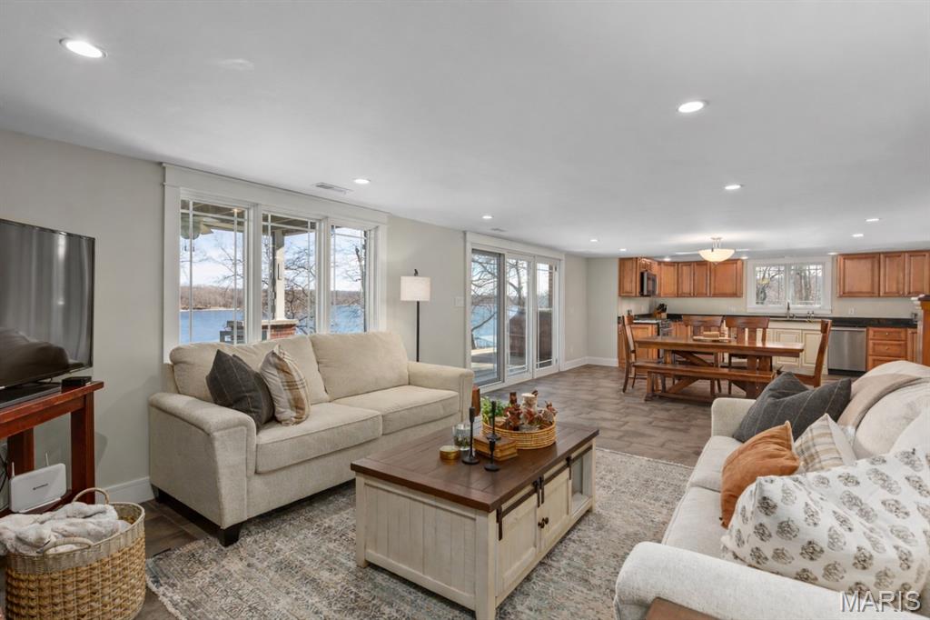 LUXURIOUS LAKE LIVING! Experience lakefront living in this beautiful 3-bedroom, 3-bath home on Lake Lou Yaeger, uniquely positioned on one of the lake’s few points and among the closest homes to the water. With breathtaking panoramic views, this property offers one of the best vantage points on the lake for Fourth of July fireworks and unforgettable sunrises year-round. This home is truly move-in ready - no projects necessary, just pure enjoyment. The main level features an open and inviting living room with fireplace, a dining area perfect for entertaining, and a stunning, updated kitchen. A versatile den on the main floor offers the potential to serve as a fourth bedroom or home office, along with a convenient ¾ bath. Upstairs, the private primary suite is a true retreat, complete with a walk-in closet, en suite bath, and access to a covered deck overlooking the lake - the perfect spot for morning coffee or evening relaxation. Two additional bedrooms and a full bath complete the upper level. Outdoor living truly shines here. Enjoy a recently installed floating, covered concrete two-slip dock with one boat lift, fully wired with electric, lighting, outlets, and a wireless sound system. Unwind year-round in the 7-person hot tub, or take advantage of the recently re-paved concrete driveway leading to the heated and cooled two-plus car detached garage, ideal for vehicles and lake toys. A charming lakeside outbuilding provides additional storage and hangout space. Additional features include a garage wired for electric vehicle charging, a full home security system, and enhanced remote monitoring with video surveillance and smart locks, offering peace of mind whether you’re home or away. Summer days are calling...and this exceptional lakefront opportunity won’t last. Call today to make this Lake Lou Yaeger retreat your own!