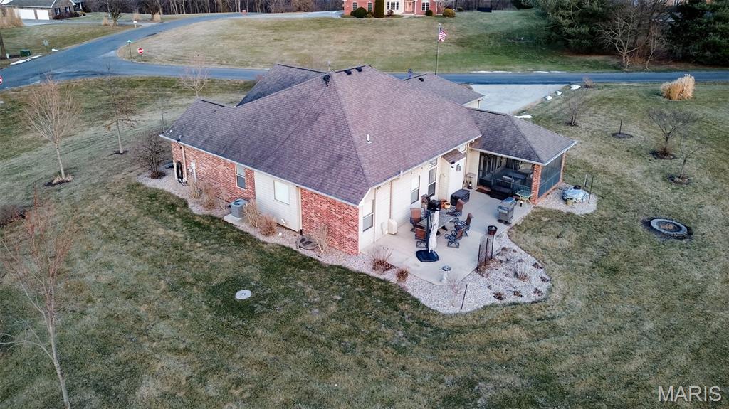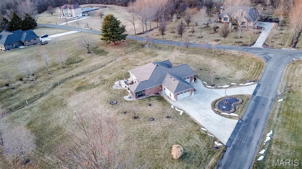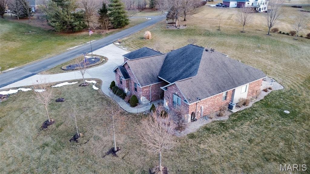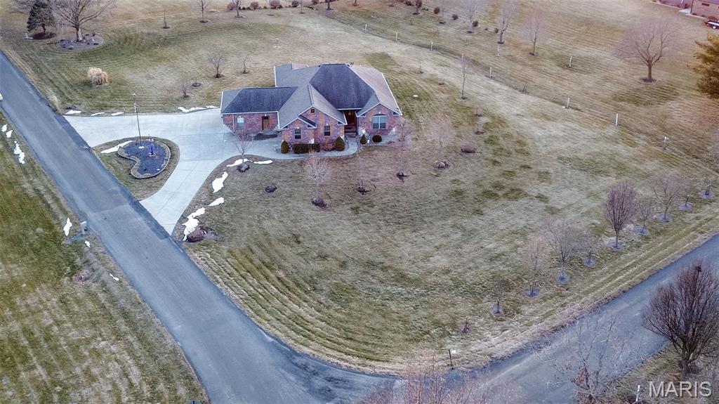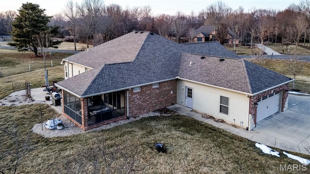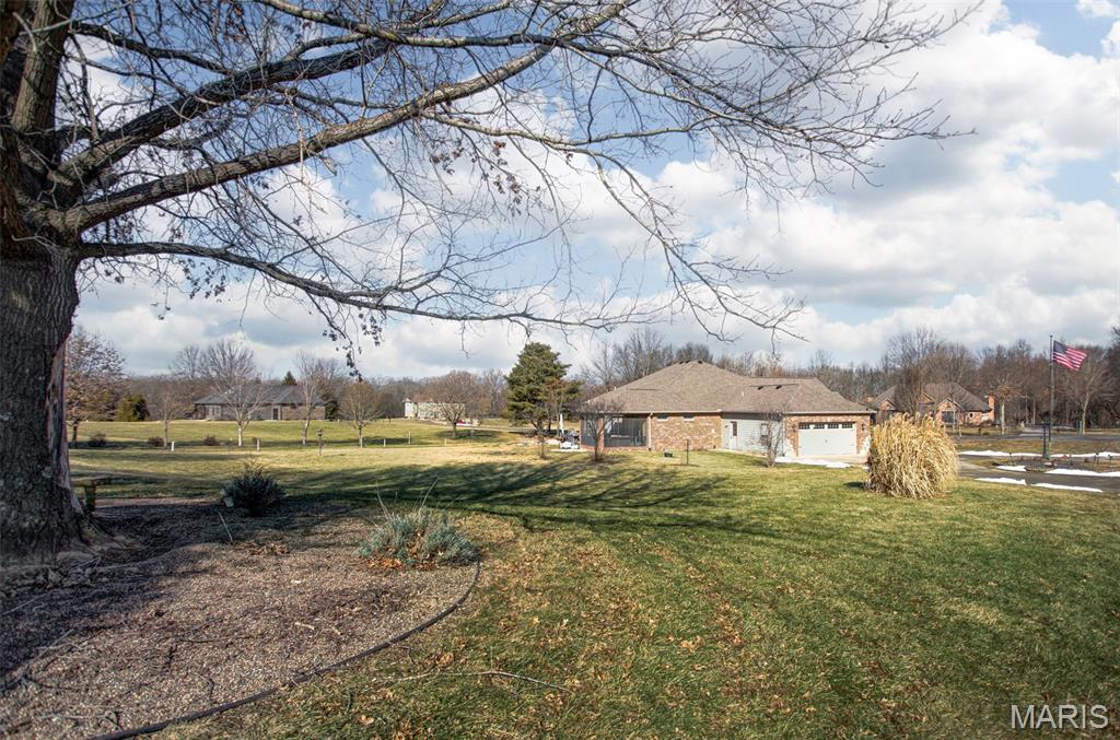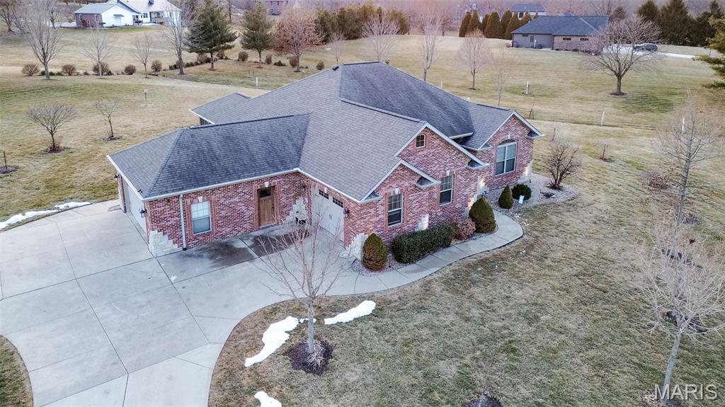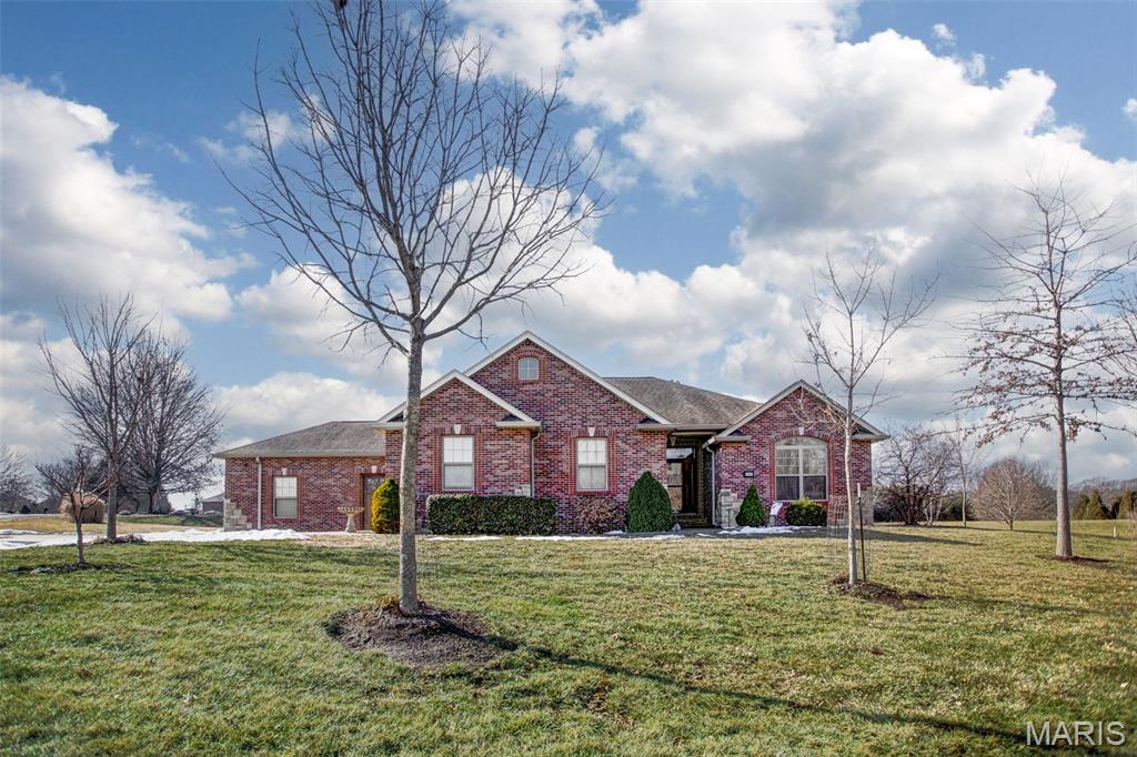 Custom-built brick ranch with stone accents on 2.2 acres in a quiet subdivision, offering over 3,000 sq ft of finished living space. This elegant home features an open-concept design with hand-scraped solid oak flooring, crown molding, and quality fixtures throughout. The living room showcases a direct-vent gas fireplace, while the chef’s kitchen includes solid surface countertops, stainless appliances, beverage cooler, pantry, and large island with bar seating. The primary suite offers a walk-in closet and spa-like bath with double vanity and separate shower. Main-level laundry adds convenience. The recently finished lower level provides approximately 1,100 sq ft with a spacious family room, additional bedroom, and full bath—ideal for guests or extended living. Enjoy peaceful views from the screened-in porch overlooking beautifully landscaped grounds. Additional highlights include a 3-car garage, circular drive, workshop/storage space, and mature trees. Luxury, privacy, and space combine in this exceptional property.