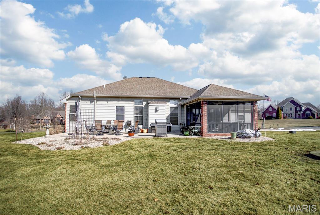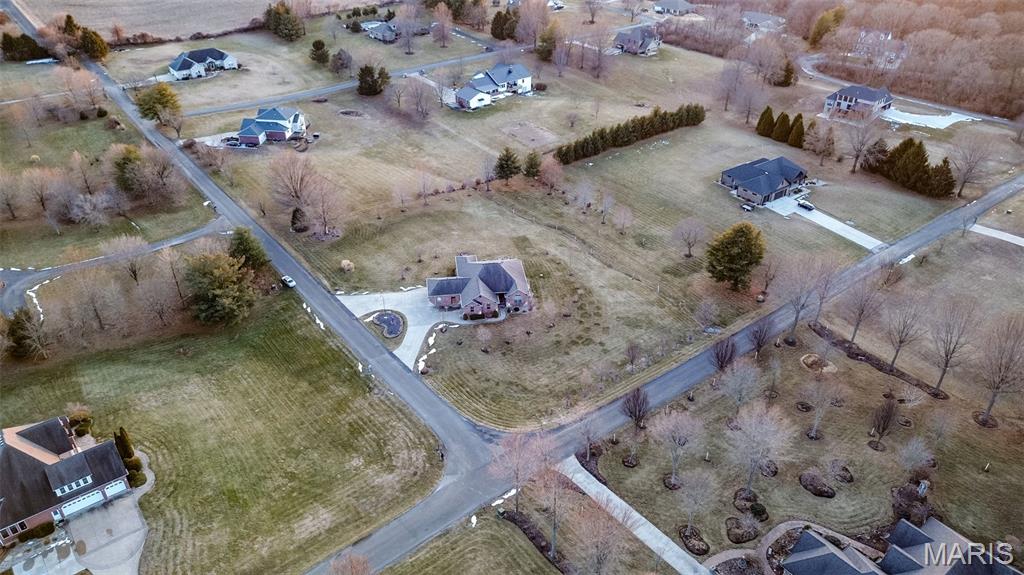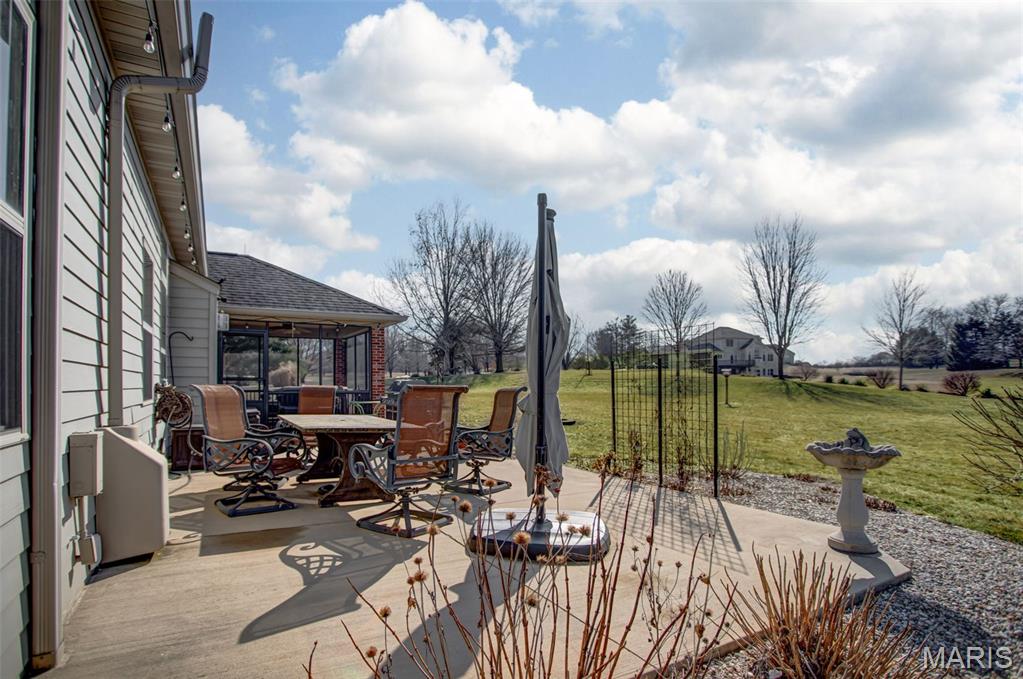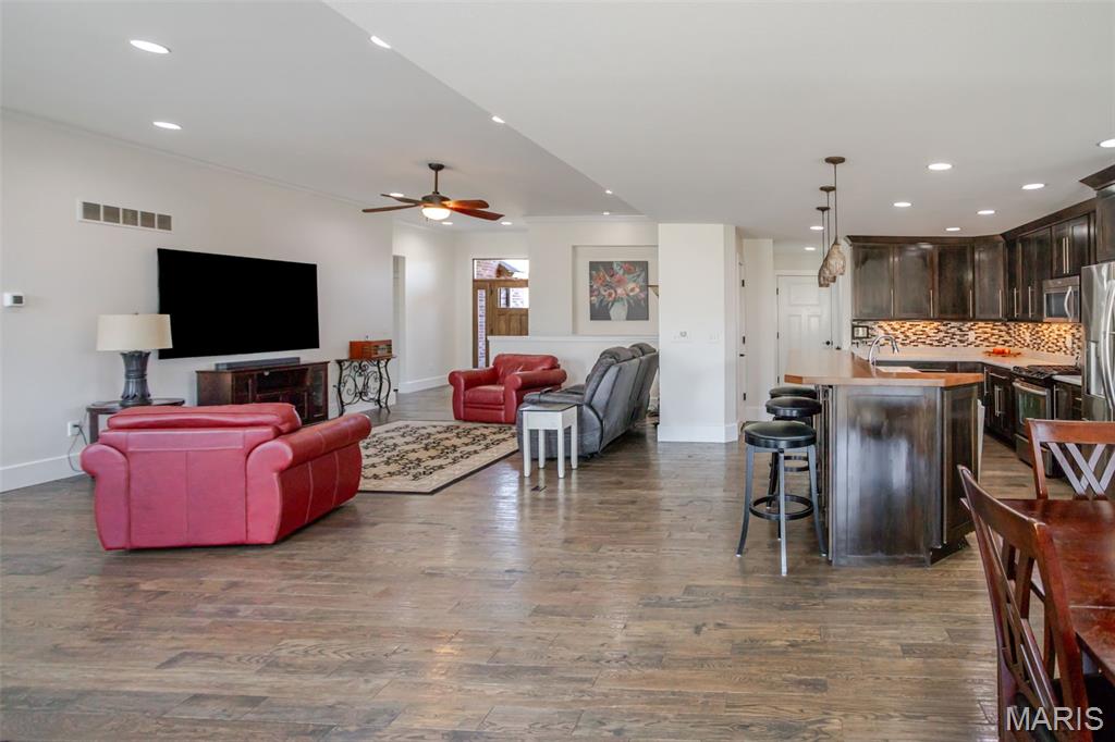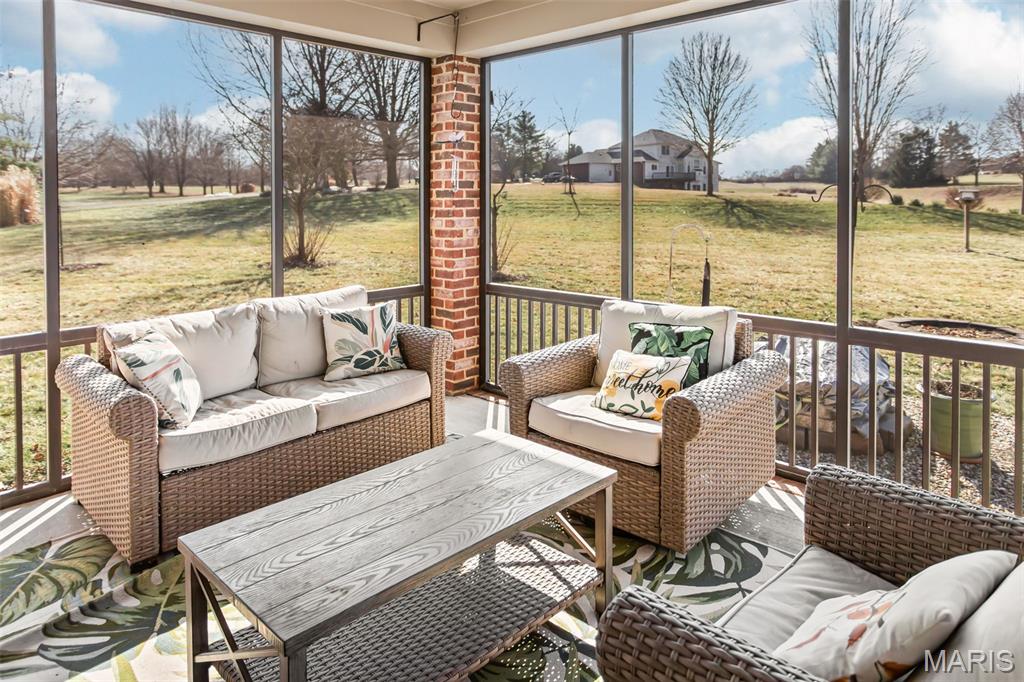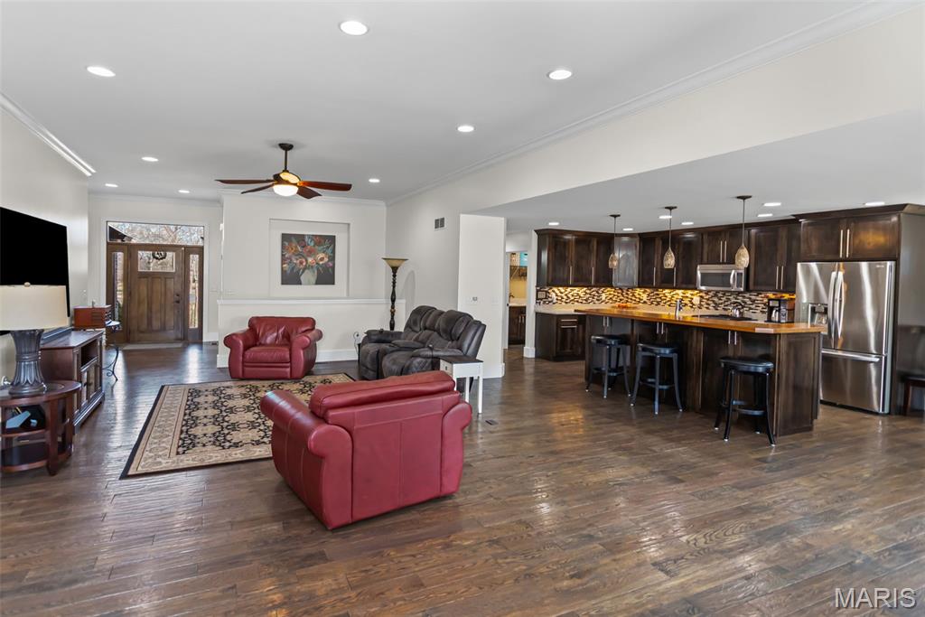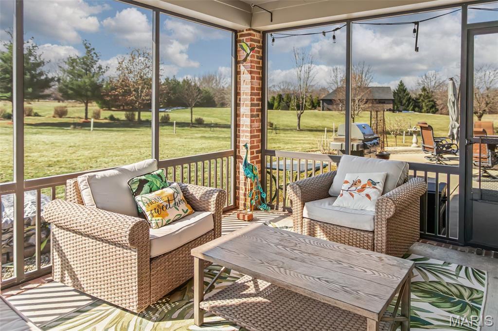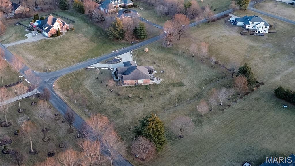 Custom-built brick ranch with stone accents on 2.2 acres in a quiet subdivision, offering over 3,000 sq ft of finished living space. This elegant home features an open-concept design with hand-scraped solid oak flooring, crown molding, and quality fixtures throughout. The living room showcases a direct-vent gas fireplace, while the chef’s kitchen includes solid surface countertops, stainless appliances, beverage cooler, pantry, and large island with bar seating. The primary suite offers a walk-in closet and spa-like bath with double vanity and separate shower. Main-level laundry adds convenience. The recently finished lower level provides approximately 1,100 sq ft with a spacious family room, additional bedroom, and full bath—ideal for guests or extended living. Enjoy peaceful views from the screened-in porch overlooking beautifully landscaped grounds. Additional highlights include a 3-car garage, circular drive, workshop/storage space, and mature trees. Luxury, privacy, and space combine in this exceptional property.