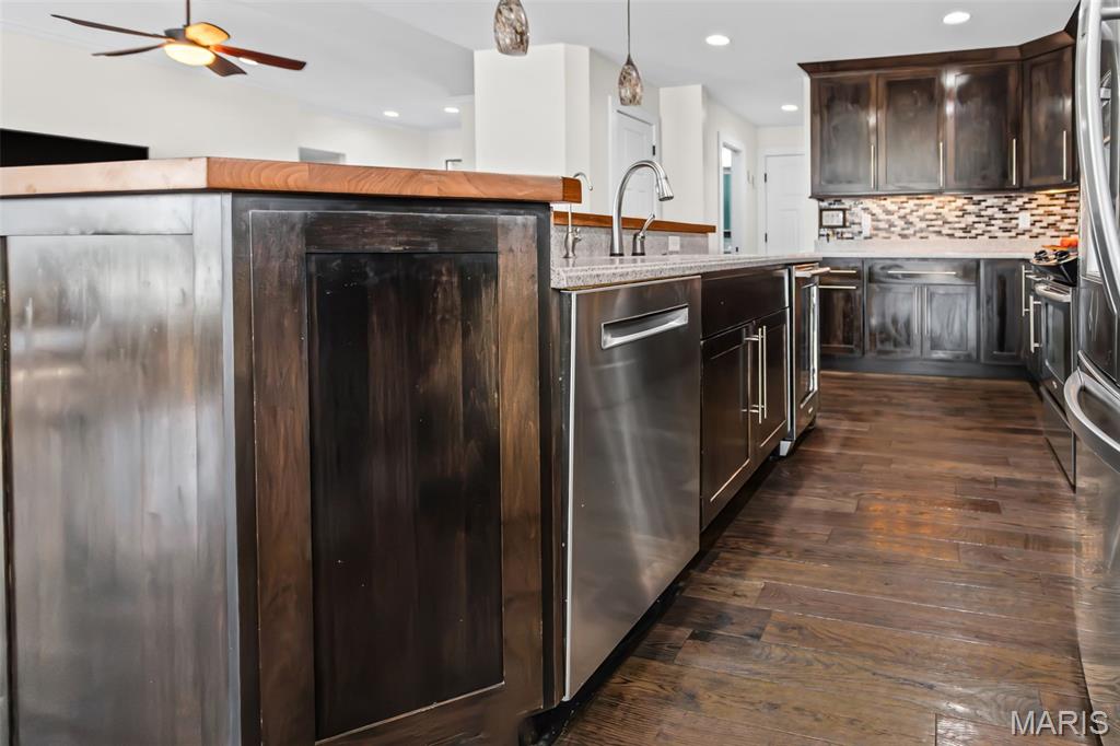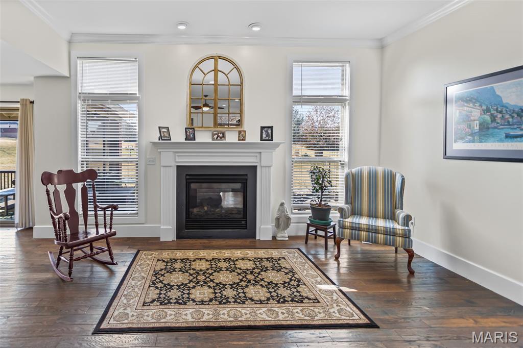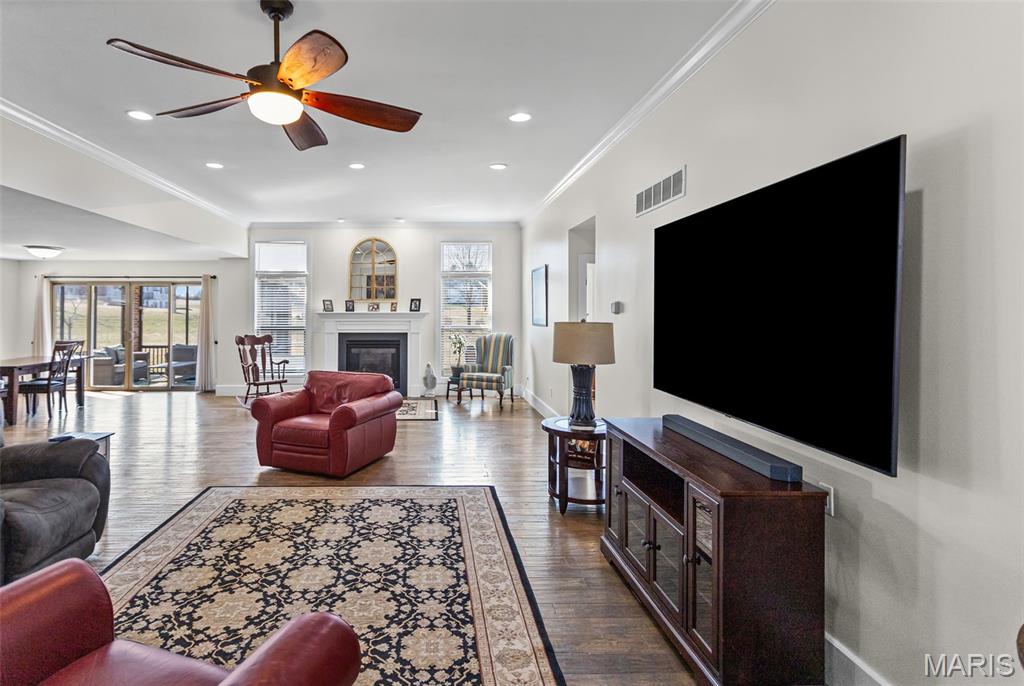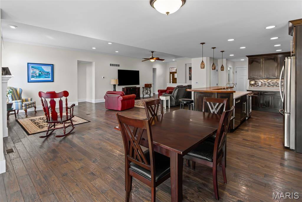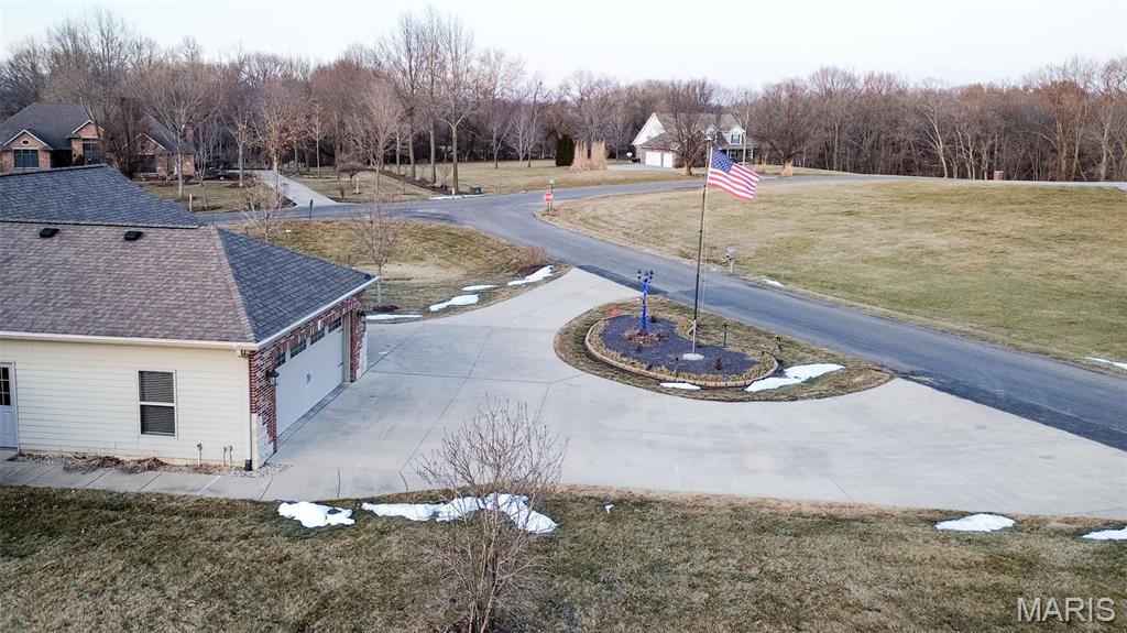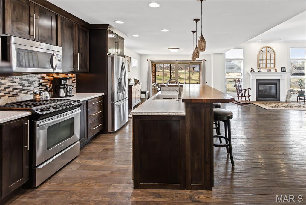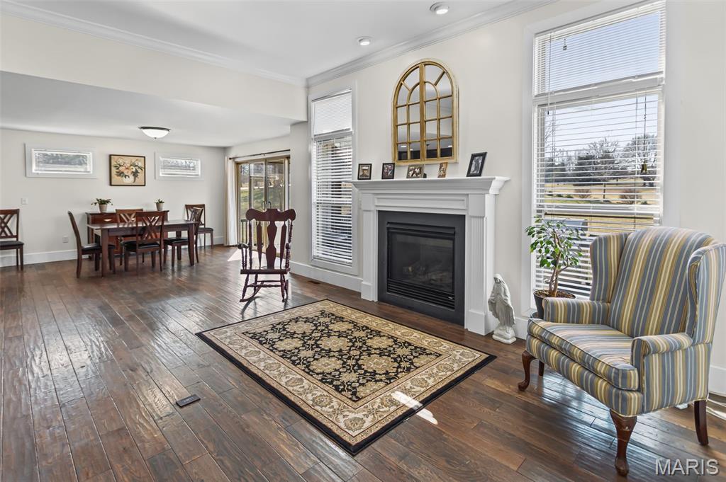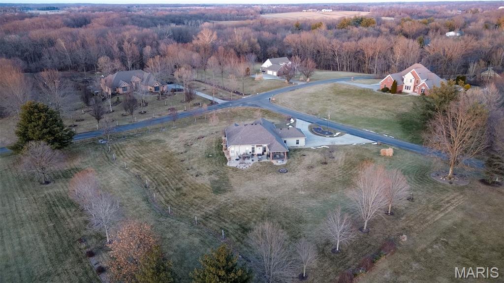Custom-built brick ranch with stone accents on 2.2 acres in a quiet subdivision, offering over 3,000 sq ft of finished living space. This elegant home features an open-concept design with hand-scraped solid oak flooring, crown molding, and quality fixtures throughout. The living room showcases a direct-vent gas fireplace, while the chef’s kitchen includes solid surface countertops, stainless appliances, beverage cooler, pantry, and large island with bar seating. The primary suite offers a walk-in closet and spa-like bath with double vanity and separate shower. Main-level laundry adds convenience. The recently finished lower level provides approximately 1,100 sq ft with a spacious family room, additional bedroom, and full bath—ideal for guests or extended living. Enjoy peaceful views from the screened-in porch overlooking beautifully landscaped grounds. Additional highlights include a 3-car garage, circular drive, workshop/storage space, and mature trees. Luxury, privacy, and space combine in this exceptional property.
