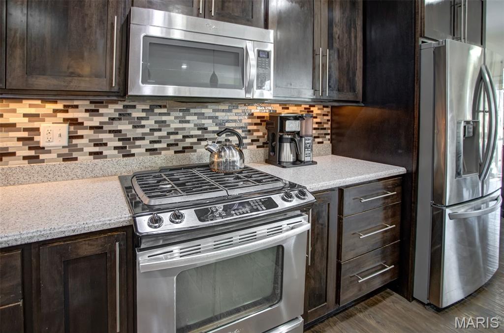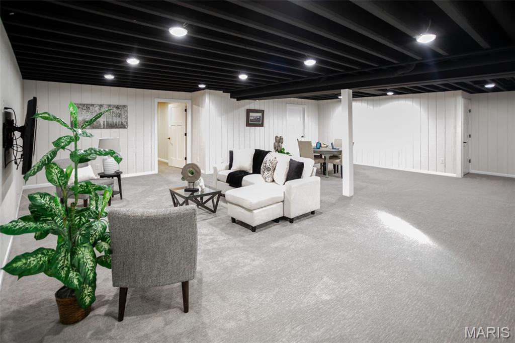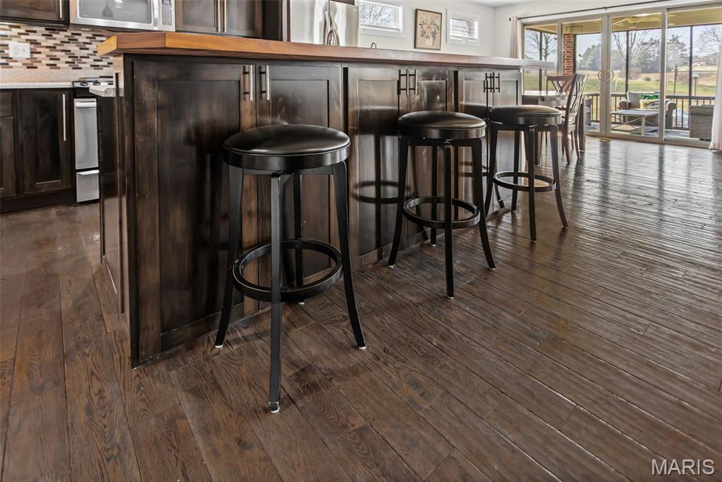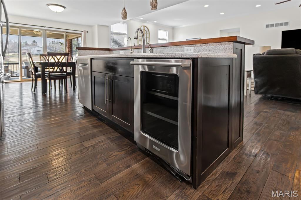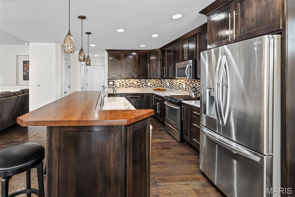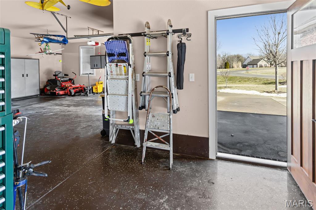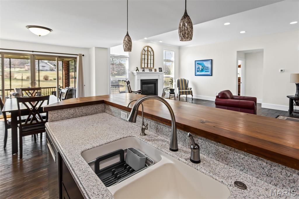 Custom-built brick ranch with stone accents on 2.2 acres in a quiet subdivision, offering over 3,000 sq ft of finished living space. This elegant home features an open-concept design with hand-scraped solid oak flooring, crown molding, and quality fixtures throughout. The living room showcases a direct-vent gas fireplace, while the chef’s kitchen includes solid surface countertops, stainless appliances, beverage cooler, pantry, and large island with bar seating. The primary suite offers a walk-in closet and spa-like bath with double vanity and separate shower. Main-level laundry adds convenience. The recently finished lower level provides approximately 1,100 sq ft with a spacious family room, additional bedroom, and full bath—ideal for guests or extended living. Enjoy peaceful views from the screened-in porch overlooking beautifully landscaped grounds. Additional highlights include a 3-car garage, circular drive, workshop/storage space, and mature trees. Luxury, privacy, and space combine in this exceptional property.