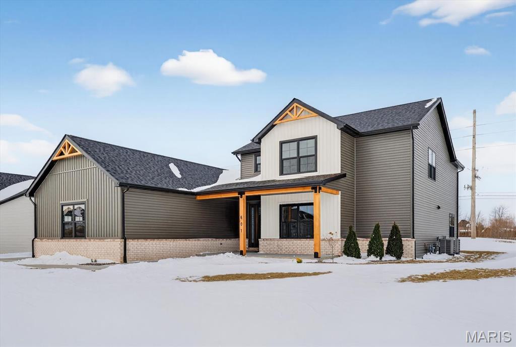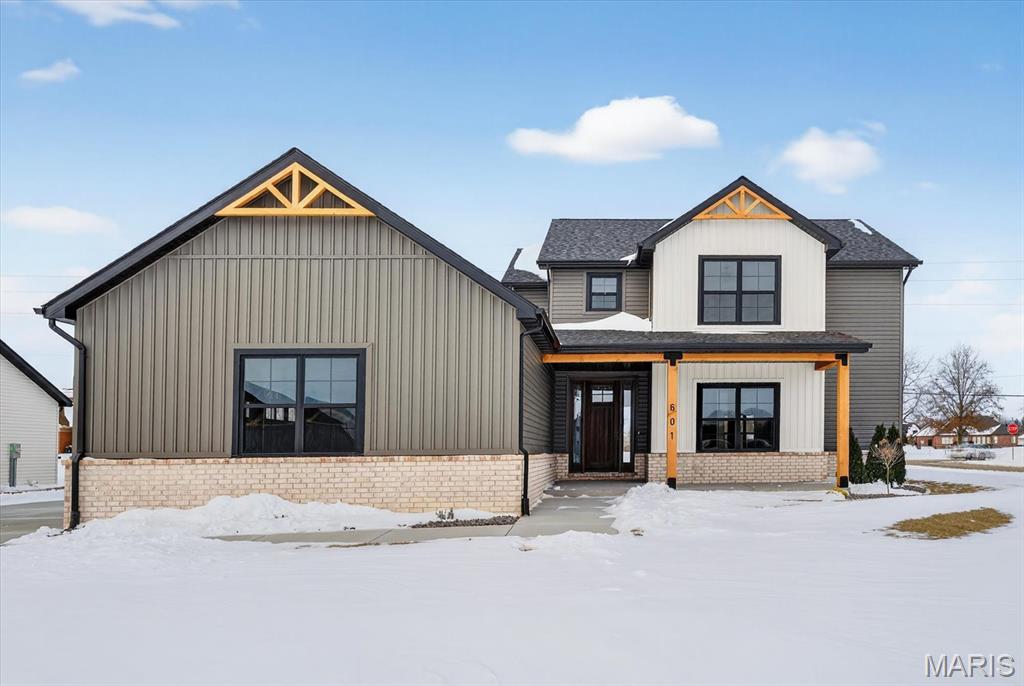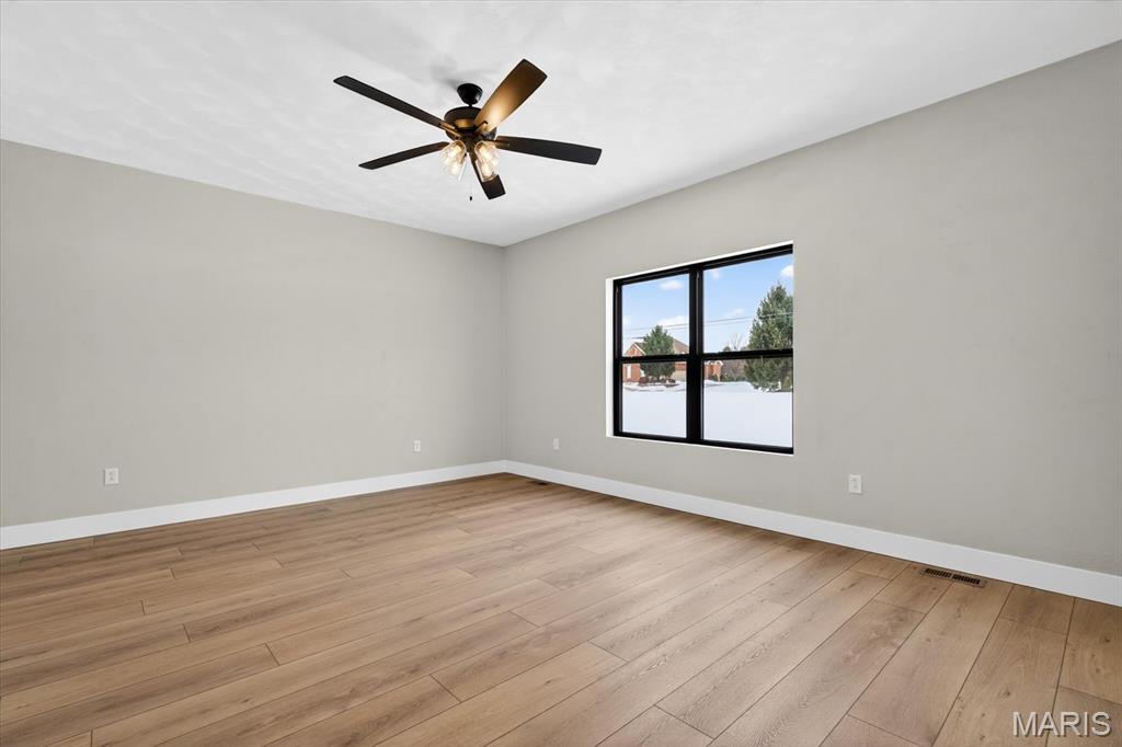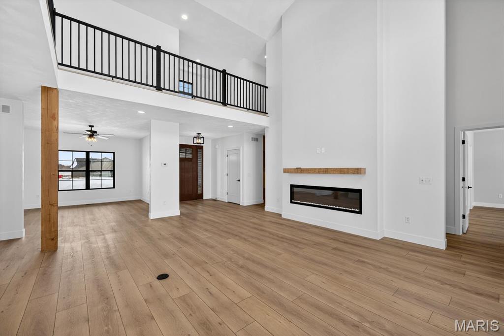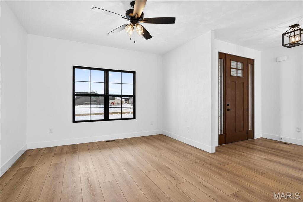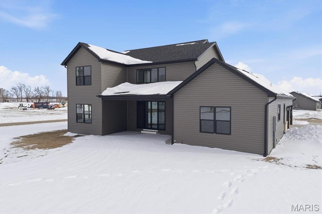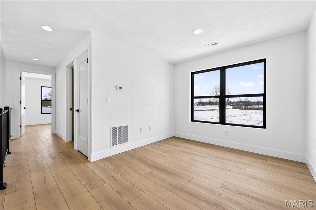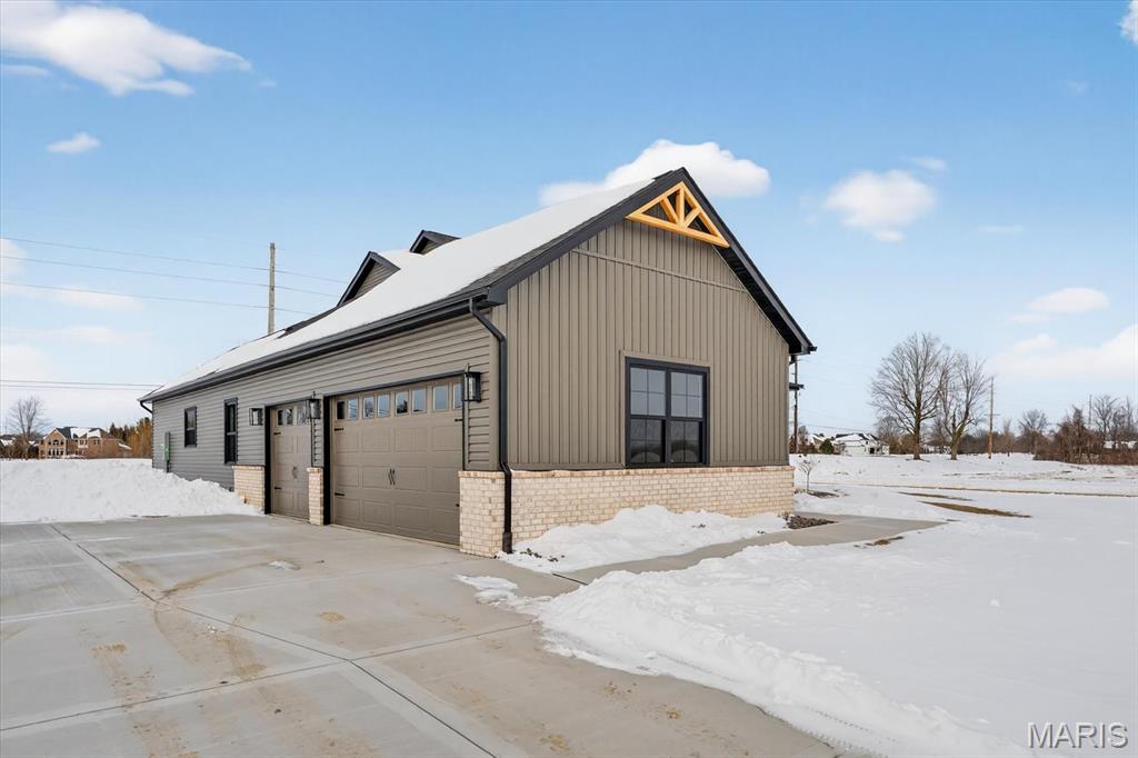 Introducing the first OAK floor plan with a stunning side-load 3-car garage—built by MJ Holland! This custom home impresses with 2x6 exterior framing, solid core doors, wide plank flooring, zoned HVAC, commercial-grade windows, and ceilings soaring 9 ft or higher. The main level features a spacious living room with a 22-ft ceiling and gas fireplace, a flexible bonus room (perfect for an office or formal dining), a mudroom leading to a separate laundry, and a chef’s kitchen with quartz counters and commercial cabinetry. The luxurious main-floor primary suite includes a soaking tub and separate shower. Upstairs offers two oversized bedrooms, a full bath, and two bonus areas overlooking the main level. The lower level includes an unfinished basement with two egress windows, bath rough-ins, and potential for 1,320± sq ft of additional living space. The new side-load garage boasts cathedral ceilings and ample room. Located in the sought-after Augusta Greens and O'Fallon Schools.