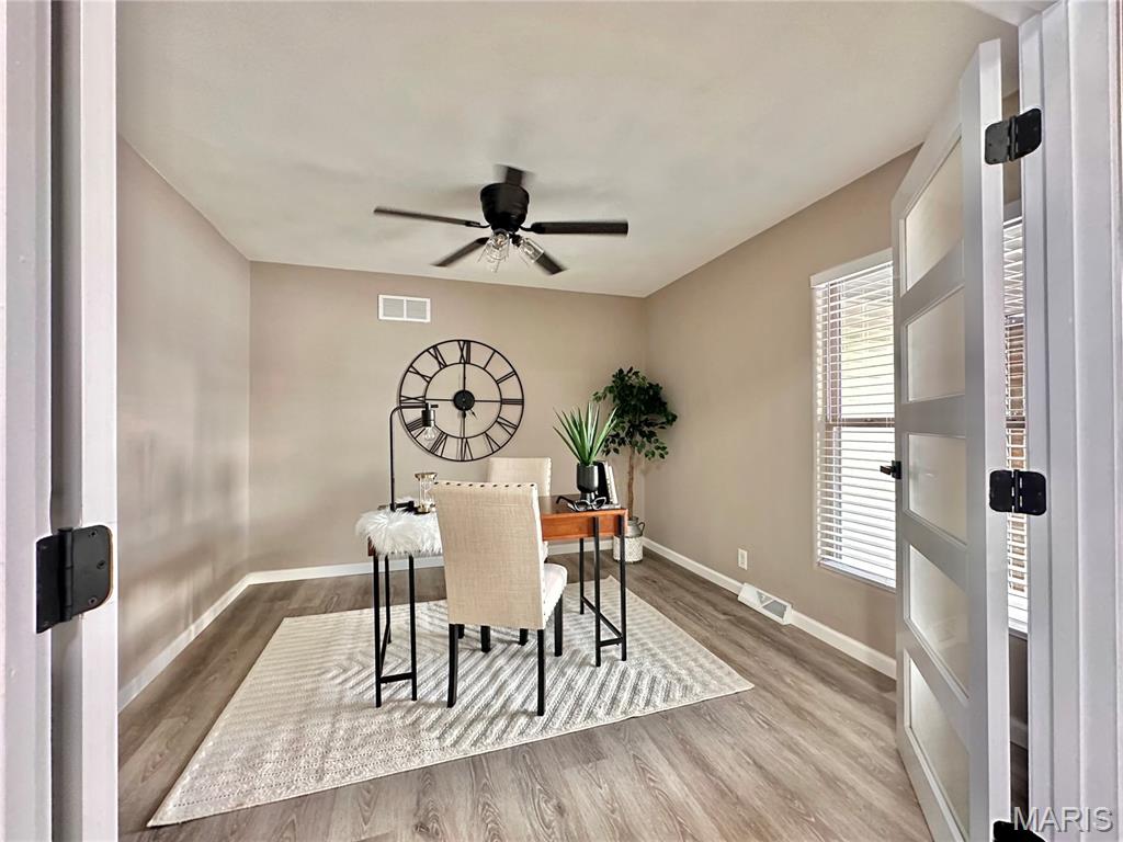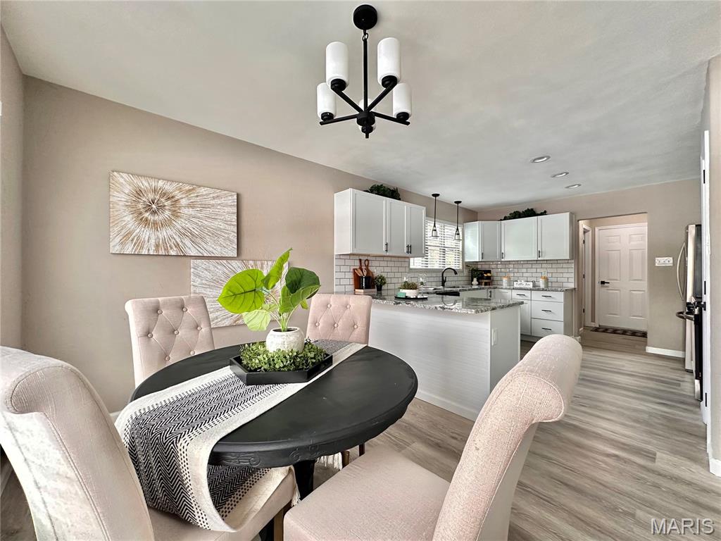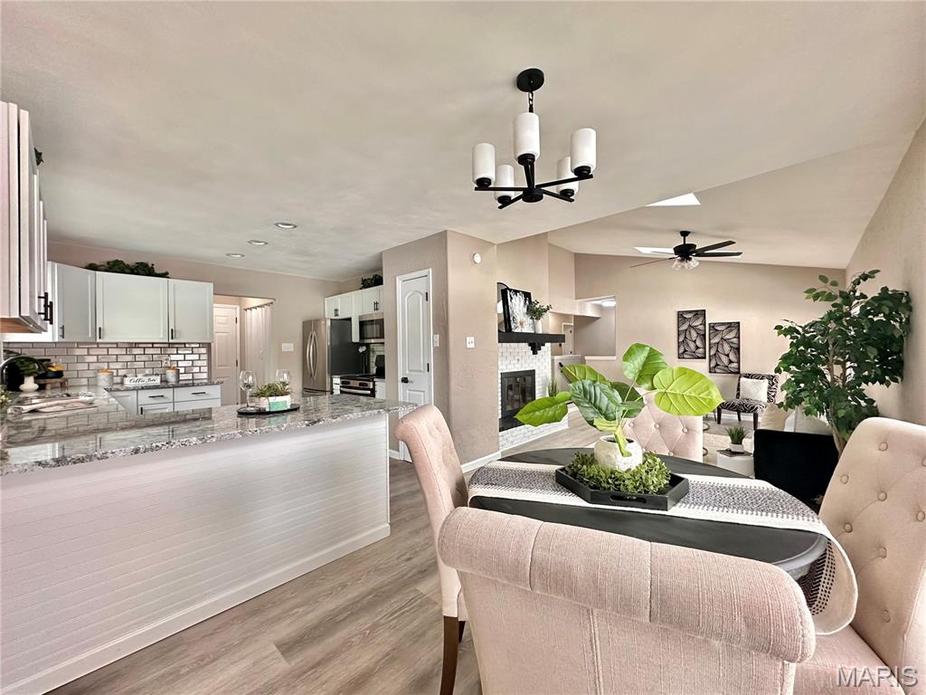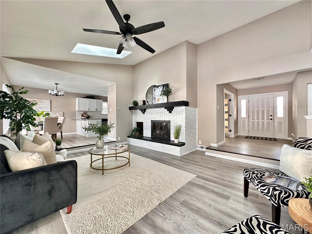 Experience the perfect blend of modern luxury and architectural character in this stunning 4-bedroom, 3-bathroom home in Collinwood Subdivision. Every inch of this property has been meticulously transformed to offer a "like-brand-new" living experience inside and out. The heart of the home is a dramatic sunken living room featuring soaring vaulted ceilings, skylights that drench the space in natural light and a cozy fireplace. Flow effortlessly into the designer eat-in kitchen, boasting sleek solid suface countertops, a breakfast bar, pantry, stainless steel appliances, all-new lighting and cabinetry. Main level Laundry. High-end luxury vinyl plank flooring carries you throughout the entire main level. Retreat to the primary suite, which offers private access to the covered patio, a walk-in closet and a pristine full bath. The finished basement doubles your living space, featuring a secondary family room with its own fireplace, a massive recreation area and a generous storage room. Complete with an oversized 2-car side-load garage and a passed Collinsville occupancy inspection, this home is truly move-in ready. What are you waiting for?