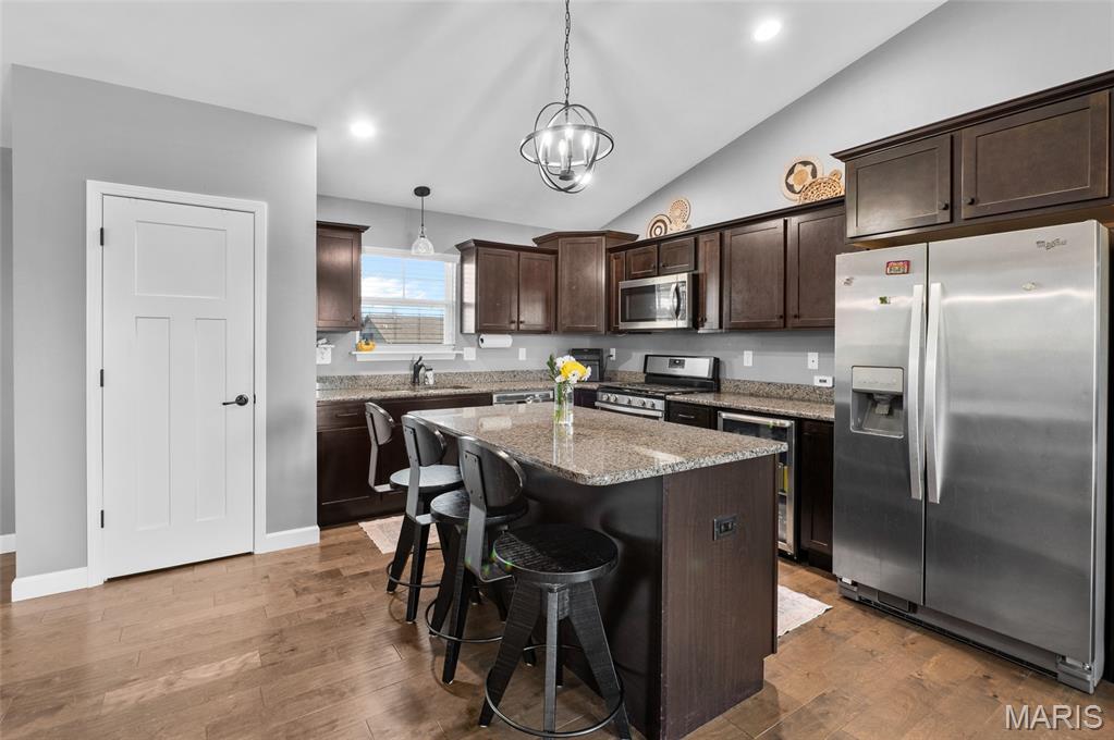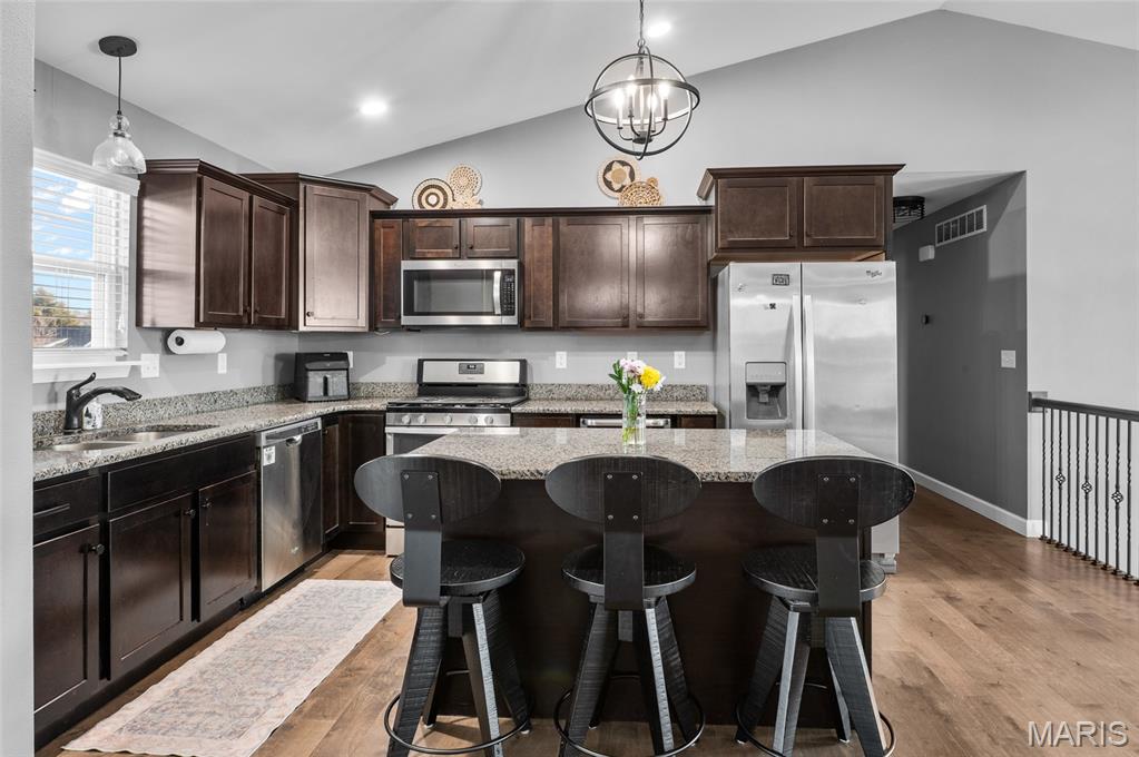 Beautiful split foyer plan with walkout basement including a covered deck plumbed for gas grill and lower level patio! Home features 4 bedrooms including a master suite with private full bath and dual vanity. Main floor bedrooms share another full bath. Large kitchen includes eat-in area plus loads of cabinets with island, granite counter tops, stainless appliances plus drink cooler. Lower level features a family room and 4th bedroom or office + 1/2 bathroom. Baths and laundry are ceramic tiled & hardwood in kitchen/living room & hallway. Insulated garage/doors. Great location near park & school so make your appointment to see it today, this beautiful like new home won't last long!