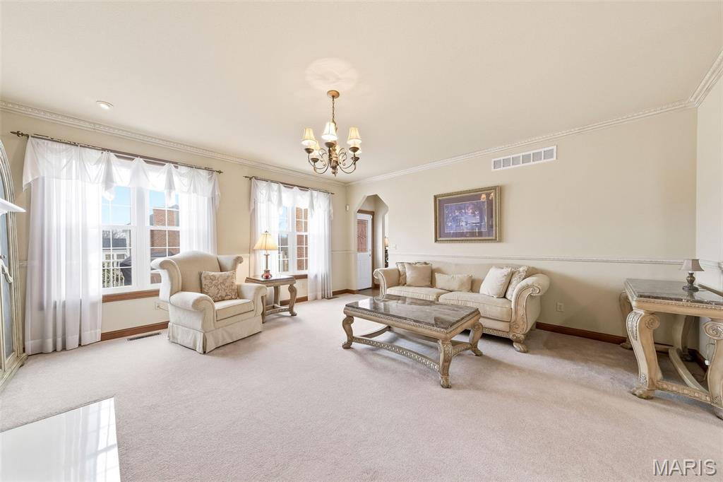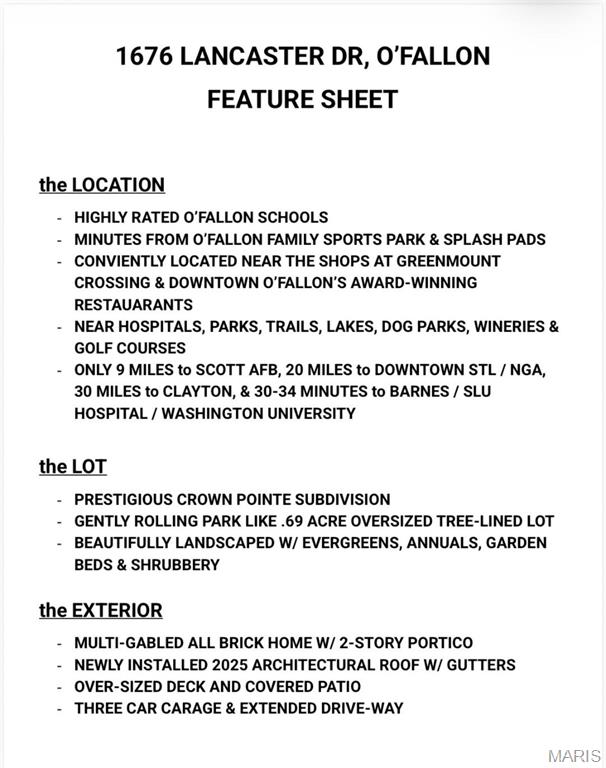 Set within the prestigious Crown Pointe subdivision, this custom-built, one-owner brick estate presents a rare opportunity to acquire scale, craftsmanship, and setting in one of O’Fallon’s most established neighborhoods. Positioned on an oversized, gently rolling, professionally landscaped lot framed by some trees, the home offers a suburban sprawl without compromise—minutes from schools, parks, dining, and regional access points. Spanning over 7,500 square feet, the residence is defined by volume and architectural presence. A grand two-story foyer, dual staircases, and a series of vaulted, tray, and coffered ceilings establish a sense of arrival, while rich hardwoods, custom millwork, and thoughtfully updated lighting carry throughout. Multiple living areas and sun-filled gathering spaces create effortless flow for both intimate living and large-scale entertaining. The kitchen anchors the home with granite surfaces, professional-grade appliances, a center island, walk-in pantry, and butler’s pantry—opening seamlessly to an oversized deck and covered patio overlooking the park-like grounds. Indoors and out, the layout was designed to host with ease. The main-level primary suite is a true retreat, offering generous proportions, dual walk-in closets, a lounge area, and a spa-inspired bath. Additional bedrooms feature direct bath access, providing comfort and privacy throughout. The walk-out lower level extends the living experience with an in-law suite, wine bar, theater, fitness room, workshop space, and abundant storage—ideal for multi-generational living or elevated entertaining. Enhanced with a newly installed architectural roof and gutters in 2025, this residence reflects meticulous ownership and enduring quality. Homes of this caliber in Crown Point are seldom available. A commanding offering. A lasting impression. Come tour today.