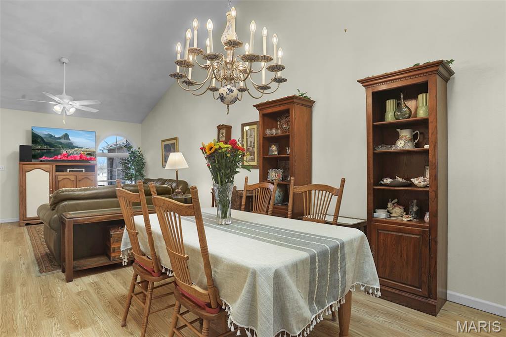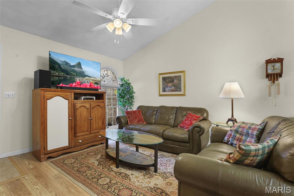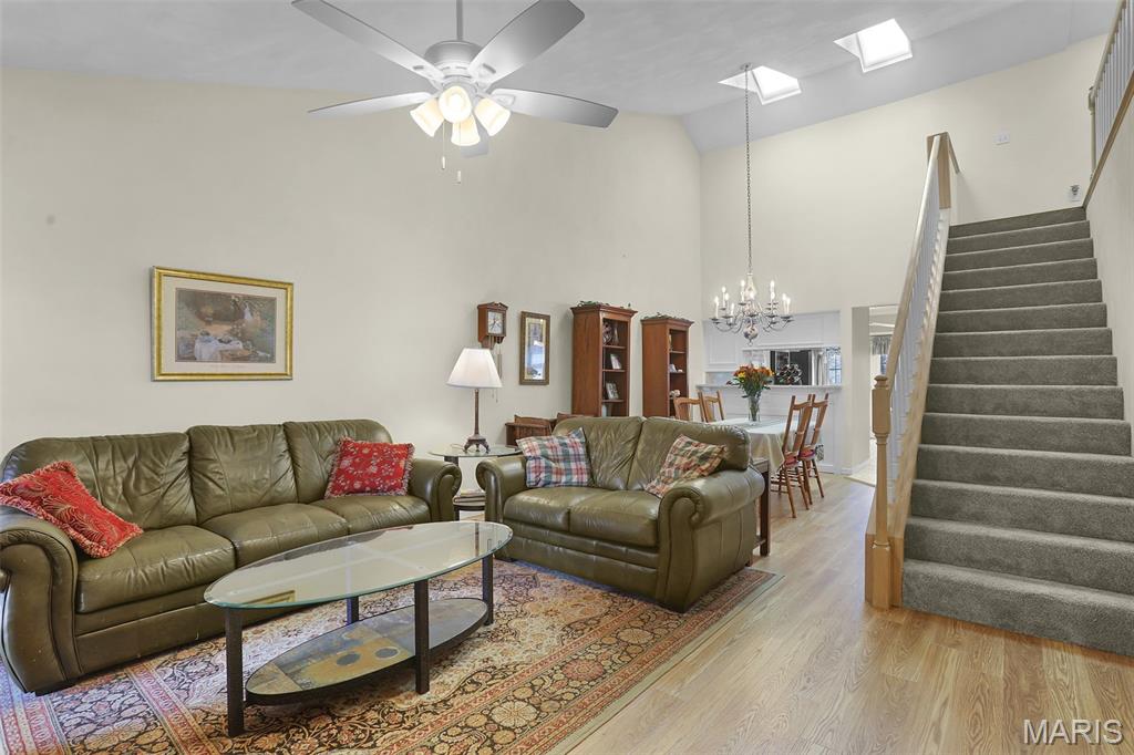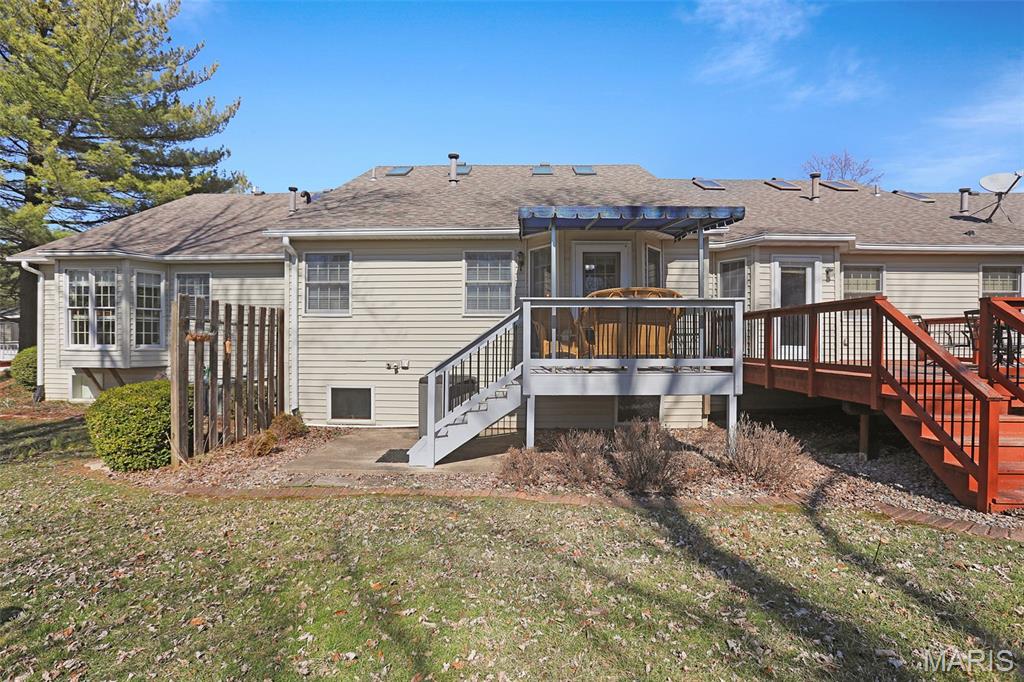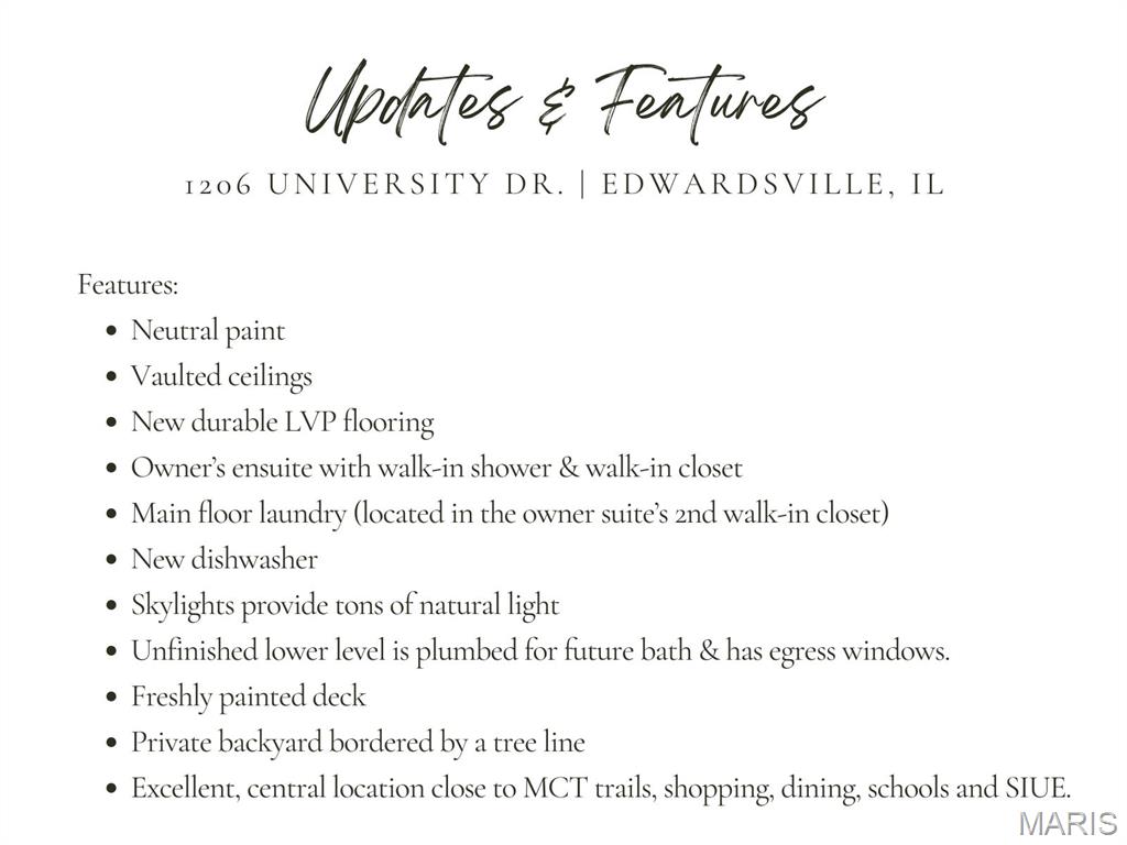 Experience effortless living in this beautifully updated condo featuring newer, durable LVP flooring and an abundance of natural light throughout. The inviting, vaulted living and dining area showcases soaring ceilings, skylights, and a grand open staircase that leads to a versatile loft, perfect for a home office, guest space, or cozy retreat. The eat-in kitchen boasts elegant stone countertops, stainless steel appliances, ample cabinetry and a charming bay window, with direct access to a covered deck and patio ideal for relaxing or entertaining in the tree-lined backyard. The split-bedroom floor plan offers exceptional privacy, highlighted by a spacious owner’s suite with dual closets (including a walk-in with custom built-ins and a second closet with convenient main-floor laundry) that leads to the ensuite with solid-surface walk-in shower & dual sinks. A 2nd bedroom, ¾ bath located off the main living area, plus neutral finishes throughout create a move-in-ready feel. The unfinished basement provides extensive storage or future living space, complete with egress windows and plumbing for a bath, offering endless possibilities. Centrally located just minutes from shopping, dining, bike trails, SIUE, and I-270.