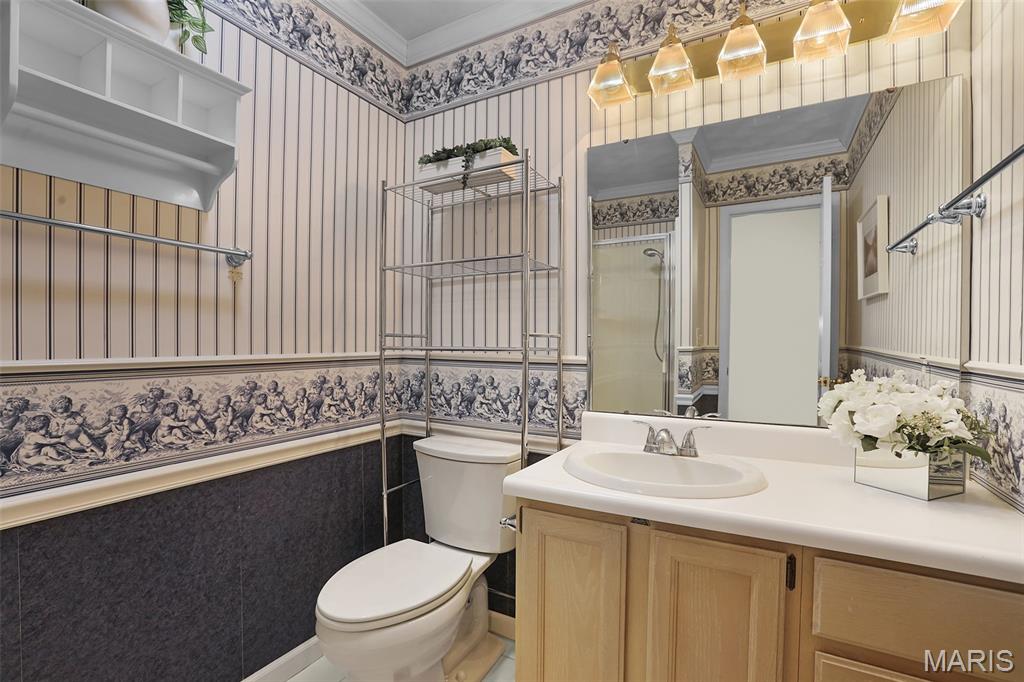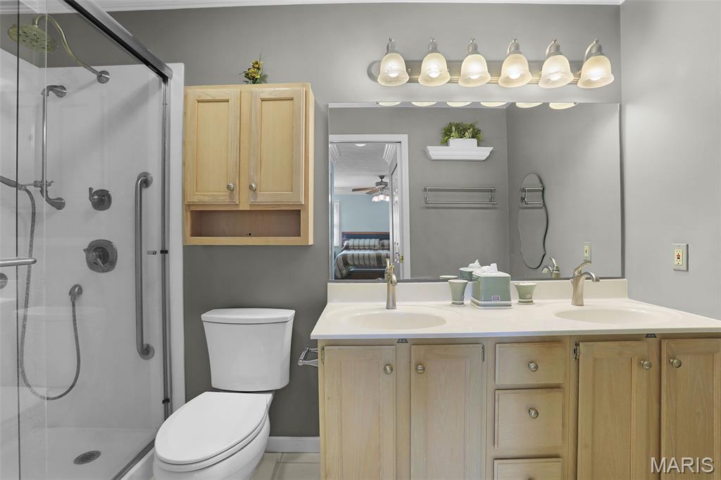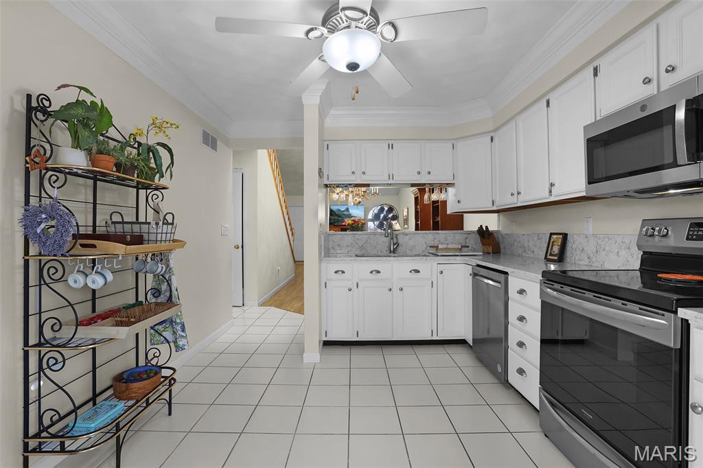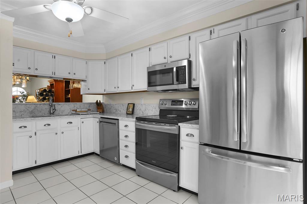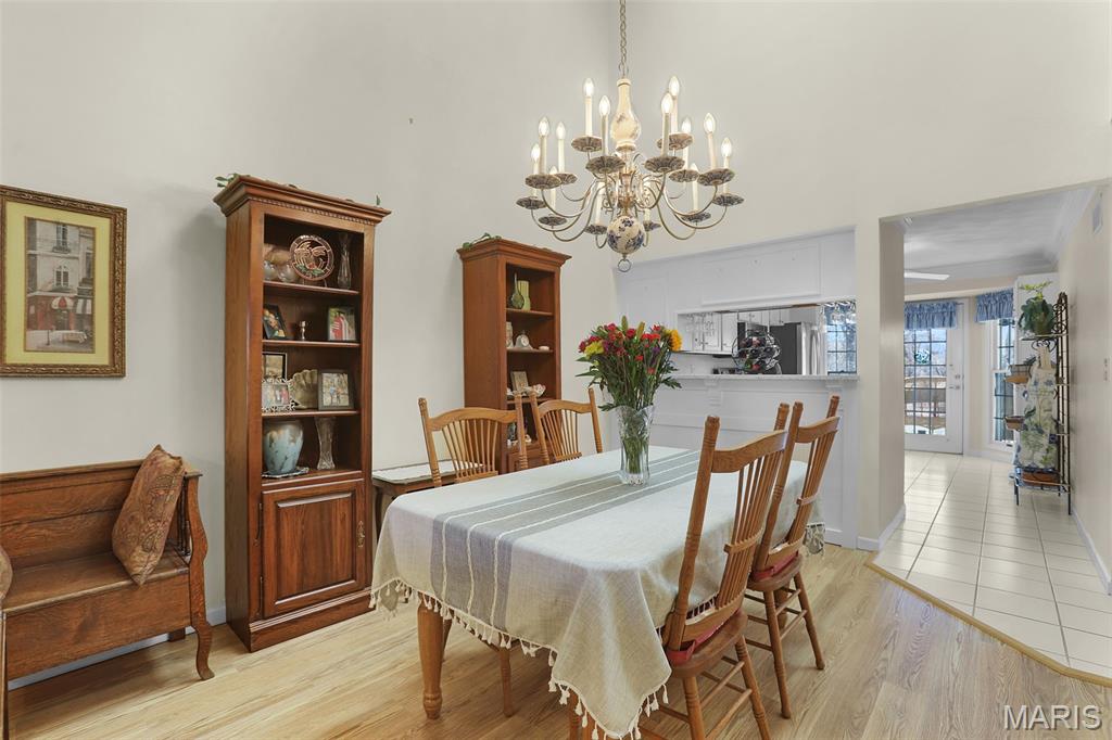 Experience effortless living in this beautifully updated condo featuring newer, durable LVP flooring and an abundance of natural light throughout. The inviting, vaulted living and dining area showcases soaring ceilings, skylights, and a grand open staircase that leads to a versatile loft, perfect for a home office, guest space, or cozy retreat. The eat-in kitchen boasts elegant stone countertops, stainless steel appliances, ample cabinetry and a charming bay window, with direct access to a covered deck and patio ideal for relaxing or entertaining in the tree-lined backyard. The split-bedroom floor plan offers exceptional privacy, highlighted by a spacious owner’s suite with dual closets (including a walk-in with custom built-ins and a second closet with convenient main-floor laundry) that leads to the ensuite with solid-surface walk-in shower & dual sinks. A 2nd bedroom, ¾ bath located off the main living area, plus neutral finishes throughout create a move-in-ready feel. The unfinished basement provides extensive storage or future living space, complete with egress windows and plumbing for a bath, offering endless possibilities. Centrally located just minutes from shopping, dining, bike trails, SIUE, and I-270.