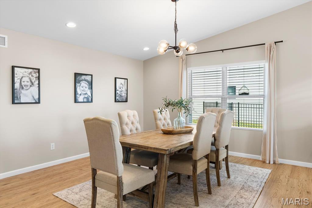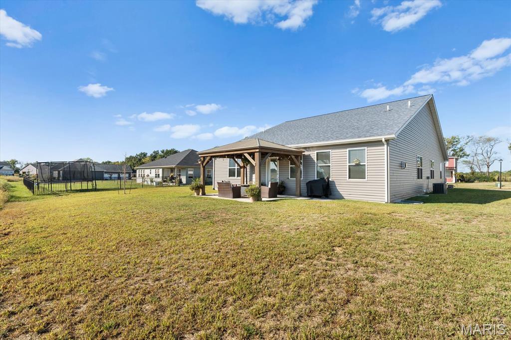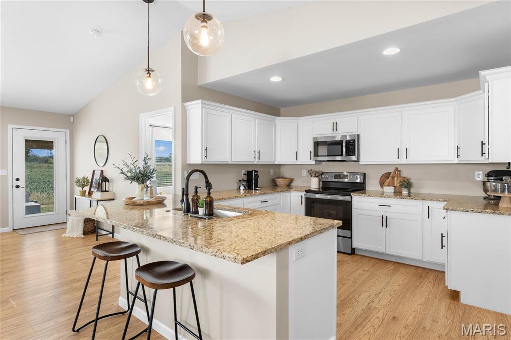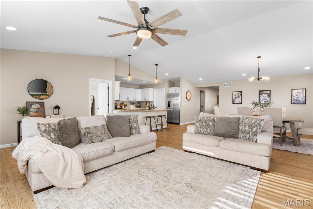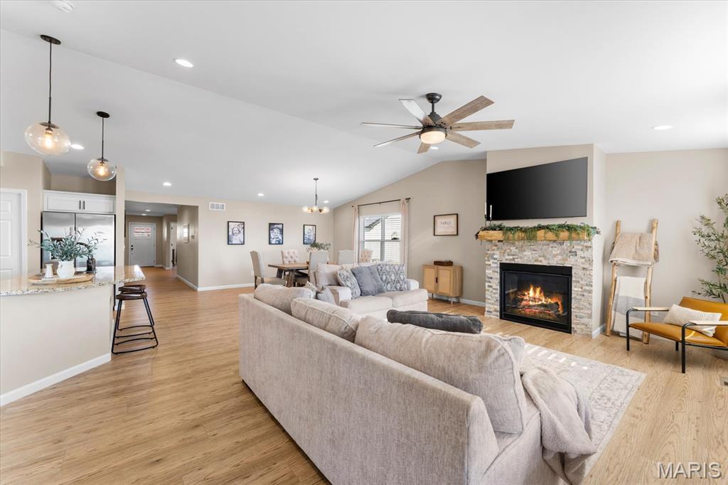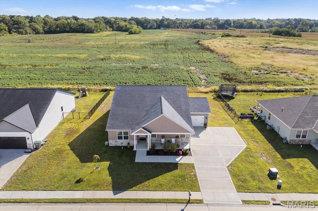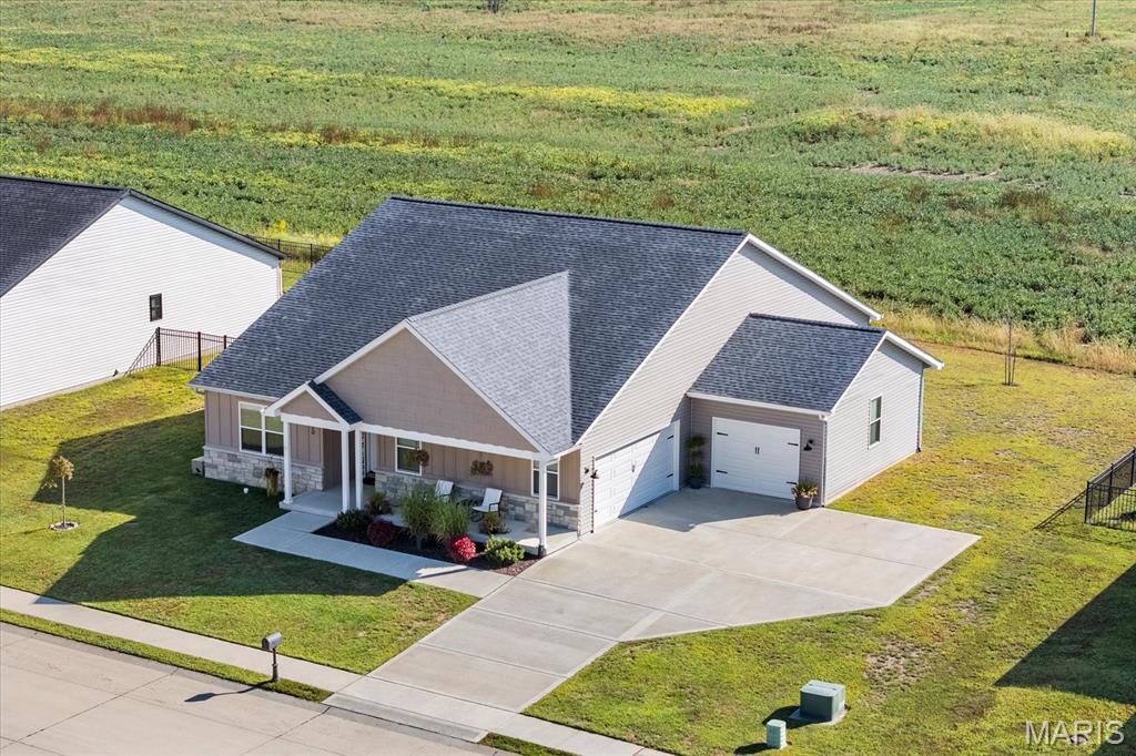 Well-maintained ranch in Meadow Pines Estates with a finished basement and 3-car garage. The main level features an open floor plan with vaulted ceilings, a spacious living room with gas fireplace, and a kitchen with granite countertops, stainless steel appliances, and a walk-in pantry. The primary suite includes a walk-in closet and bath with double vanity. On the opposite side of the home are two additional bedrooms and a full hall bath. A generous mudroom with direct access to the laundry room connects to the garage entry. The finished basement offers a large recreation room, a bedroom with egress window, and a full bath, along with a large unfinished space ideal for storage or future expansion. Outside, enjoy the pergola and peaceful country setting, just minutes from shopping, dining, and city conveniences.